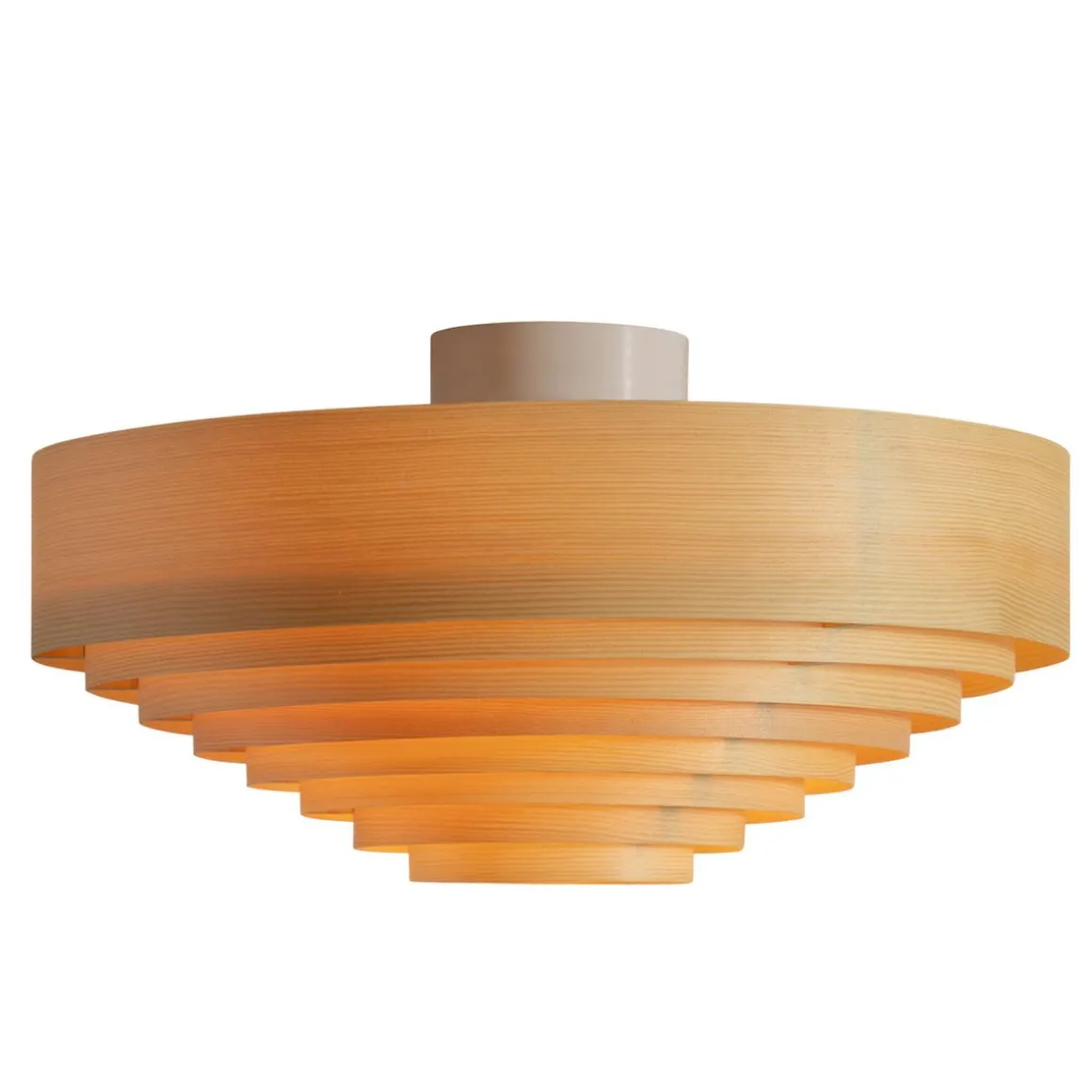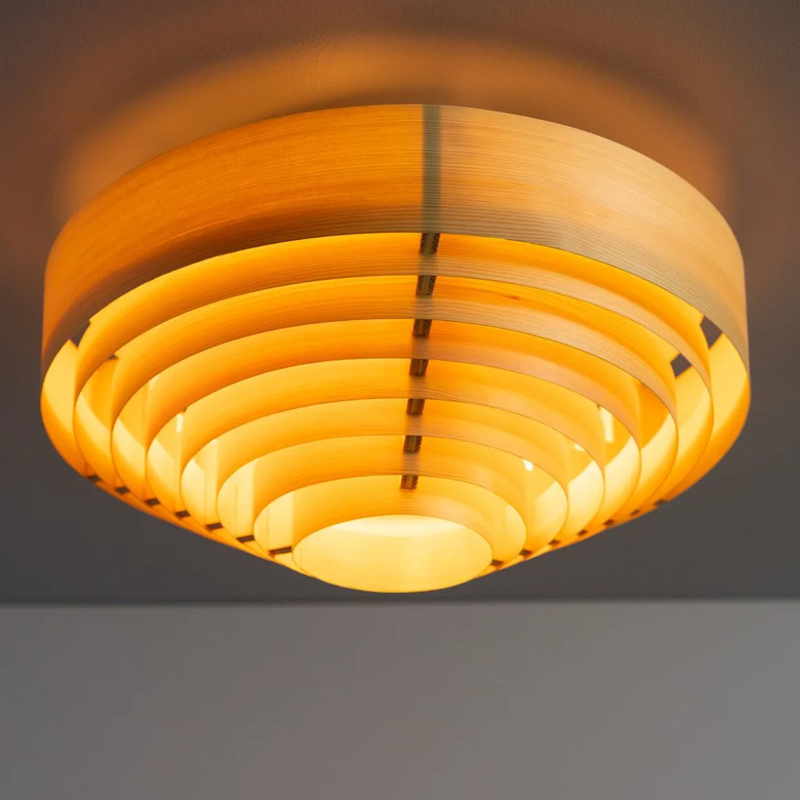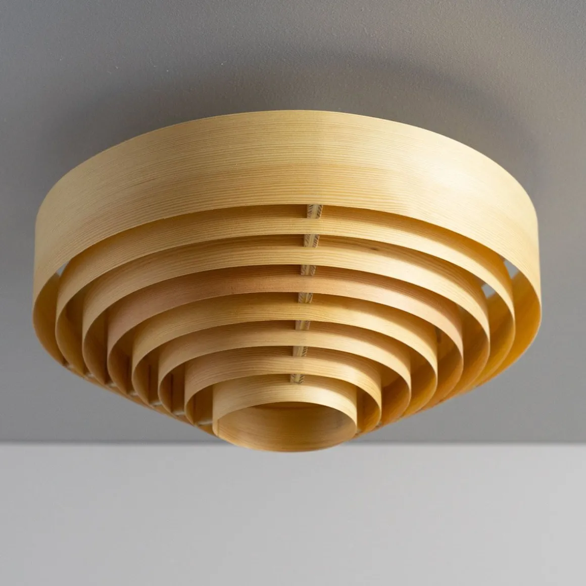 1005 Hans de Vaarnii par Hans-Agne Jakobsson. Les créations en placage de pin de Hans-Agne Jakobsson sont le résultat d’une recherche approfondie sur la nature du placage de pin, en particulier en relation avec la lumière. Vaarnii a repensé ces designs classiques pour l’espace contemporain. Les plafonniers Hans sont visuellement audacieux mais physiquement légers, de taille généreuse et émettent une lumière attrayante filtrée par le pin.Les plafonniers Hans sont disponibles en deux tailles ; 42 cm de diamètre et 55 cm de diamètre, et présentent les cercles concentriques graphiques en contreplaqué qui rendent cette série distincte.