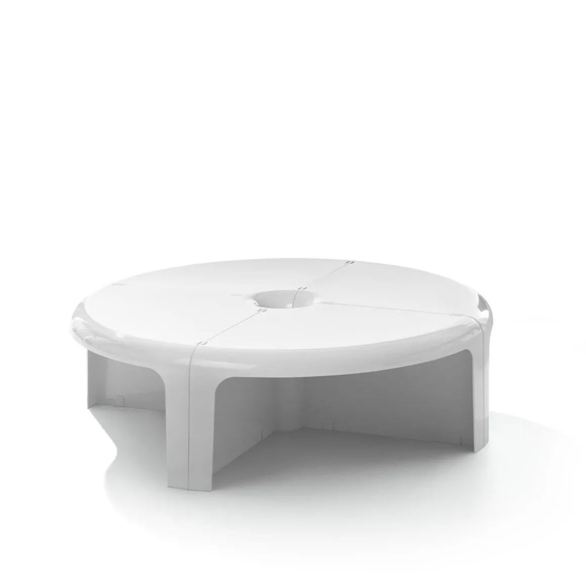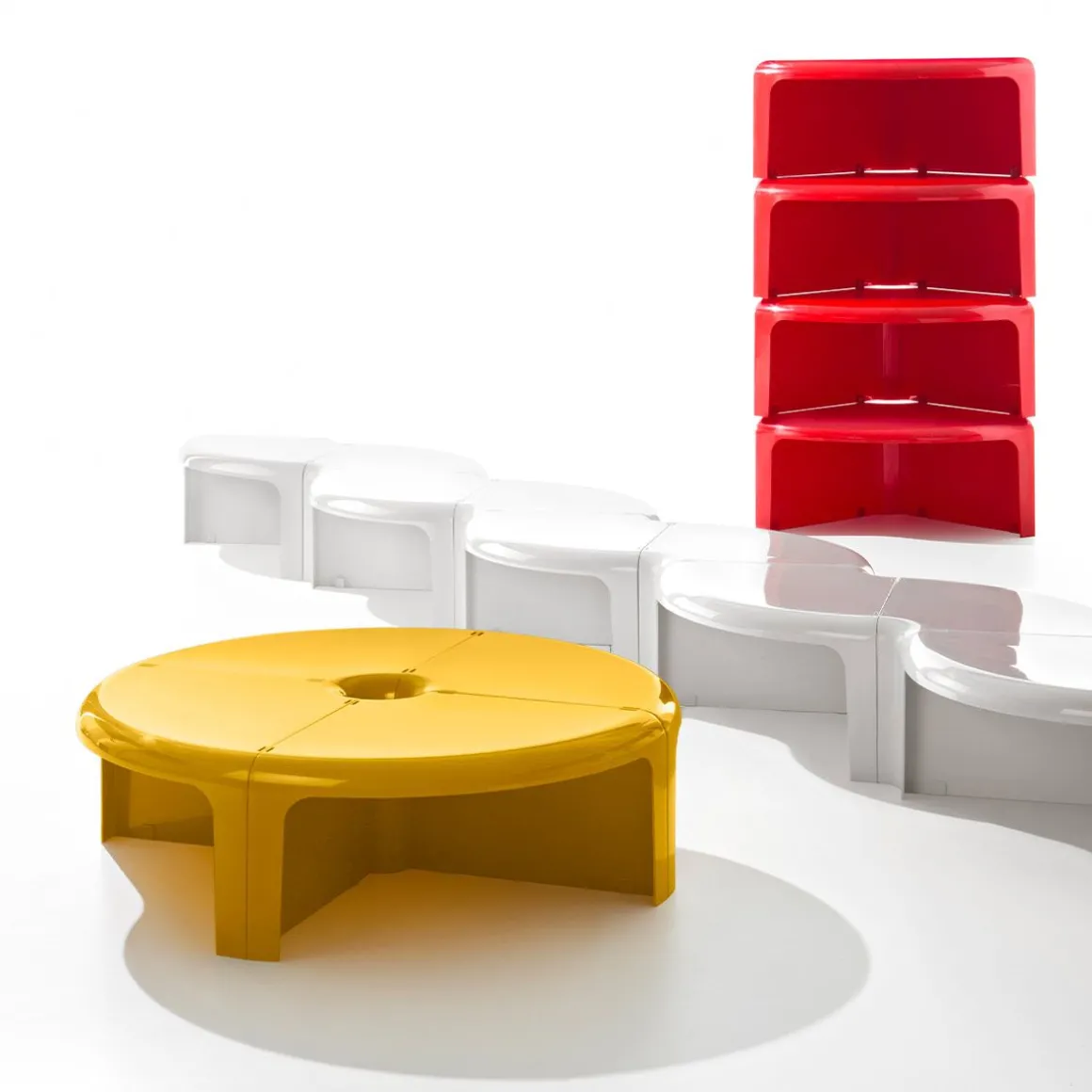De la planche à dessin de Rodolfo Bonetto en 1969, 4/4 représente le produit multifonctionnel typique qui peut facilement s’adapter à l’environnement et à l’utilisation, permettant ainsi des interprétations continuellement nouvelles des espaces dans lesquels nous vivons. Lignes courbes, plastique brillant et emboîtement facile transforment les quatre éléments qui la composent en une table basse ronde, une table serpentine, une bibliothèque modulable ou encore une étagère d’angle. Fabriqué en plastique ABS moulé par injection, 4/4 est une solution astucieuse pour la maison, le bureau ou les salles d’attente. Pour les amateurs de ce genre de genre, il apparaît avec Sean Connery dans le film 007 « Diamonds are Forever ».