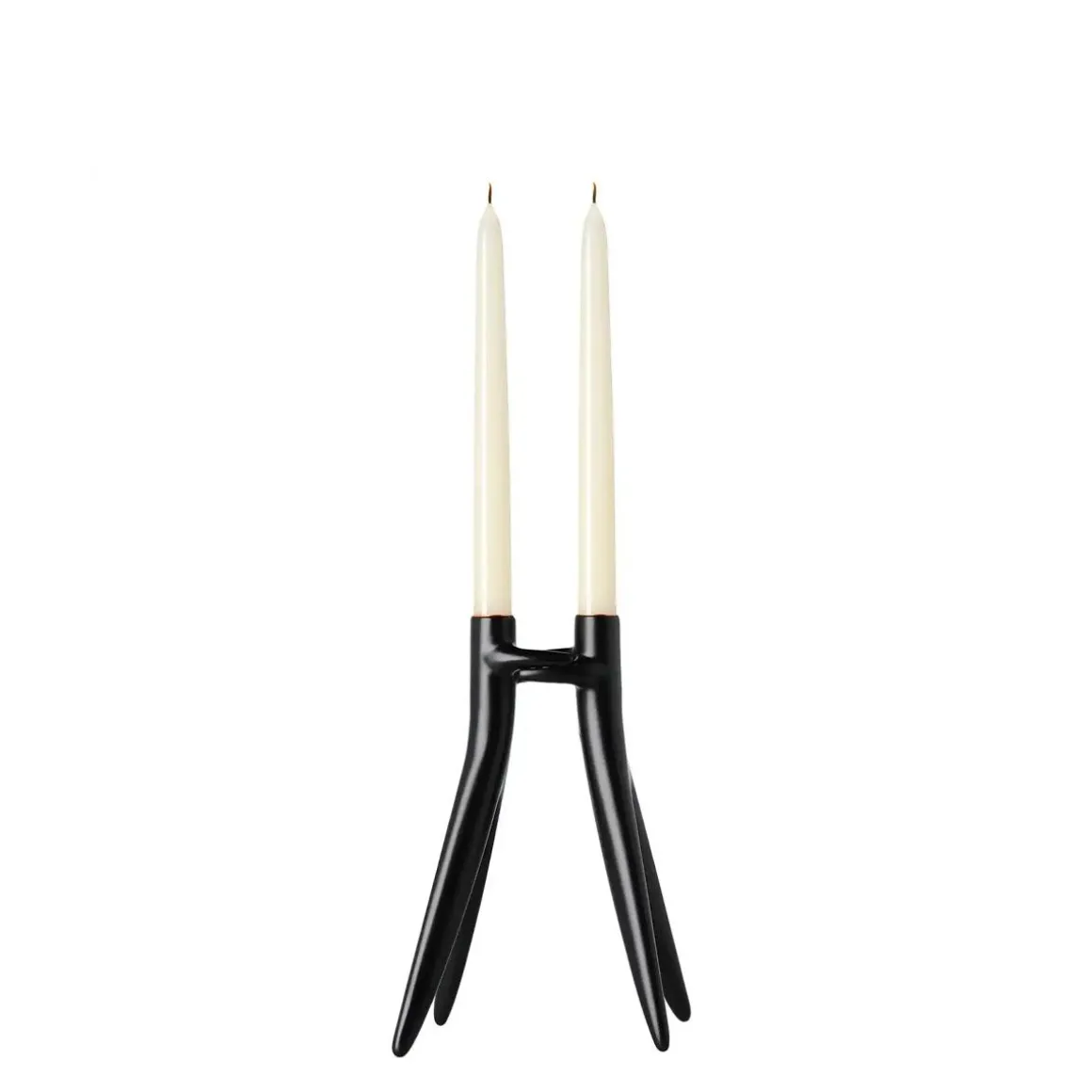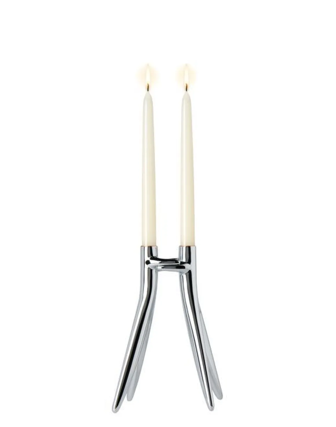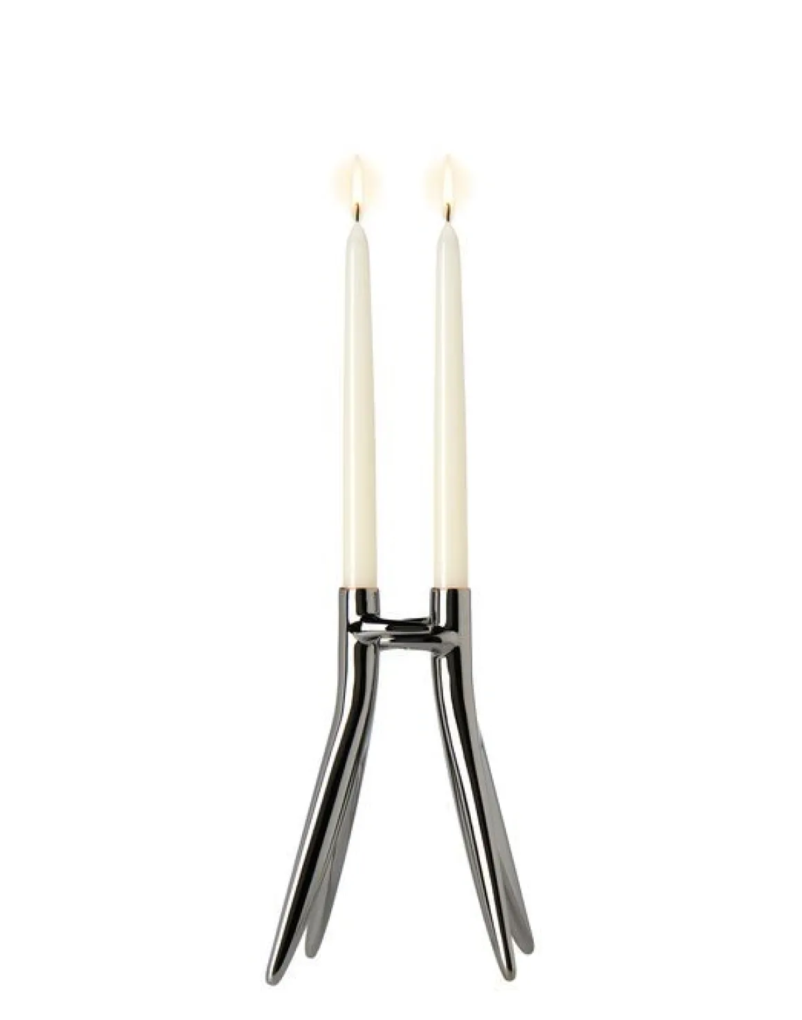 Abbracciaio représente la fusion de deux silhouettes en aluminium qui, mises l’une en face de l’autre, se transforment en une étreinte amoureuse. Les deux structures sont accrochées de manière à garantir la stabilité de l’objet. Élégant et poétique, Abbracciaio est prévu pour deux bougies. Il est réalisé en aluminium poli et décliné dans différentes couleurs.