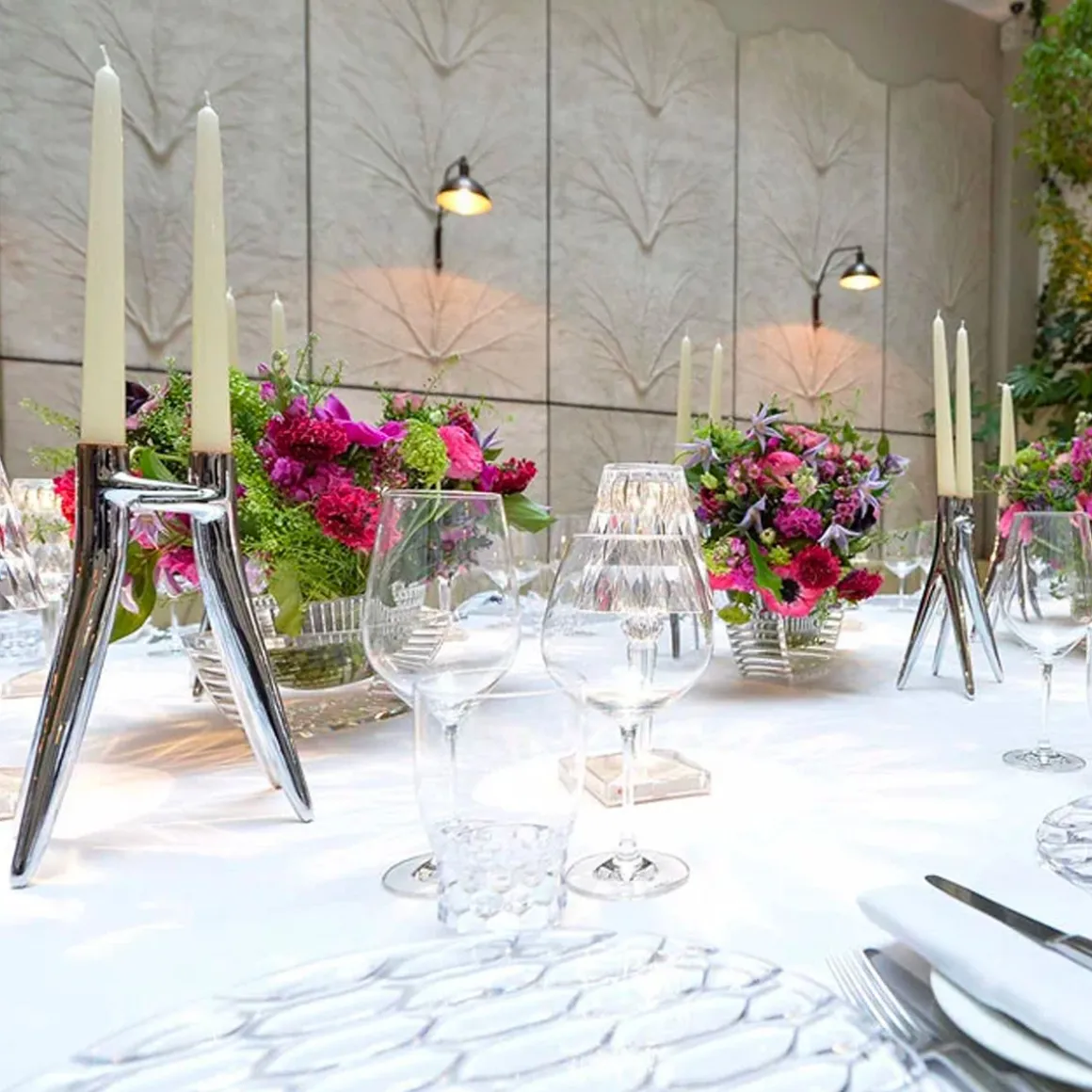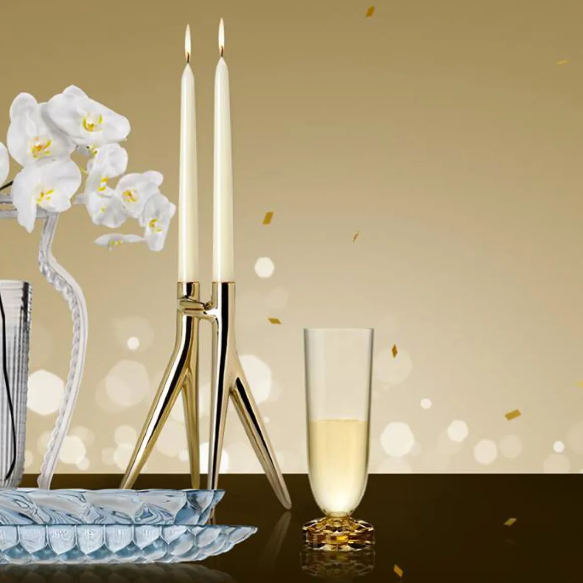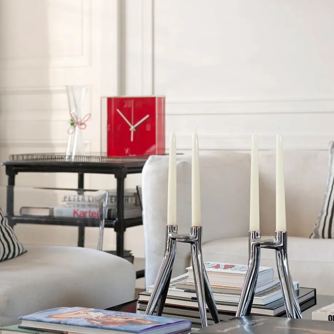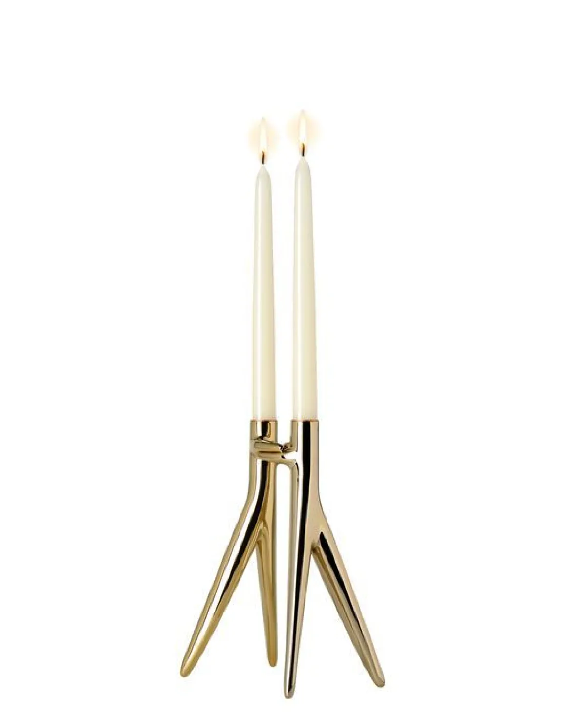 Abbracciaio représente la fusion de deux silhouettes en aluminium qui, mises l’une en face de l’autre, se transforment en une étreinte amoureuse. Les deux structures sont accrochées de manière à garantir la stabilité de l’objet. Élégant et poétique, Abbracciaio est prévu pour deux bougies. Il est réalisé en aluminium poli et décliné dans différentes couleurs.