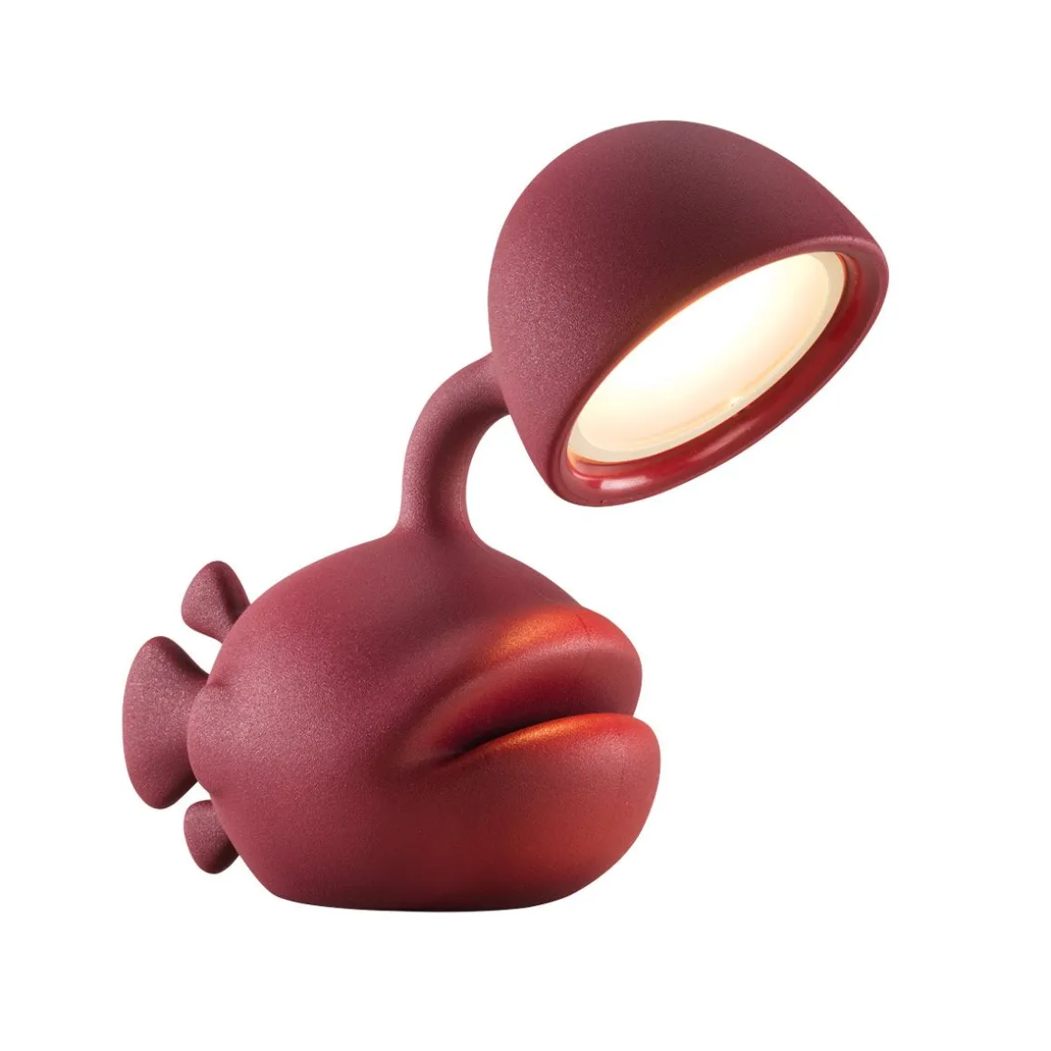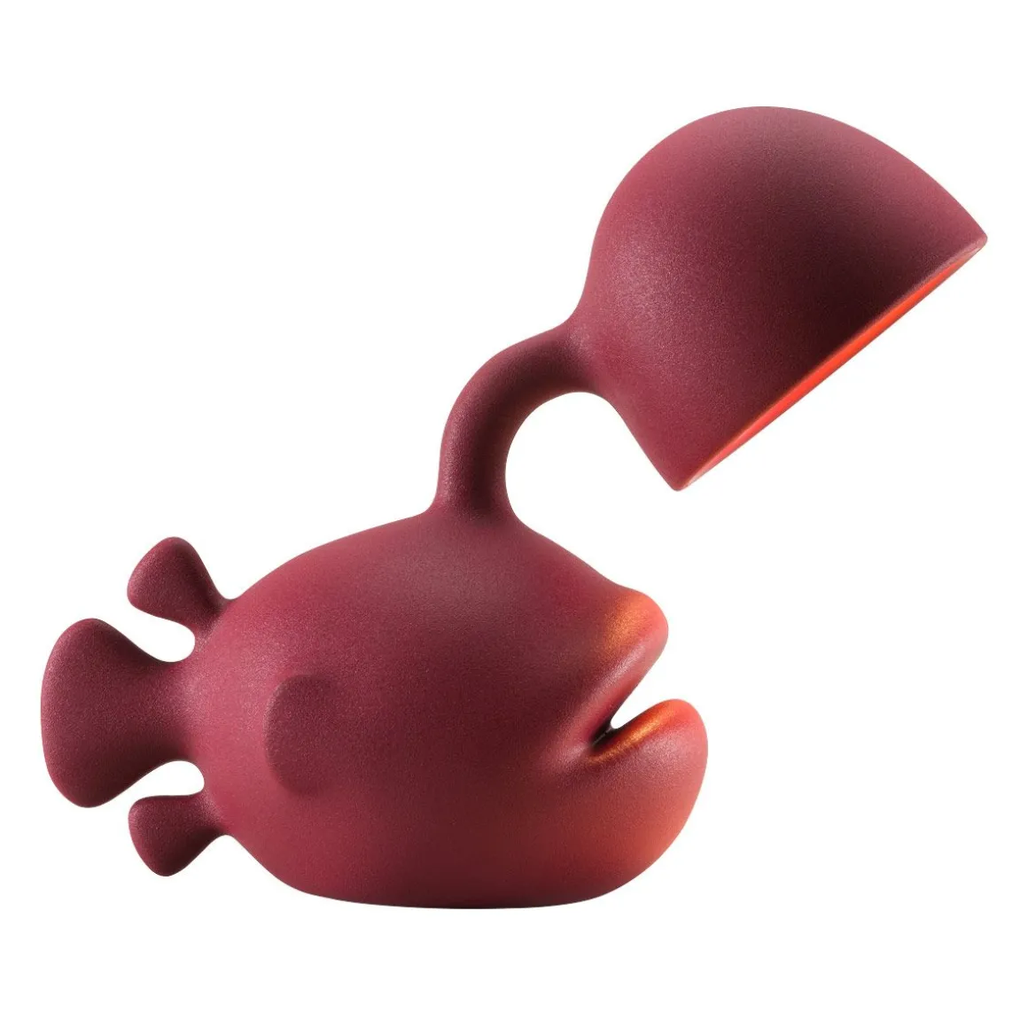 Abyss de Qeeboo par Dai Sugasawa. Abyss est une audacieuse lampe de table en forme de poisson en polyéthylène recyclable. Inspiré de la baudroie nageant dans les eaux profondes avec sa canne lumineuse intégrée, Abyss s’amarrera directement à votre maison en apportant de la lumière sur votre table à manger ou votre table de chevet. Disponible en différentes couleurs.