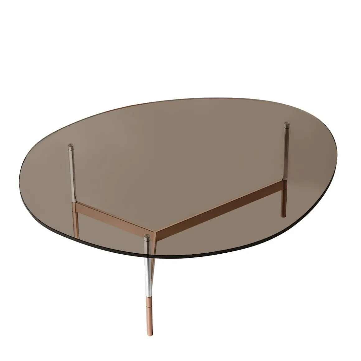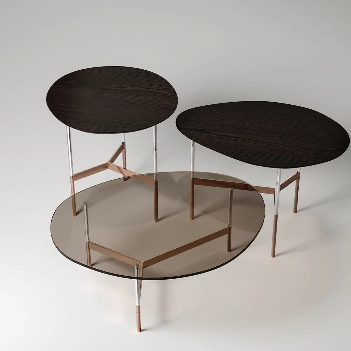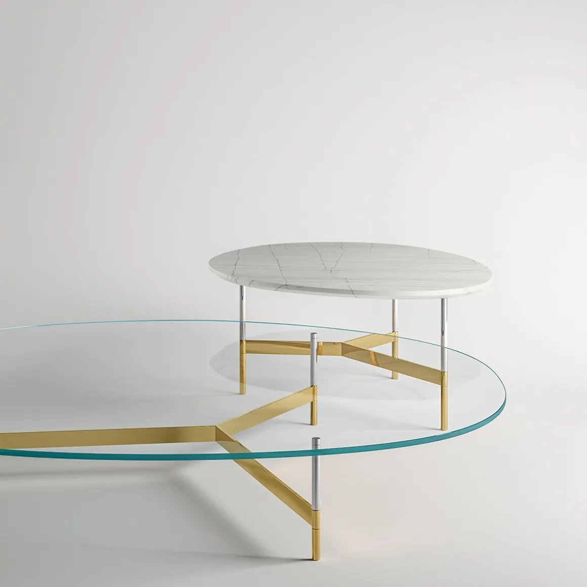Collection 2020de tables basses et tables d’appoint, structure métallique minimaliste aux finitions contrastées. Disponible en différentes dimensions et hauteurs, plateau de forme organique en verre, bois et marbre. La grande variété de finitions et de formes permet des combinaisons et des agrégations dynamiques et originales. Les plateaux en marbre et en bois sont embellis par un biseautage exclusif des bords, créant une harmonie entre les matériaux et les formes. Le support métallique supérieur, toujours en acier inoxydable, communique avec les différentes finitions du cadre inférieur, créant des compositions inhabituelles. Structure métallique avec support supérieur, disponible uniquement en acier inoxydable, cadre et support inférieur disponibles en chrome, or, cuivre, canon de fusil, poli ou brossé. Plateau en verre extra clair, fumé ou bronze, en bois Frêne de Sibérie ou Eucalipto, marbre Arabescato Orobico Gold, Tropikal Storm ou Domus White.