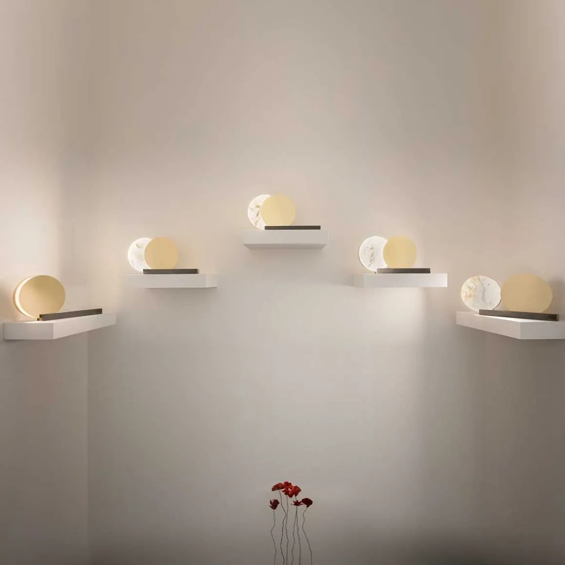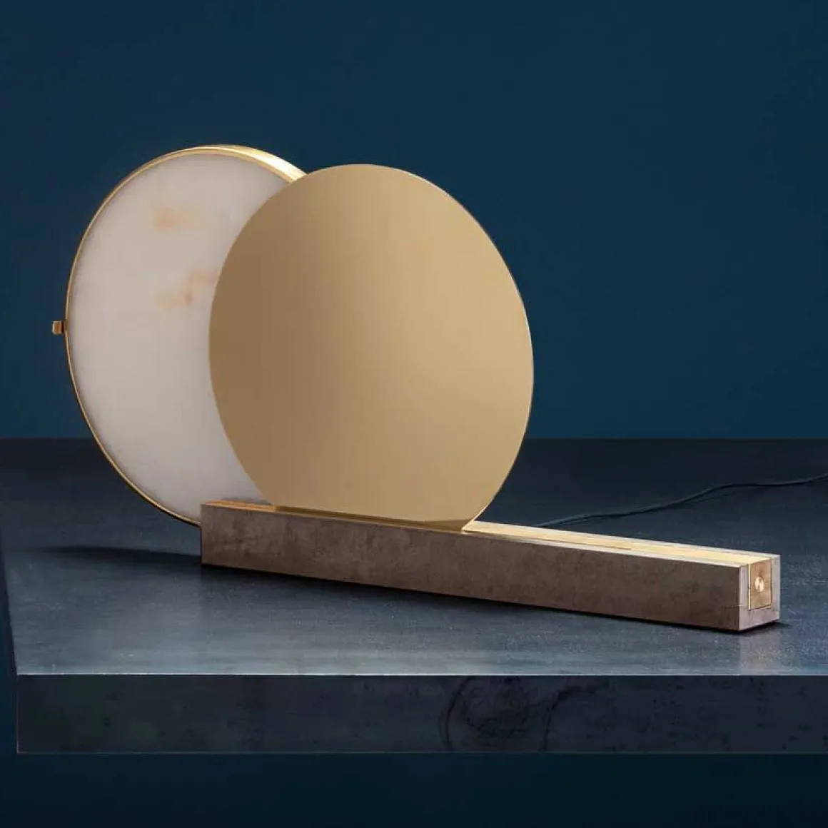 Il y a de nombreuses significations allégoriques attribuées à la relation nécessaire entre ces deux éléments, qui existent comme conséquence l’un de l’autre et vice versa. La lampe Alchemie T conçue par Giulia Archimede pour Catellani & Smith devient ainsi un champ d’investigation de cette dimension contraire mais depuis toujours et pour toujours liée.Alchemie T est une sculpture précieuse, composée de deux disques en laiton et albâtre – ceci utilisé pour la première fois dans une création de Catellani & Smith – qui, grâce à un geste léger de la main, glissent parallèlement sur une base-rail en pierre de Médée. L’interaction entre la lumière et l’ombre atteint son apogée au moment où les deux disques se superposent, en donnant presque lieu à une éclipse. Ce mouvement crée une expérience d’usage, une variation à la fois de la forme de la lampe et de l’intensité lumineuse, pour créer de nouvelles atmosphères dans l’environnement. Alchemie T représente donc une solidarité entre l’objet et son utilisateur, qui pousse ce dernier à se reconnaître et à s’identifier émotivement dans son espace.