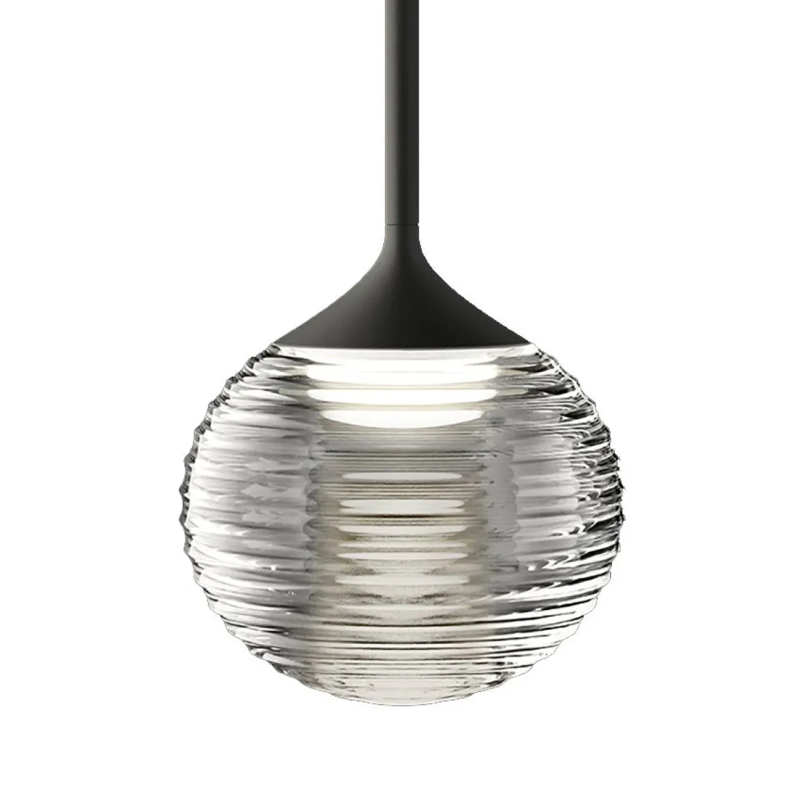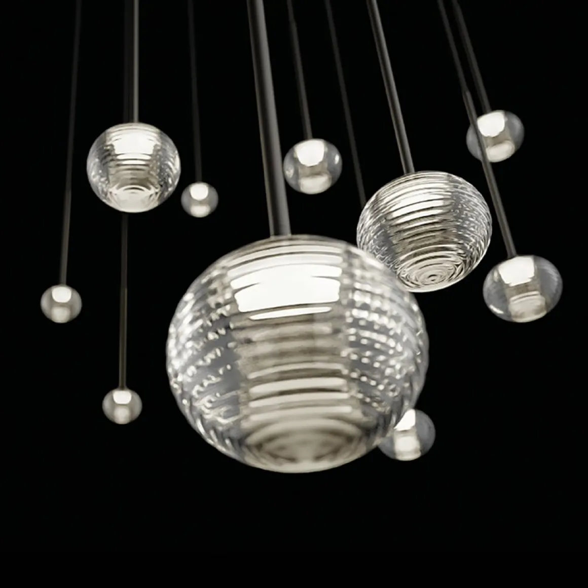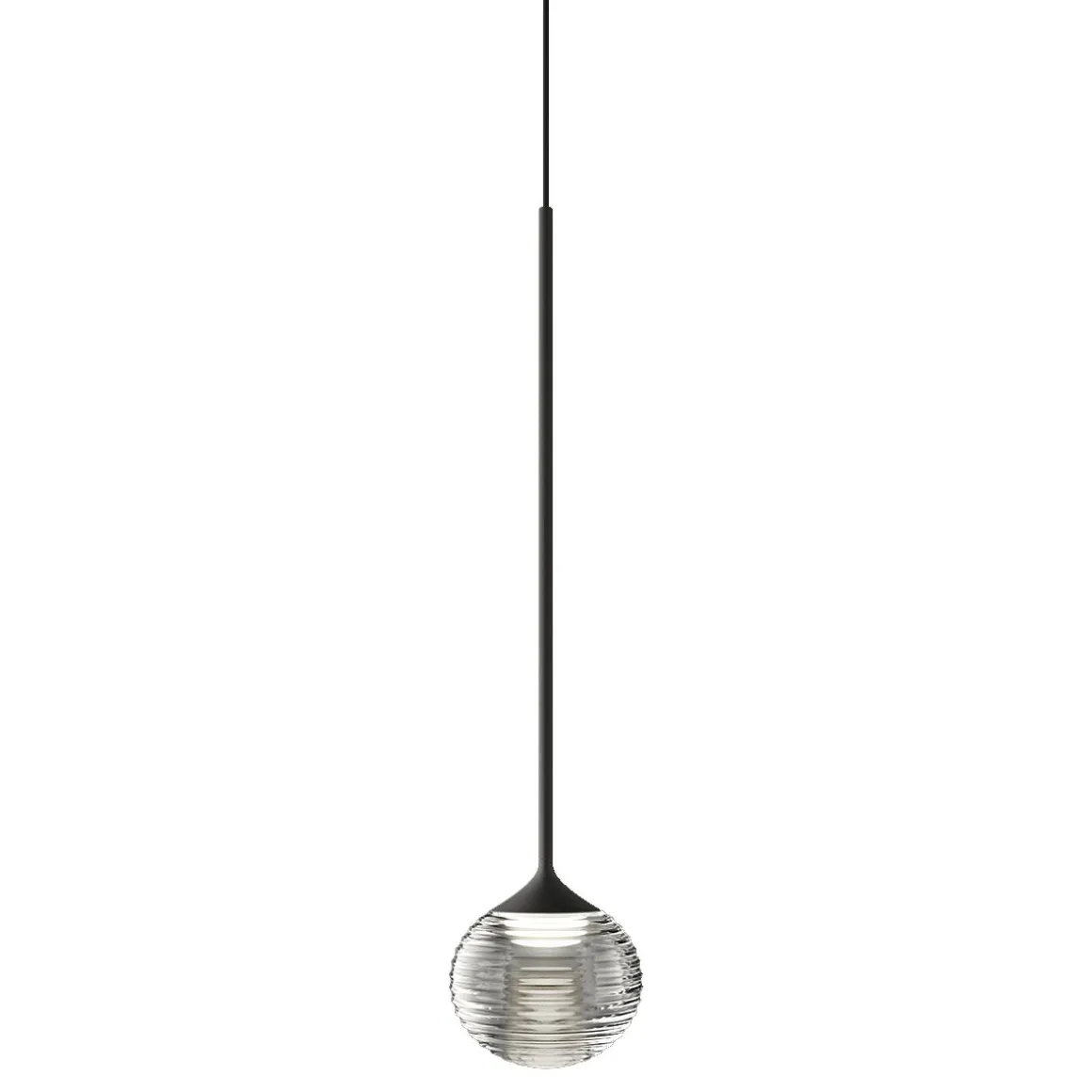Matériaux : diffuseur en polycarbonate, sphère en verre soufflé, fixation du verre en aluminium, structure suspension en acier