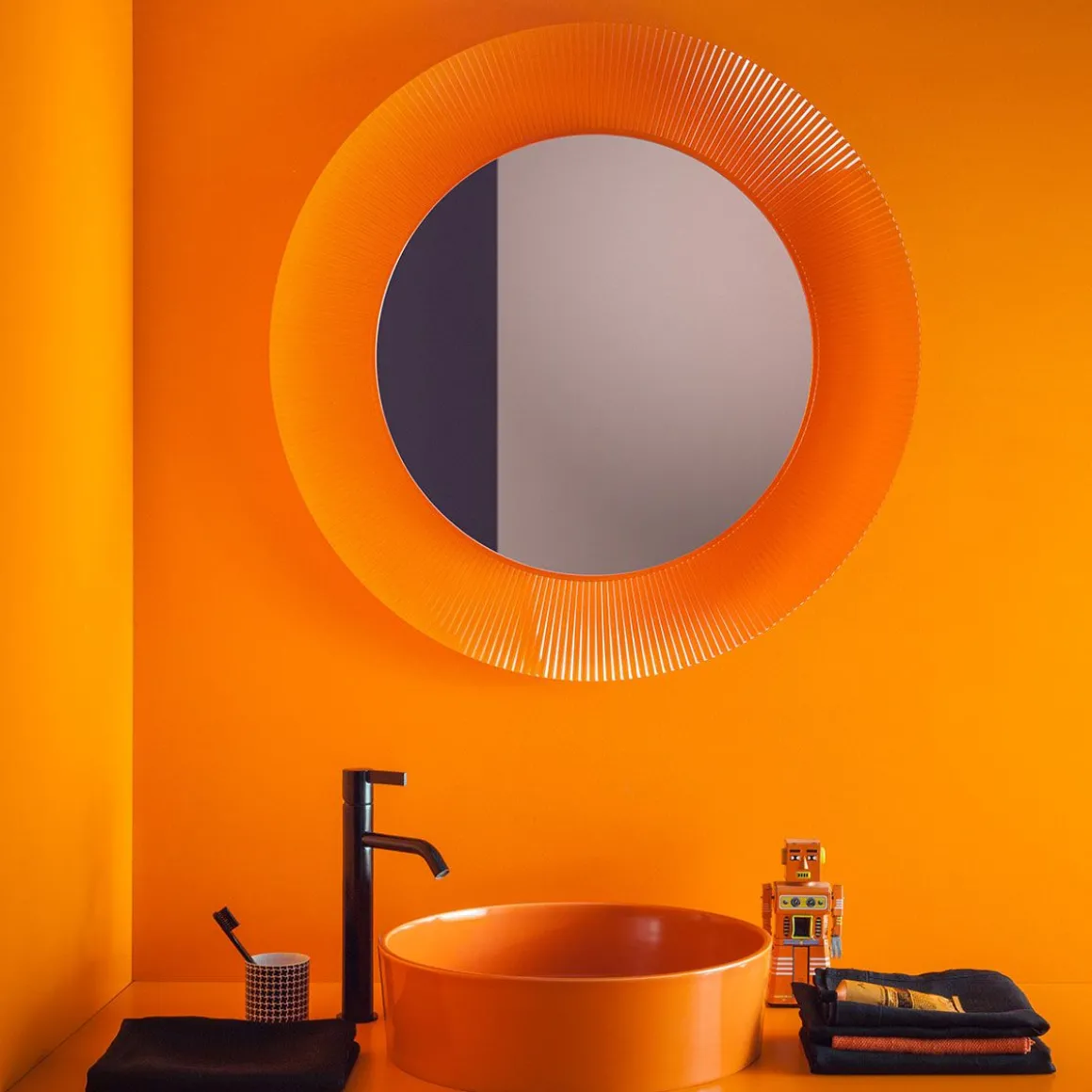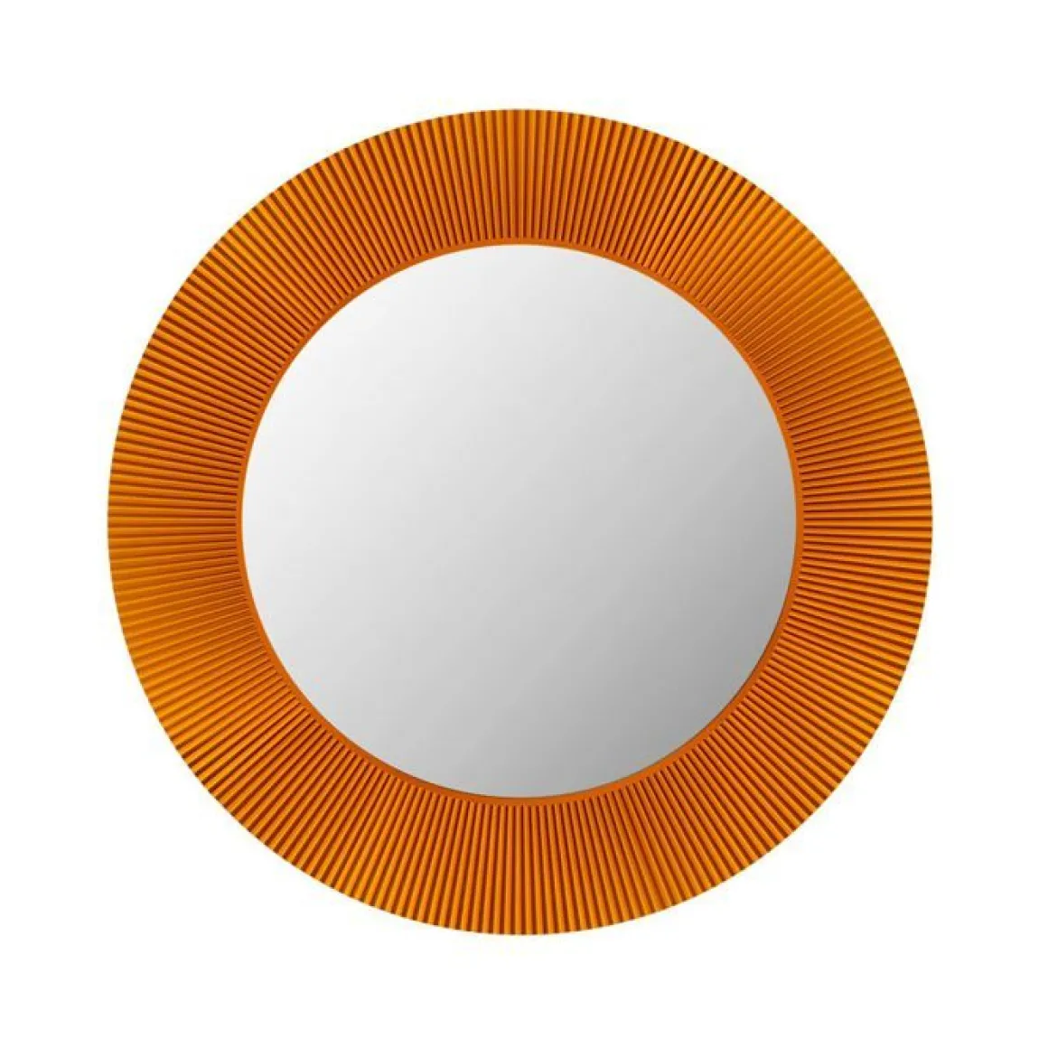 All Saints est un miroir rond entouré d’un cadre qui présente un effet plissé de manière à créer, quand il est éclairé, un jeu de réfractions voilées. Un trait graphique, bien défini évoquant un héritage qui puise son inspiration dans l’une des plus grandes icônes de la collection Kartell : la lampe Bourgie, au style baroque incomparable. Avec la possibilité de passer des transparences aux chromages or et argent proposés, ce miroir est un objet de design extrêmement polyvalent et transformiste, qui s’intègre à des réalisations contemporaines et essentielles aussi bien qu’excentriques et anticonformistes.