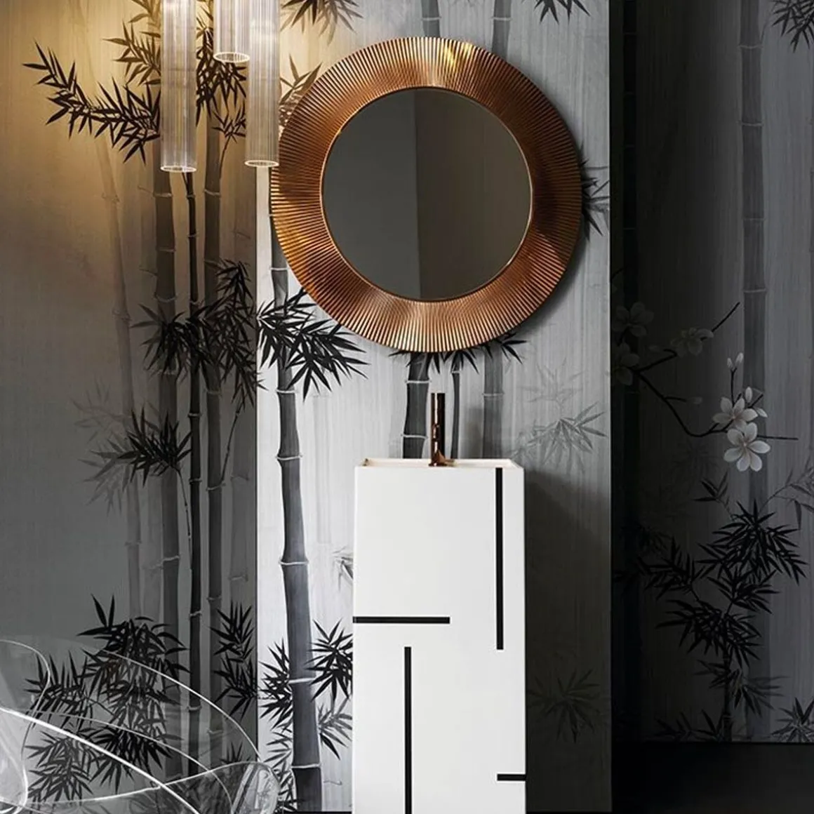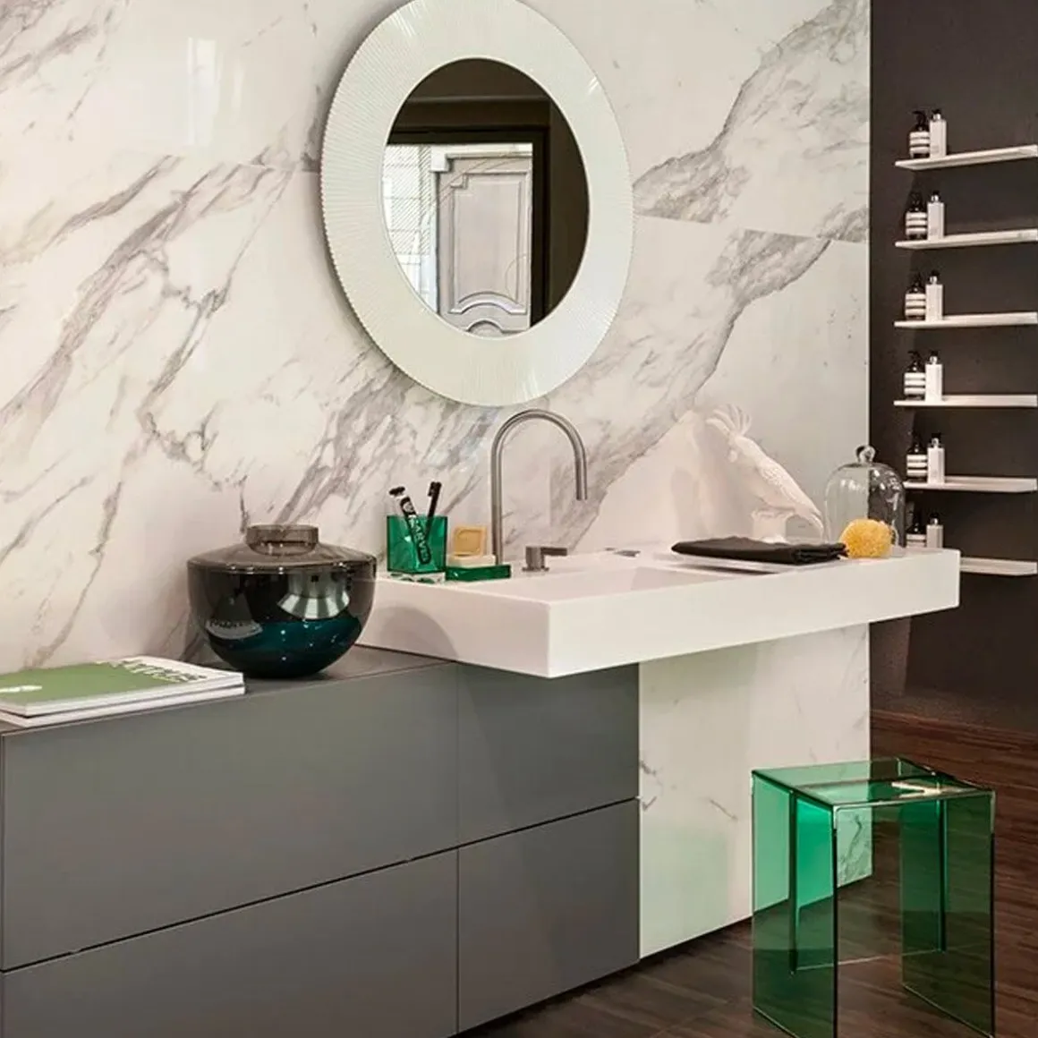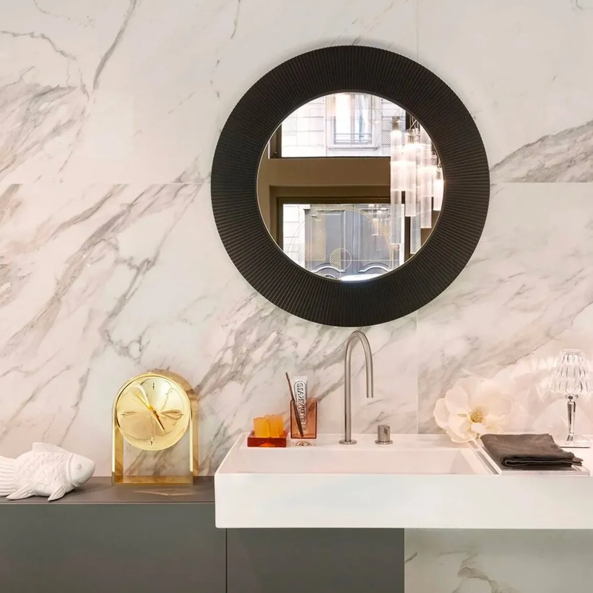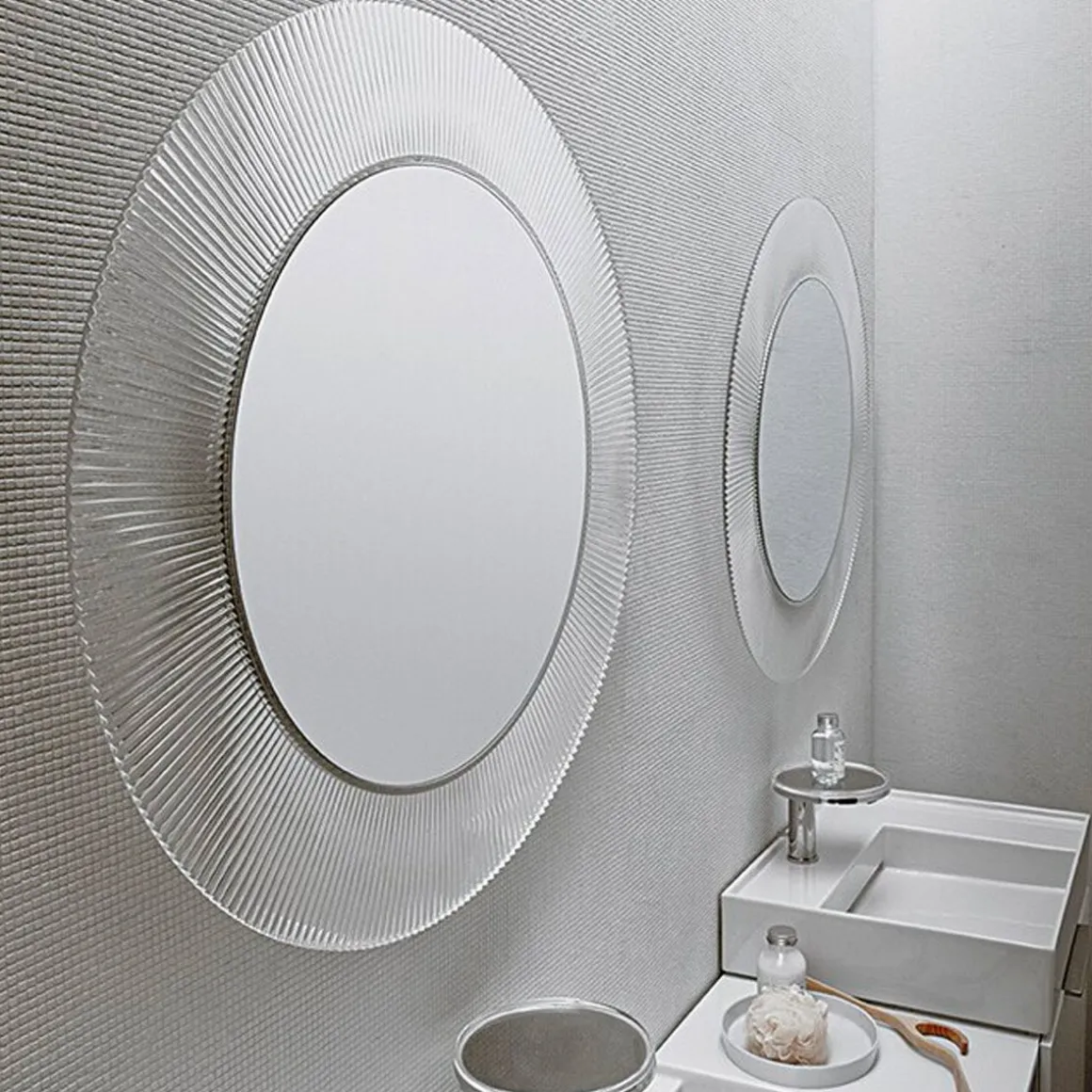 2013 marque le début de la collaboration avec Ludovica et Roberto Palomba, avec lesquels Kartell a développé une collection complète pour la salle de bains (Kartell by Laufen). Une sélection d’accessoires et de meubles de complément en PMMA de différentes couleurs, ils sont aussi à l’aise dans cette pièce que dans d’autres zones de la maison, fidèles comme toujours à la transversalité la plus absolue des produits Kartell. All Saints est un miroir rond entouré d’un cadre qui présente un effet plissé de manière à créer, quand il est éclairé, un jeu de réfractions voilées. Un trait graphique, bien défini évoquant un héritage qui puise son inspiration dans l’une des plus grandes icônes de la collection Kartell : la lampe Bourgie, au style baroque incomparable. Avec la possibilité de passer des transparences aux chromages or et argent proposés, ce miroir est un objet de design extrêmement polyvalent et transformiste, qui s’intègre à des réalisations contemporaines et essentielles aussi bien qu’excentriques et anticonformistes.