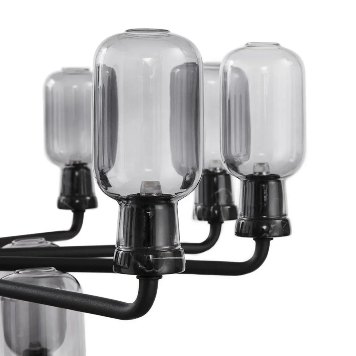 Un design spectaculaire a été ajouté à la collection d’éclairage Amp par le designer danois Simon Legald. Tout comme les modèles existants dans la collection, le lustre Amp est fabriqué à partir d’une combinaison raffinée de marbre massif et de verre léger. Le lustre est construit autour d’un cylindre en acier central, à partir duquel de petits bras poussent pour former une forme ovale volumineuse. Chaque bras est couronné par une version miniature de la lampe de table Amp qui, en vertu de la répétition, respire la vie dans une lampe sculpturale et dramatique.