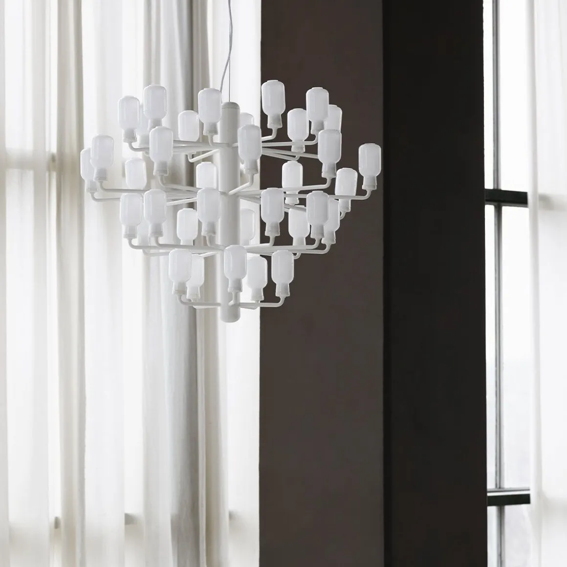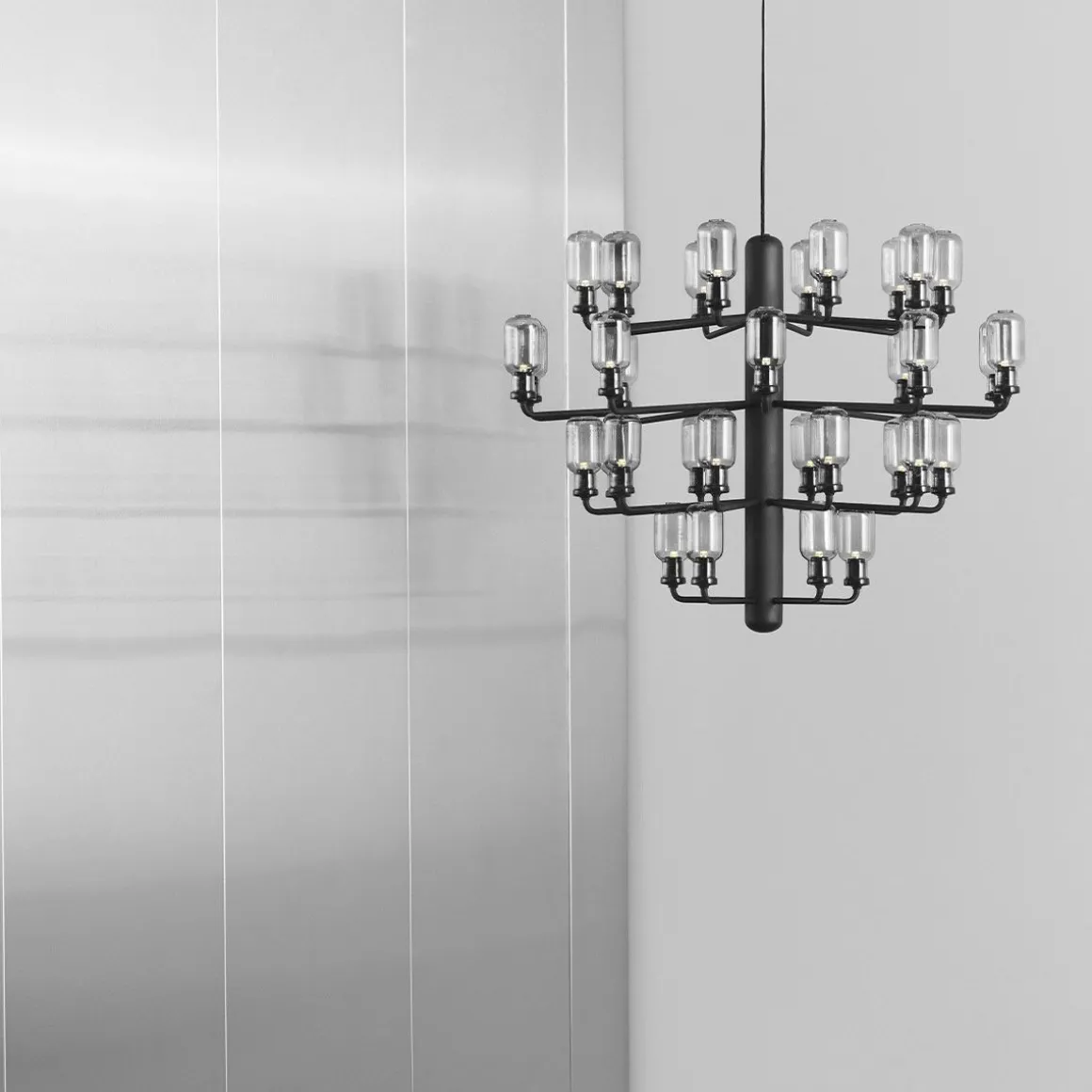 Le lustre Amp existe en deux tailles, avec 15 ou 35 bras, et il est disponible en trois couleurs. Un ajout parfait à la réception d’une entreprise, à un couloir ou à une table à manger, où le design accrocheur peut vraiment briller.