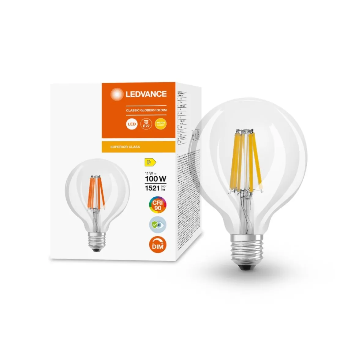 Ampoule E27 Globe claire 11W avec technologie de « filament » LED innovante, une très faible consommation d’énergie. Ses zones d’application sont idéales pour les installation décoratives, éclairage général ou encore une utilisation extérieur uniquement dans les luminaires d’extérieur appropriés.
