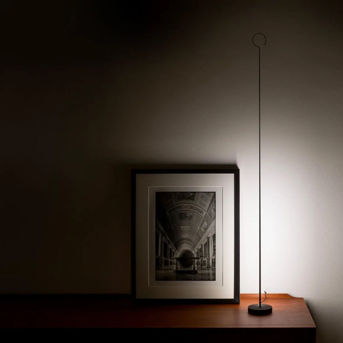 Absence et essence de lumière. C’est l’émotion d’une lumière indirecte avec une esthétique en équilibre entre la Scandinavie et le Japon, deux cultures apparemment lointaines, mais en réalité très proches l’une de l’autre. Au sommet, un cercle ouvert de métal fin, tel un hameçon pour des pêcheurs d’âmes.