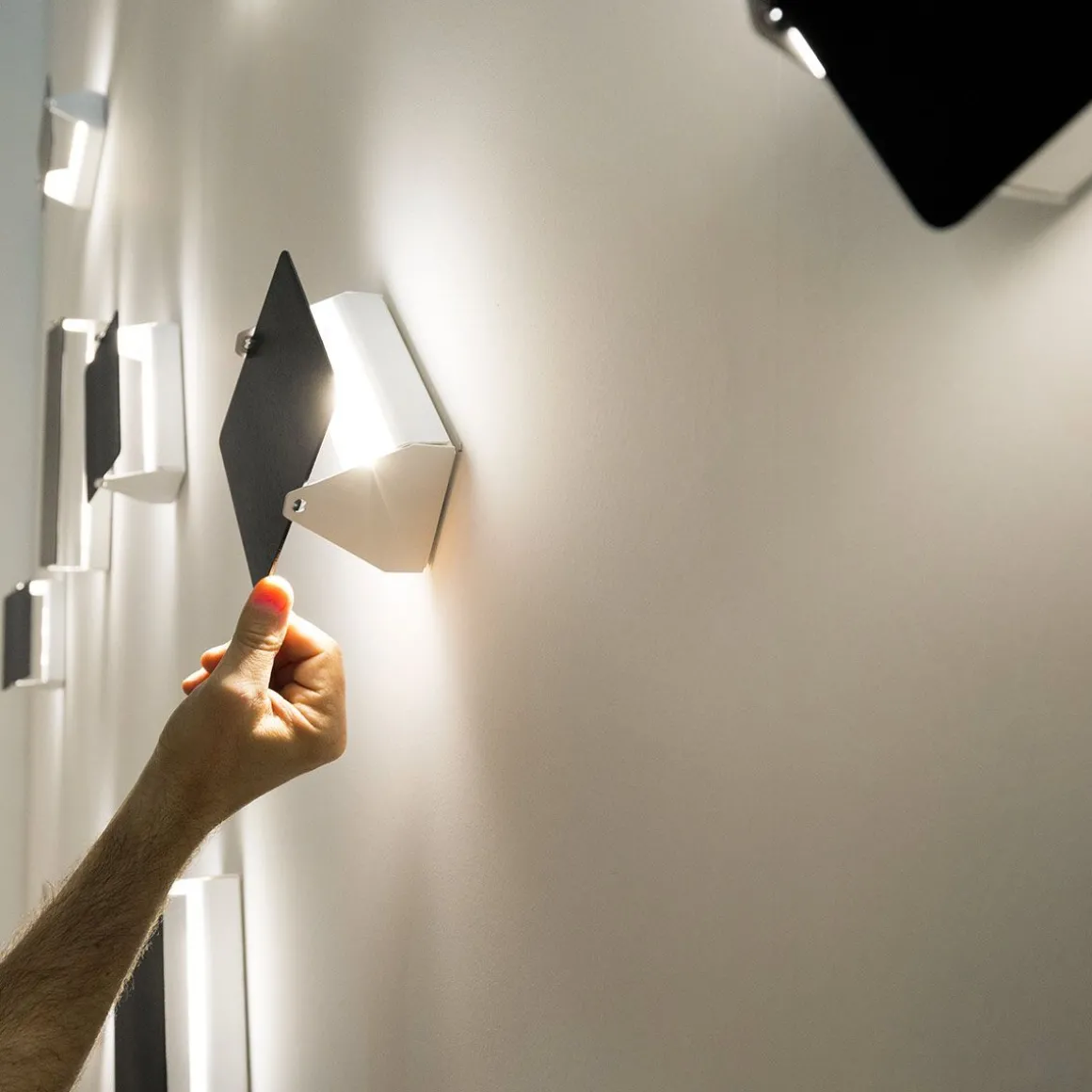 Appliques avec diffuseur orientable « volet » en aluminium et structure en métal. Structure peinte en blanc, diffuseur « volet » en aluminium anodisé naturel, aluminium anodisé noir ou acier inoxydable poli miroir. Sortie de lumière indirecte vers le mur et faisceau large orientable.