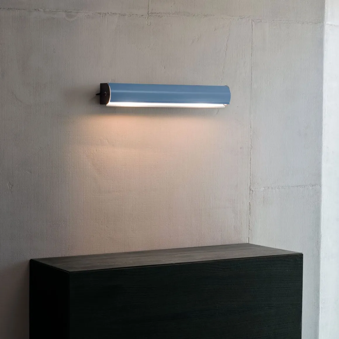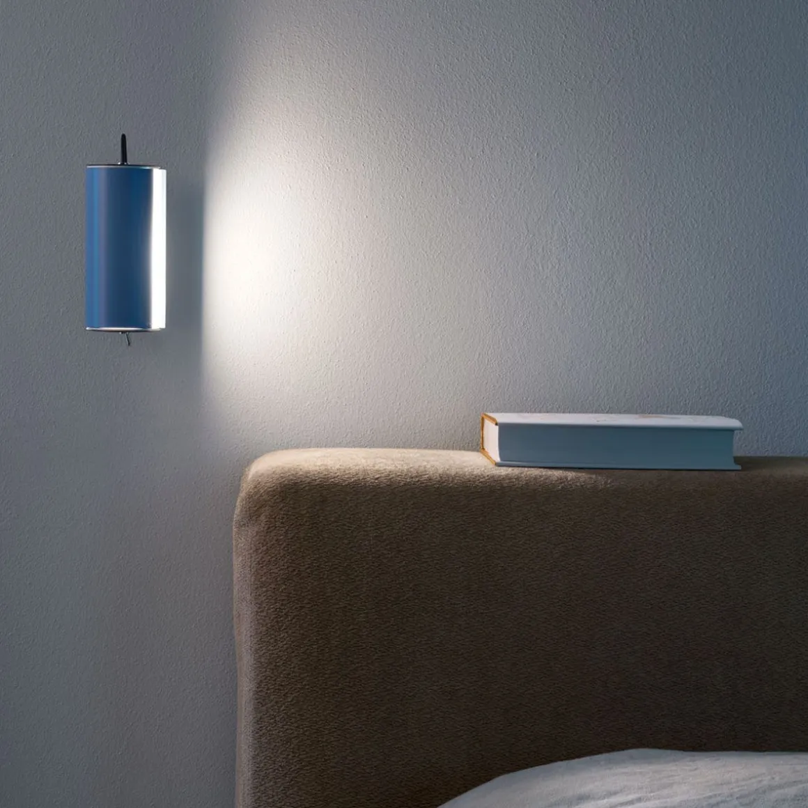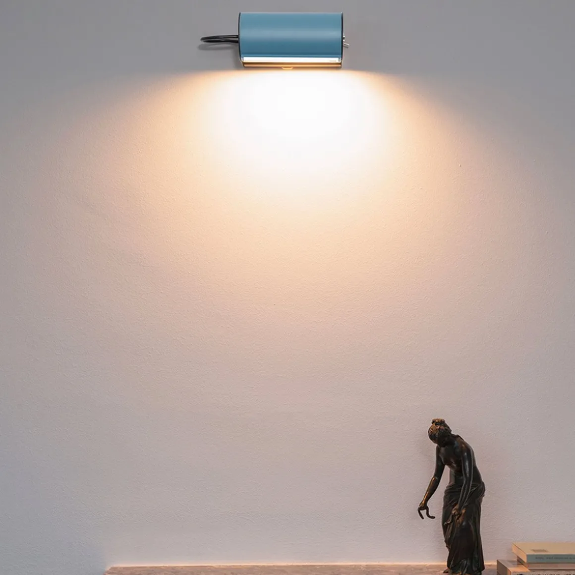 Applique LED avec abat-jour cylindrique disponible en deux tailles (Longue e Petite) en métal peint bleu clair. L’intérêt de Perriand pour les écrans pivotants reflète son observation des gestes humains: un simple toucher permet de contrôler et de diriger le faisceau lumineux.