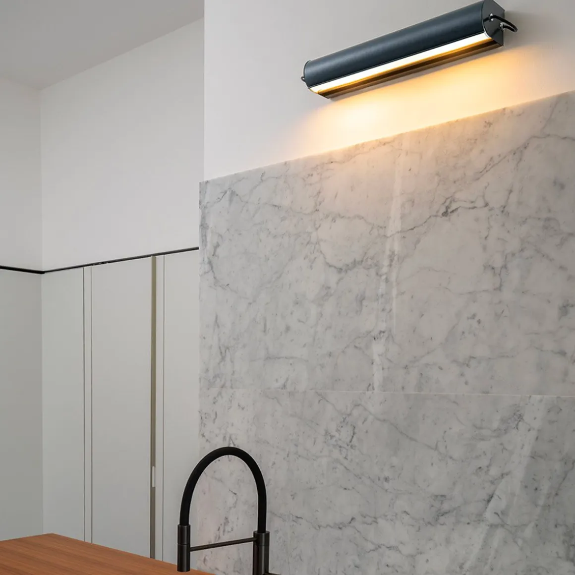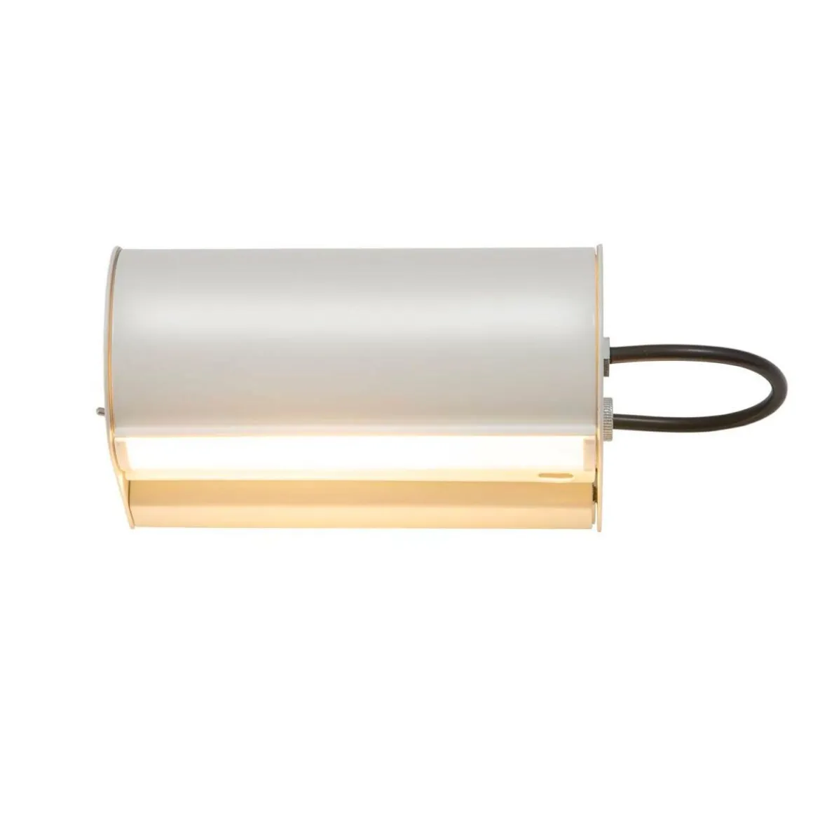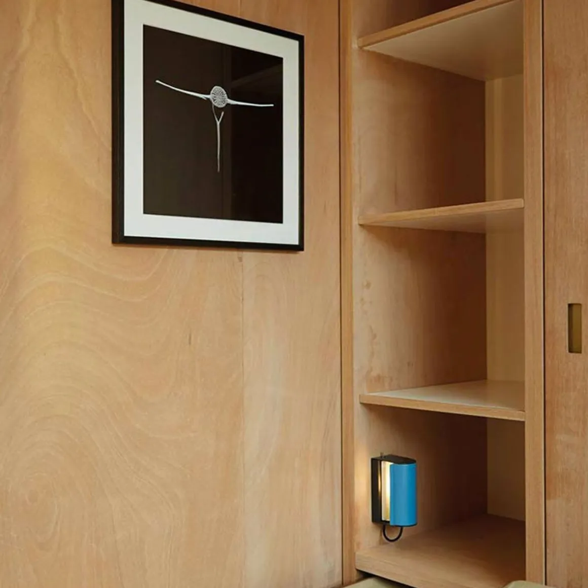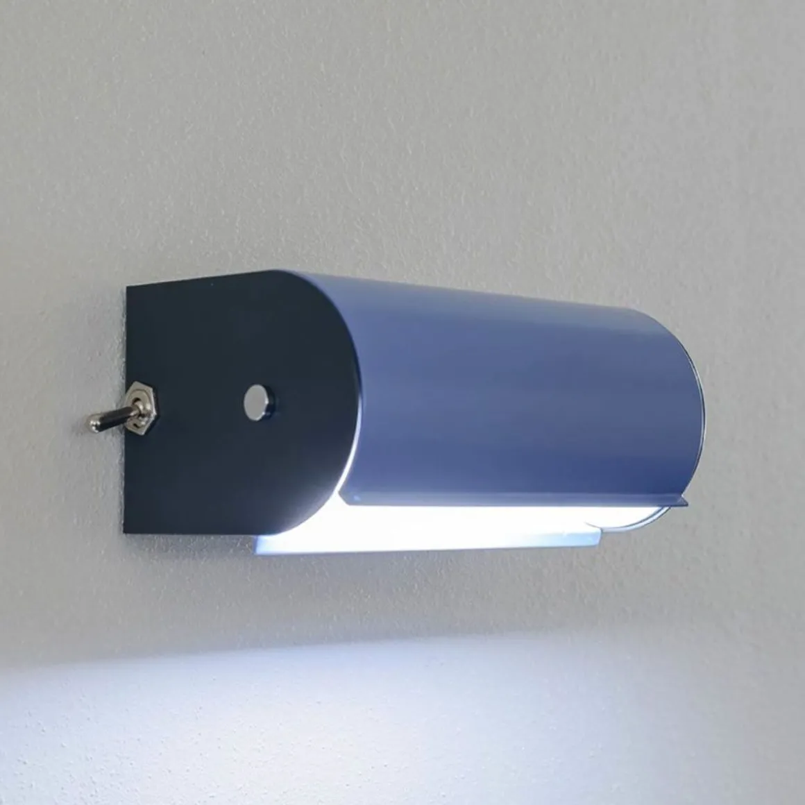 Applique LED avec abat-jour cylindrique disponible en deux tailles (Longue e Petite) en métal peint bleu clair. L’intérêt de Perriand pour les écrans pivotants reflète son observation des gestes humains: un simple toucher permet de contrôler et de diriger le faisceau lumineux.