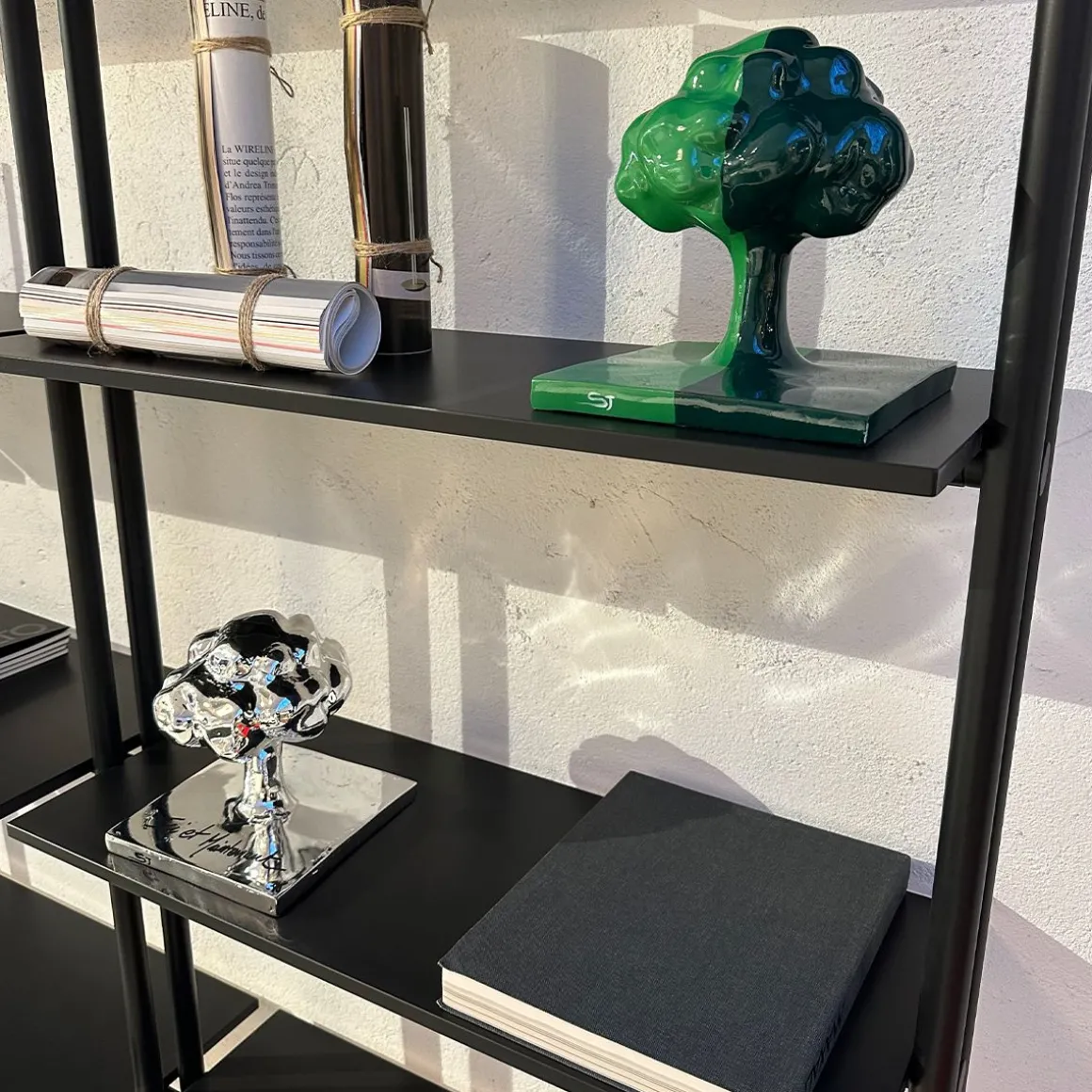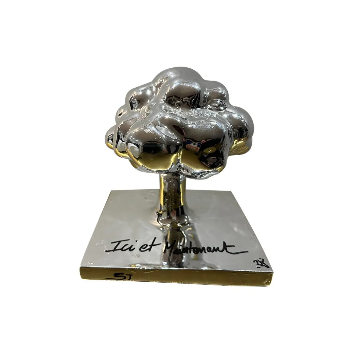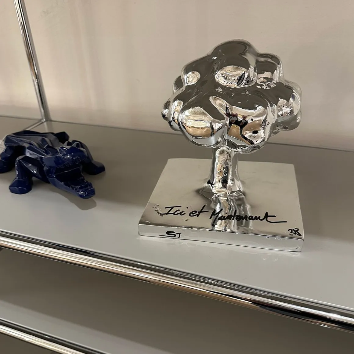 L’excellence de cette pièce réside dans ses finitions sophistiquées. Pour la version chrome, le métal est déposé à la main : ces traces et imperfections font donc partie intégrante de l’objet, garantissant que chaque arbre est une œuvre unique. De plus, le message manuscrit (‘Ici et Maintenant’) aperçu sur la base chromée n’est pas fourni : il vous appartient d’y inscrire les mots ou la phrase qui vous inspirent (une citation, une date, un vœu). Vous transformez ainsi l’œuvre de SJ en une pièce totalement personnelle et interactive.