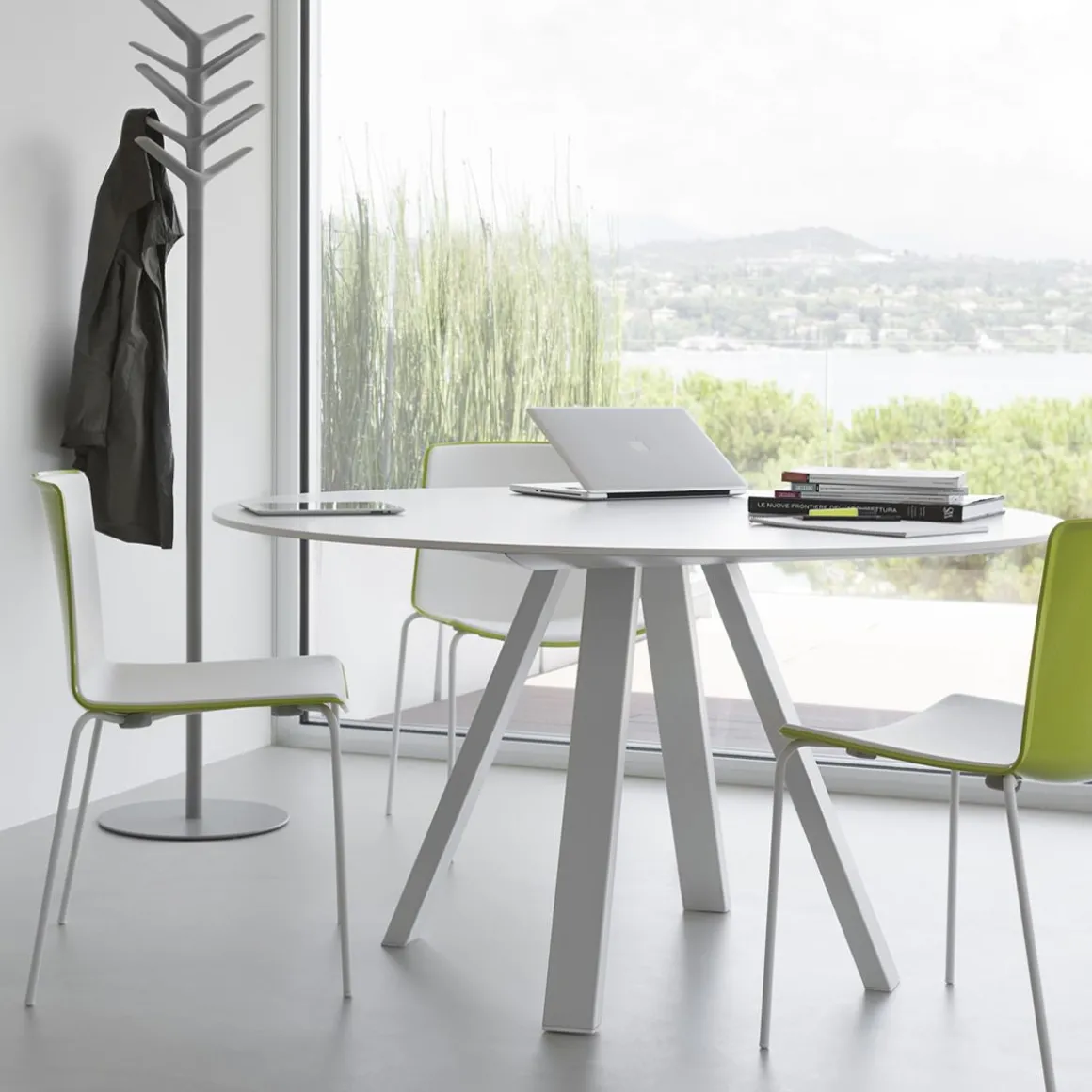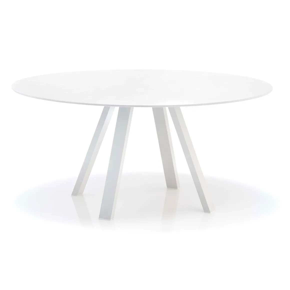Arki-Table rond a les pieds en acier époxy, le profil/cadre en extrudé d’aluminium et le plateau en stratifié fort-épaisseur.