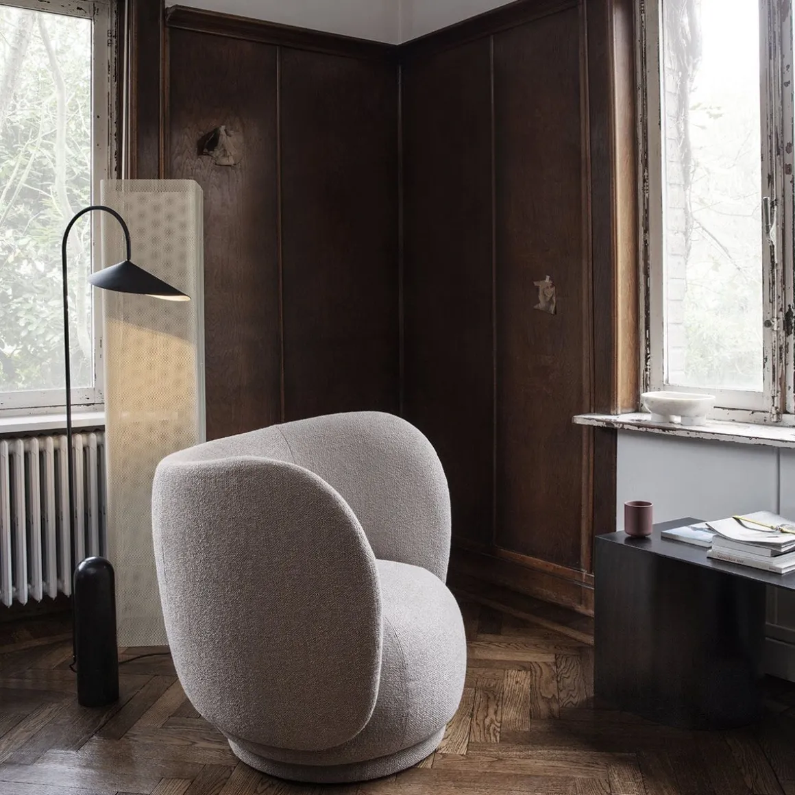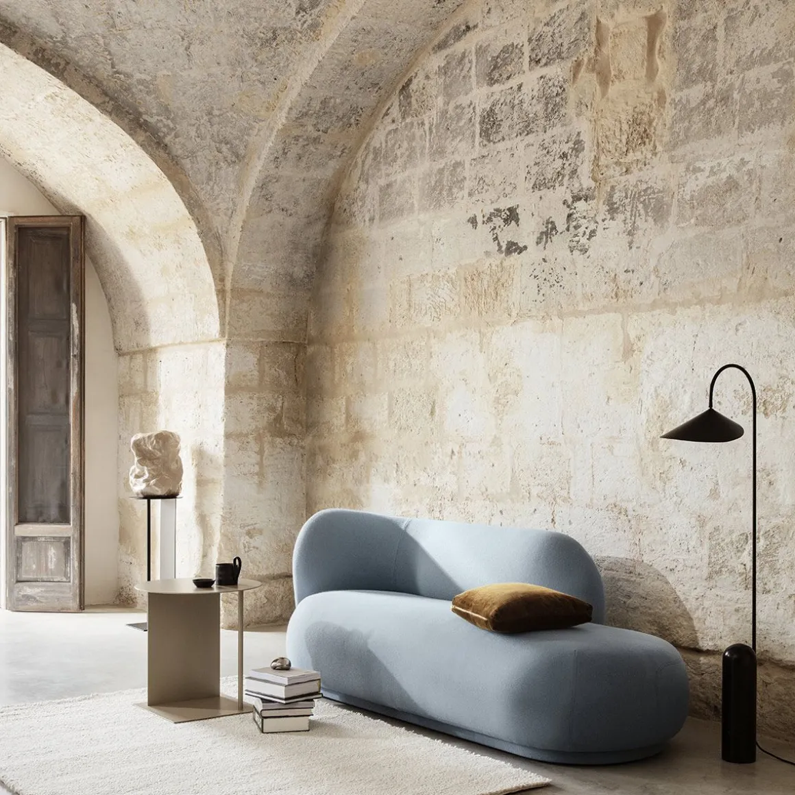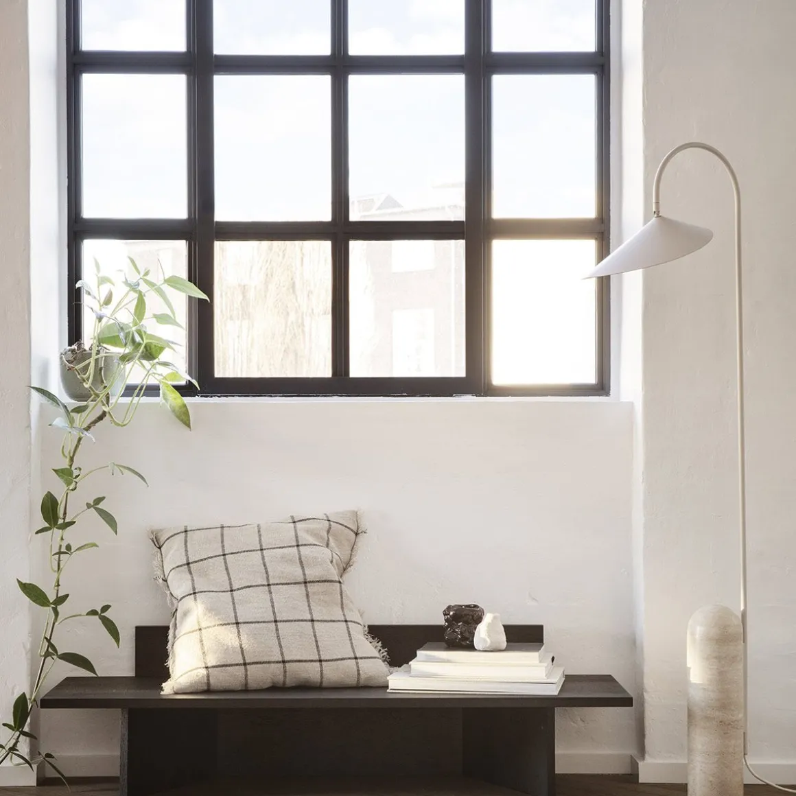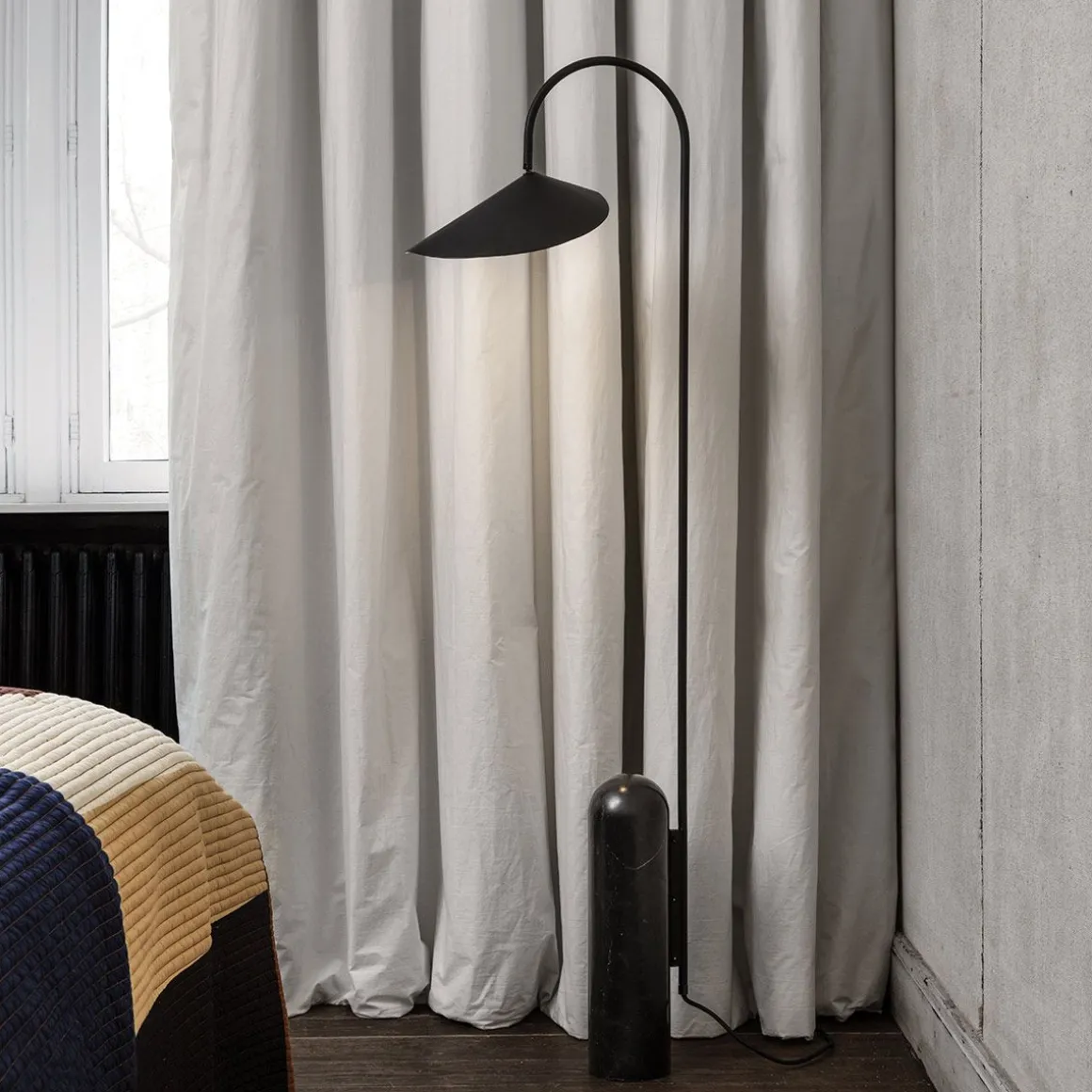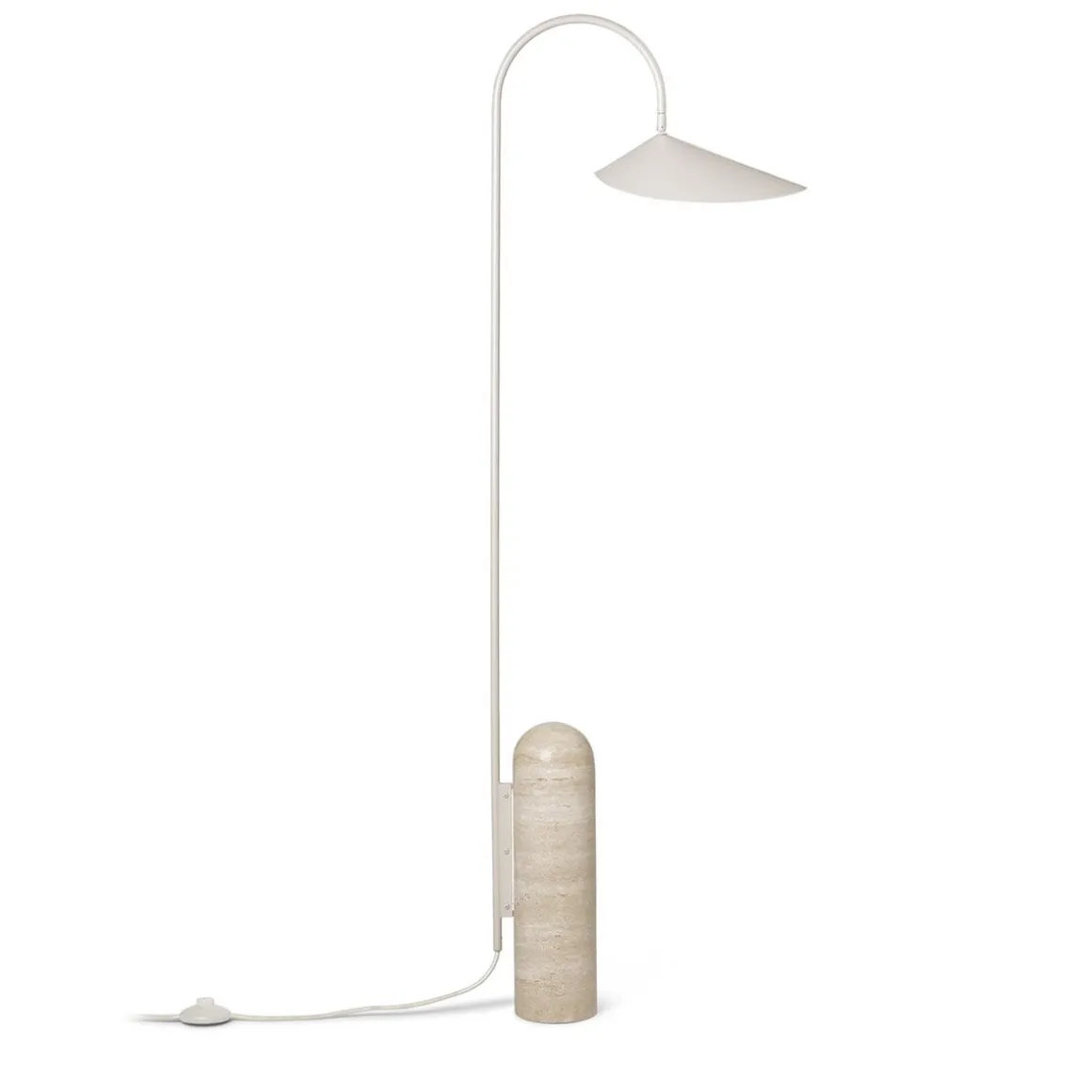 Étude des contrastes, notre lampadaire Arum se distingue par son abat-jour asymétrique qui repose sur une tige métallique élancée et une base en travertin. L’abat-jour incurvé en forme de pétale est peint en blanc sur la face inférieure pour répartir uniformément la lumière douce et ambiante. Utilisez-le pour éclaircir un coin sombre ou placez-le à côté d’une chaise longue pour mettre en lumière un livre préféré, en ajustant l’ombre à l’angle parfait.