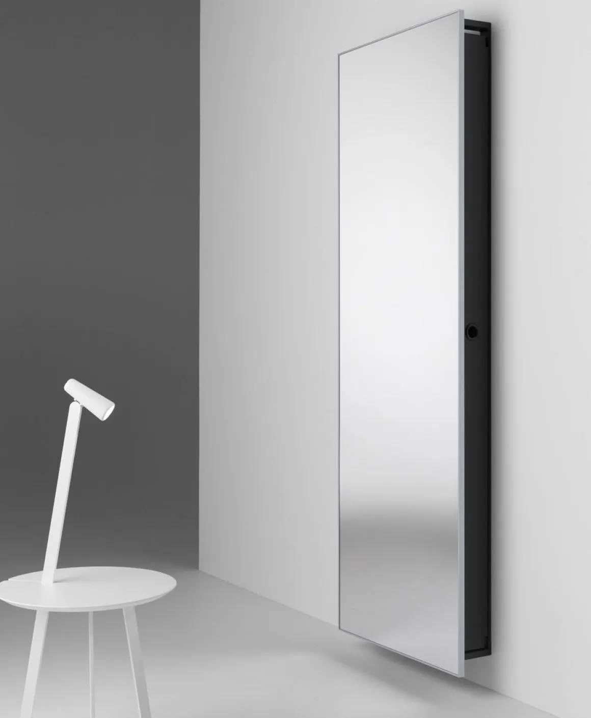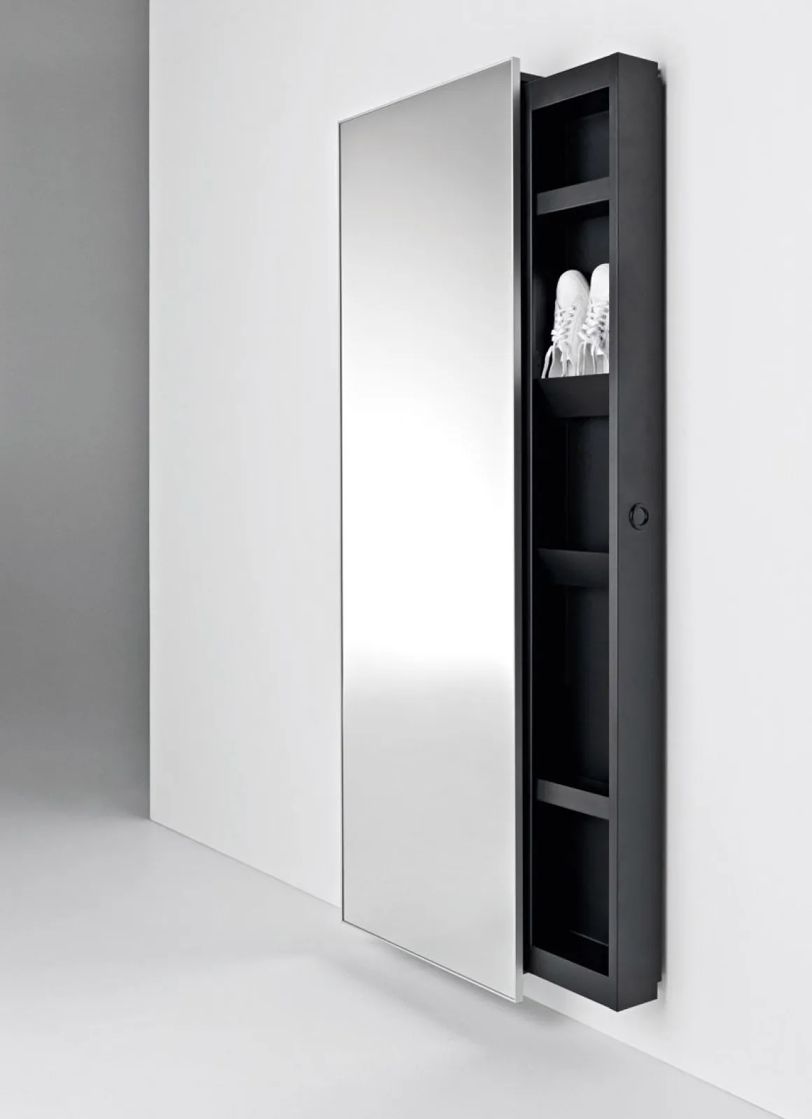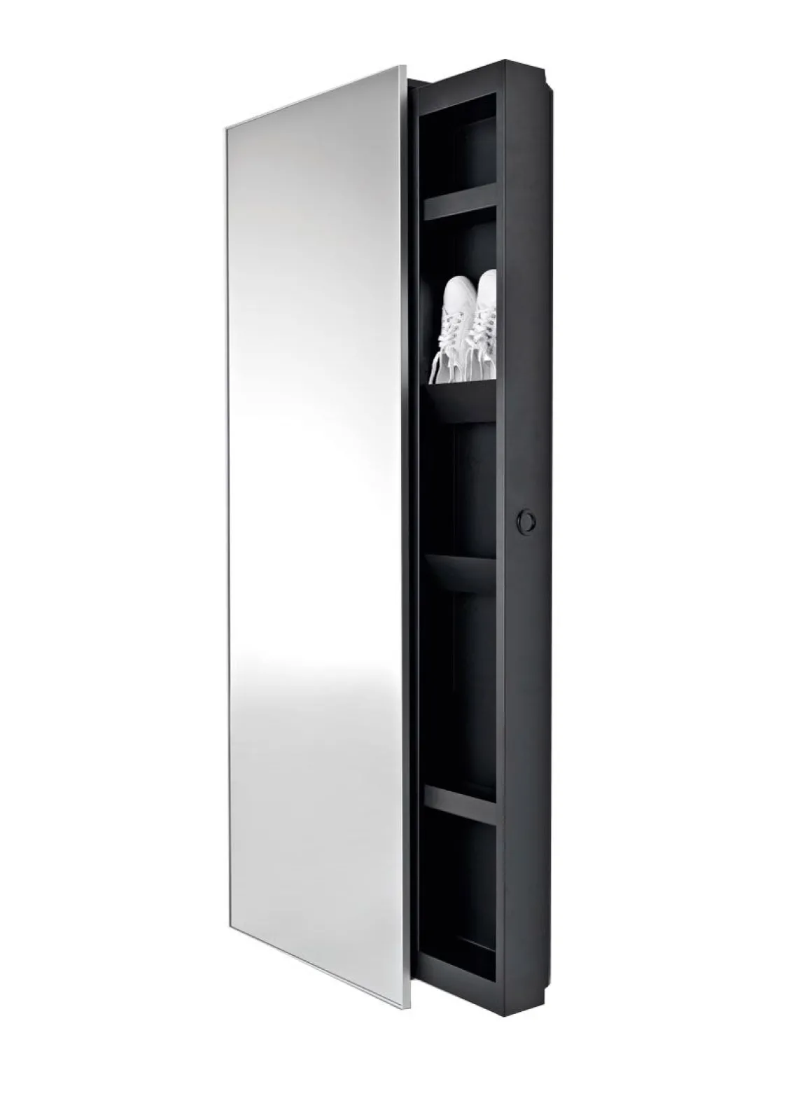 Backstage est un miroir dessiné par Salvatore Indriolo pour Horm. Le concept de miroir évolue et s’enrichit de nouvelles fonctions. Un miroir fixe et sécurisé cache derrière lui un logement en métal qui coulisse aussi bien à droite qu’à gauche en révélant ainsi son contenu. Personnalisable grâce à des étagères mobiles, ce meuble d’appoint est un véritable « backstage domestique », qui peut tout aussi bien devenir l’acteur au centre de la scène.