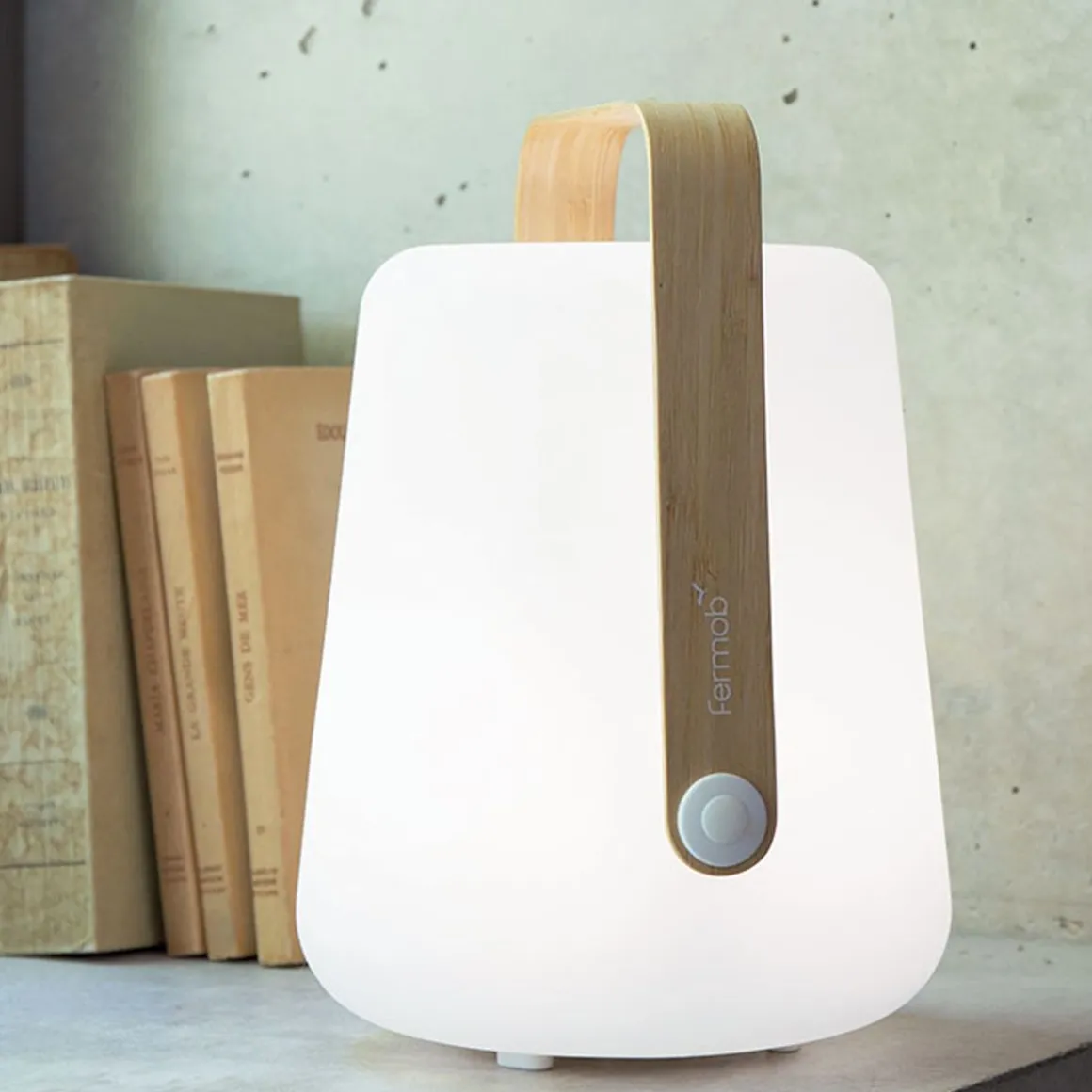 Modèle emblématique de la collection Balad, la lampe H25 a bousculé les codes du luminaire outdoor. Innovante, maline et design, elle s’inscrit dans la droite ligne des produits Fermob. Né de l’esprit du designer Tristan Lohner, le concept de lampe baladeuse est venu satisfaire nos envies de nomadisme et de liberté. De l’apéro sur le balcon au pique-nique sur la plage, cette lampe nomade se transporte littéralement partout. Et c’est sans doute l’une des raisons de son succès ! Conçue initialement pour l’extérieur, notre lampe nomade H25 Balad s’est rapidement invitée dans vos intérieurs. Pour répondre à ce nouveau rôle que vous lui avez assigné, Fermob a décidé de revisiter chaleureusement sa lampe baladeuse déco pour coller aux attentes de l’univers de la décoration intérieure. Surfant sur la tendance des matières naturelles, la lampe H25 Balad Bamboo adopte une poignée en bambou. Véritable signature de la collection Balad, cette poignée ergonomique qui rappelle à s’y méprendre la forme d’un casque audio vous permet de déplacer et déposer votre lampe baladeuse à led où bon vous semble en un tour de main. De la chambre au salon, la lampe H25 Balad Bamboo est destinée à vous suivre à la trace ! Cette nouvelle garde-robe en bambou n’enlève rien aux fonctionnalités techniques de la lampe H25 Balad. À la fois réparable et démontable, cette lampe à poser sans fil assure jusqu’à 14 heures d’utilisation sans se soucier de la recharger. Une prouesse technologique qui ne néglige pas le confort d’éclairage ! Avec une intensité de 40 Lm, la lampe H25 Balad Bamboo vous invite à tester ses quatre différents scénarios d’éclairage du blanc le plus froid au blanc le plus chaud. Notre coup de cœur ? Son mode scintillant effet bougie pour éclairer vos plus belles soirées…