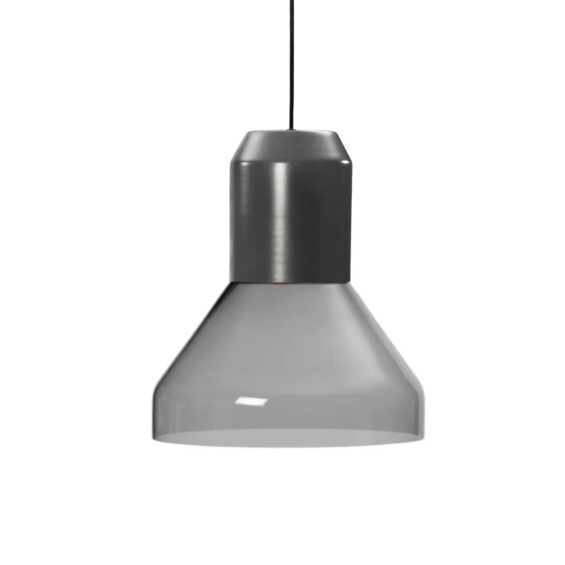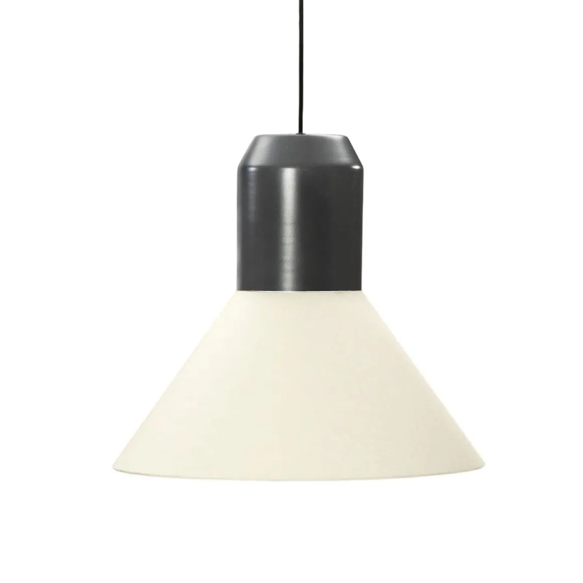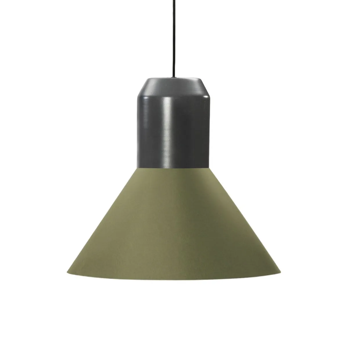 Chaque abat-jour de cette famille de lampes suspendues peut être combiné à volonté avec les douilles épurées de forme cylindrique et de couleur gris, laiton ou cuivre.
