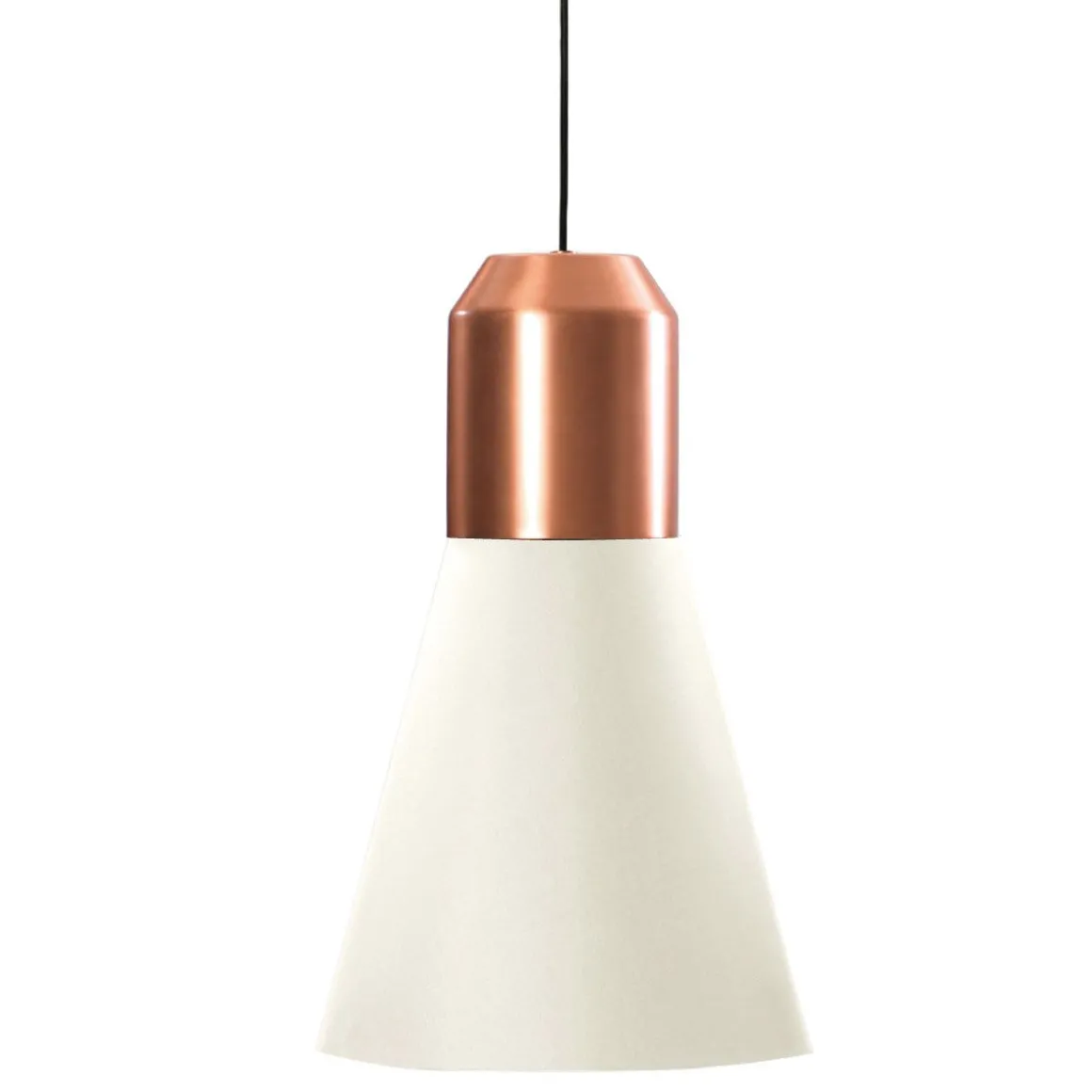 Chaque abat-jour de cette famille de lampes suspendues peut être combiné à volonté avec les douilles épurées de forme cylindrique et de couleur gris, laiton ou cuivre.