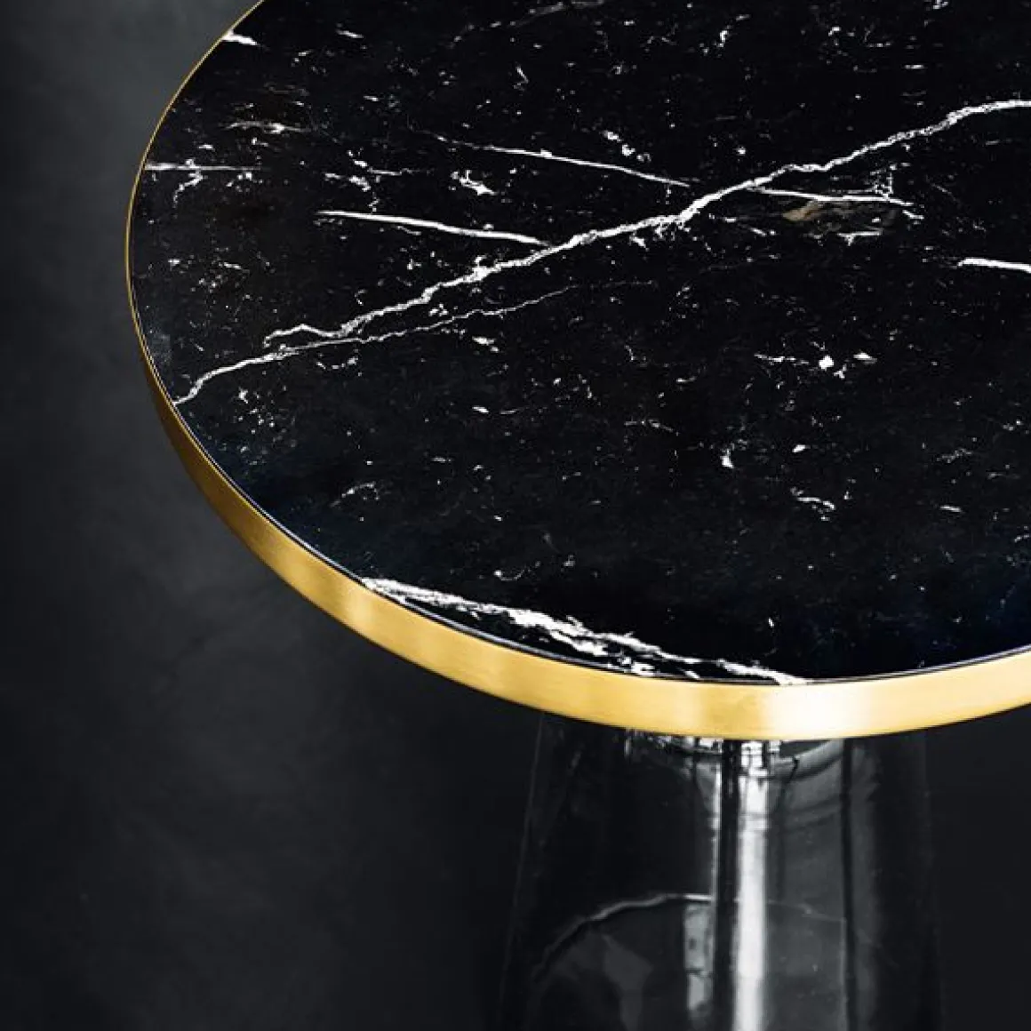 Matériaux : fabriquée à la main, pied en verre soufflé à la bouche, partie supérieure en laiton massif verni clair, plateau en marbre blanc ou noir, poli et imprégné