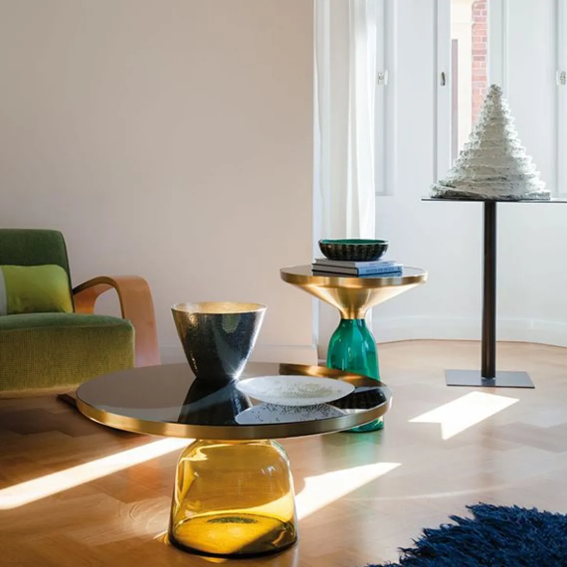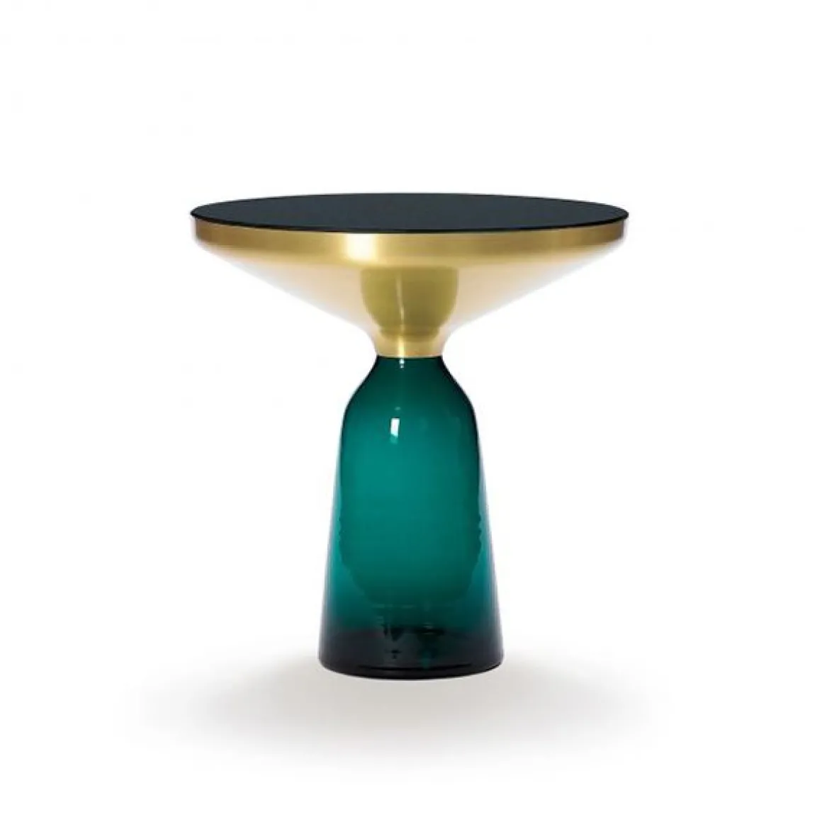 Le pied en verre traditionnellement soufflé dans un moule en bois et le corps métallique embouti créent un contraste fascinant tout en réalisant une union harmonieuse des formes qui rappelle l‘élégance d‘une cloche à la volée. Leurs réflexions attrayantes et le contraste de leurs matériaux font des Bell Table des éléments d‘intérieur au caractère affirmé.
