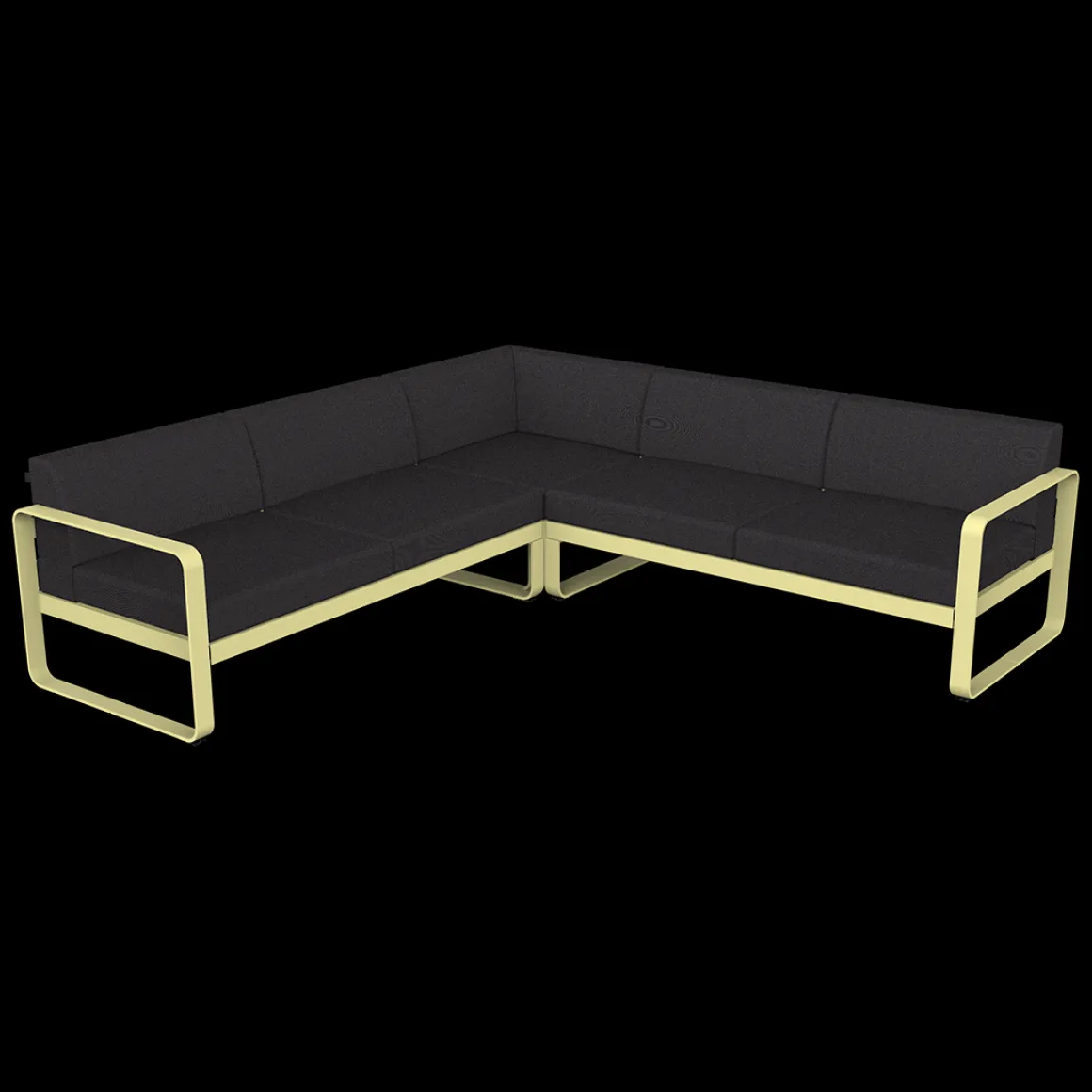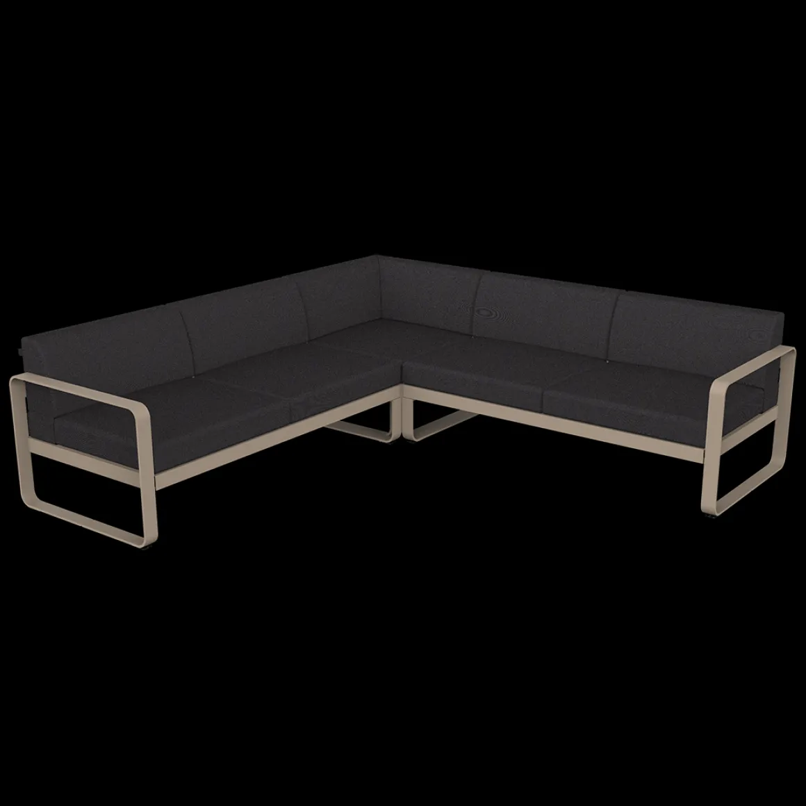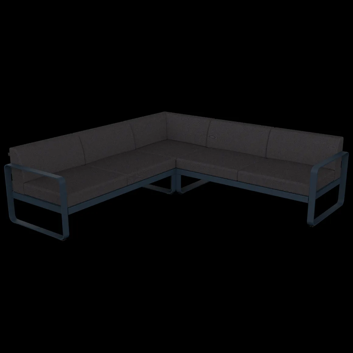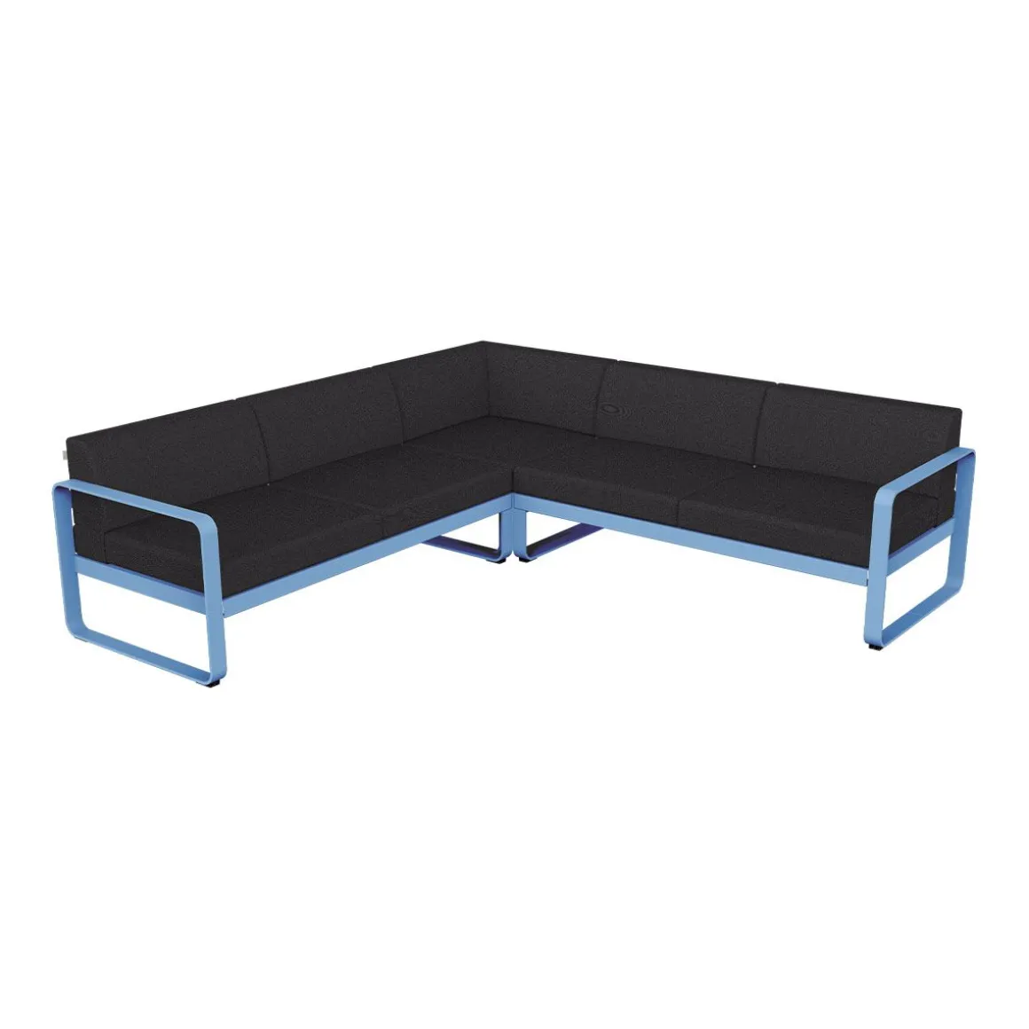 Craquez pour un canapé d’angle au design intemporel, signé d’un studio renommé, celui du duo Pelhaître et Pagnon. Un canapé XL tout en rondeur, un canapé synonyme de douceur… de vivre. Et un canapé au nom prédestiné : Bellevie ! La belle vie, goûtez-y, bien assis sur votre canapé. Un module gauche 2 places, un module d’angle 1 place et un module droit 2 places : voilà à quoi il va ressembler. C’est sans doute celle qu’il vous faut pour un aménagement idéal de votre terrasse et pour relever le challenge d’asseoir 5, voire 7 invités, un peu plus serrés. Ce canapé outdoor est garni de coussins déhoussables, hyper faciles d’entretien. Cela dit, passer par la case machine à laver ne s’avérera probablement pas nécessaire car le tissu 100% acrylique qui les recouvre, teint masse, résiste aux taches, à la moisissure, aux déchirures et à l’abrasion ! Un tissu Sunbrella®, par ailleurs ultra-doux, exclusif à Fermob. Et que dire du confort d’assise de votre canapé d’angle de jardin ? Ferme et moelleux à la fois ! L’assemblage de mousses haute résilience en est la raison. Pour couronner le tout, sa structure aluminium, recouverte de peinture polyester, ne craint ni les UV ni les intempéries, pas même en bord en mer. Les différents modules de votre composition Bellevie sont liés par des réglettes en aluminium : un système ultra-performant, rapide à monter comme à démonter si besoin. Malin ! Décidément, il n’y a pas plus facile à vivre qu’un canapé Bellevie modulable. La seule difficulté réside dans le choix du coloris de la structure métal parmi tous ceux du nuancier Fermob ! Quant à celui des coussins, il en existe 4 différents. Ce qui fait une infinité d’associations possibles.