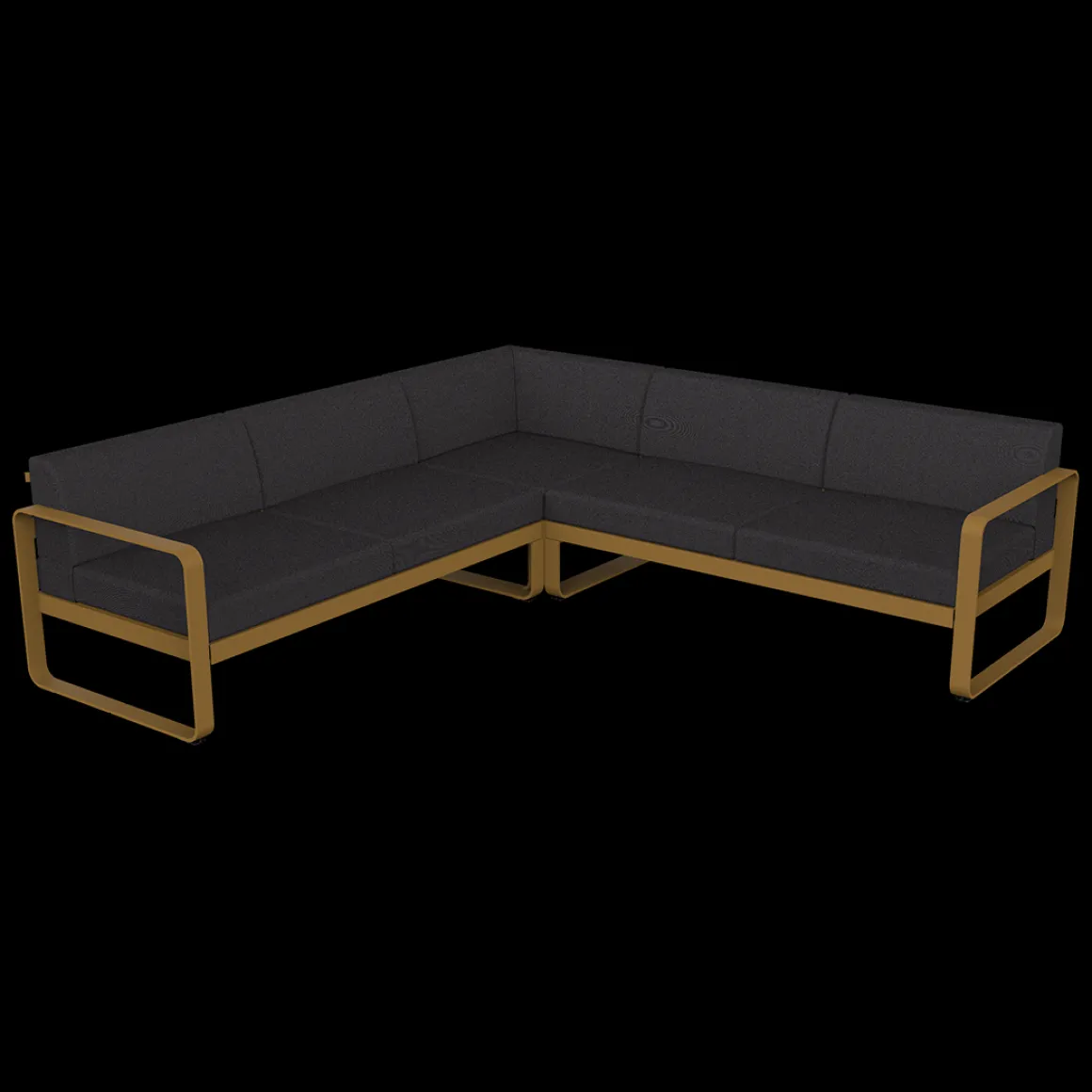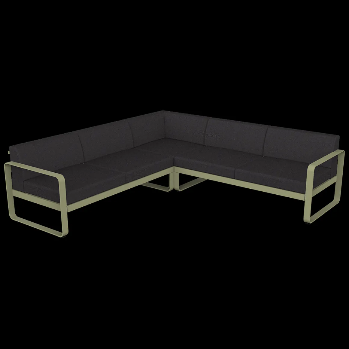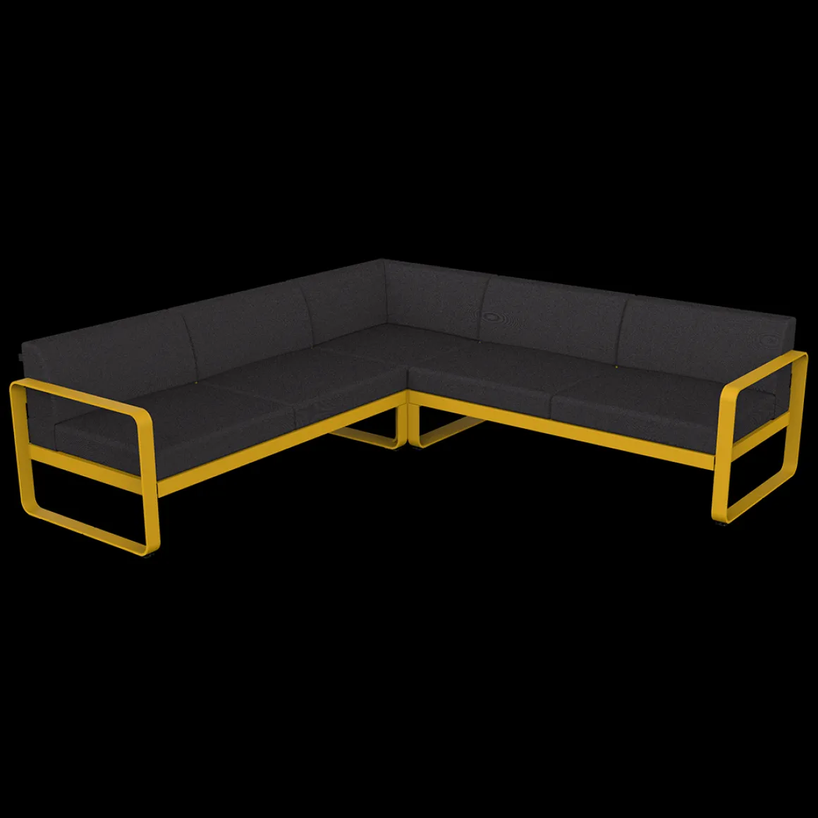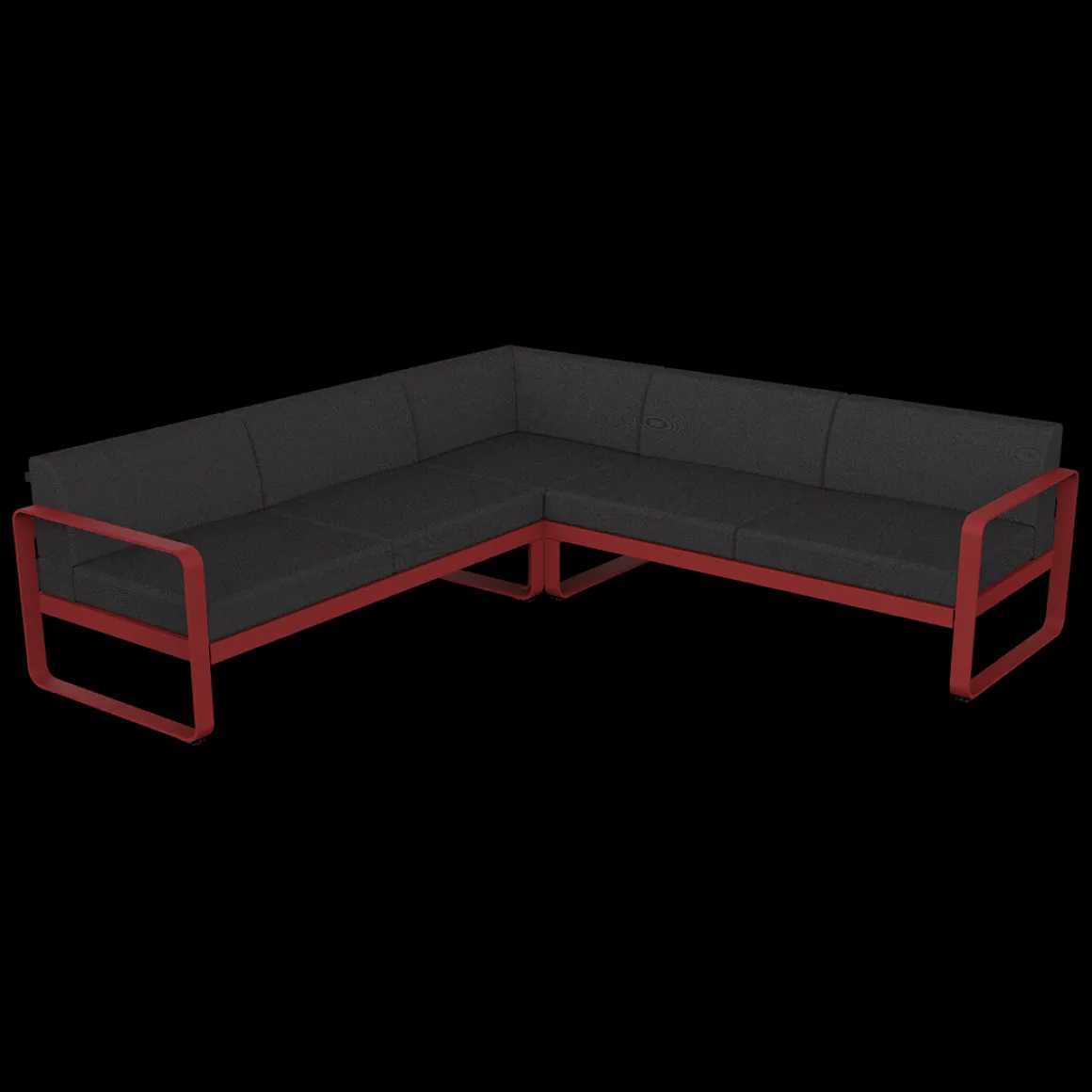 Craquez pour un canapé d’angle au design intemporel, signé d’un studio renommé, celui du duo Pelhaître et Pagnon. Un canapé XL tout en rondeur, un canapé synonyme de douceur… de vivre. Et un canapé au nom prédestiné : Bellevie ! La belle vie, goûtez-y, bien assis sur votre canapé. Un module gauche 2 places, un module d’angle 1 place et un module droit 2 places : voilà à quoi il va ressembler. C’est sans doute celle qu’il vous faut pour un aménagement idéal de votre terrasse et pour relever le challenge d’asseoir 5, voire 7 invités, un peu plus serrés. Ce canapé outdoor est garni de coussins déhoussables, hyper faciles d’entretien. Cela dit, passer par la case machine à laver ne s’avérera probablement pas nécessaire car le tissu 100% acrylique qui les recouvre, teint masse, résiste aux taches, à la moisissure, aux déchirures et à l’abrasion ! Un tissu Sunbrella®, par ailleurs ultra-doux, exclusif à Fermob. Et que dire du confort d’assise de votre canapé d’angle de jardin ? Ferme et moelleux à la fois ! L’assemblage de mousses haute résilience en est la raison. Pour couronner le tout, sa structure aluminium, recouverte de peinture polyester, ne craint ni les UV ni les intempéries, pas même en bord en mer. Les différents modules de votre composition Bellevie sont liés par des réglettes en aluminium : un système ultra-performant, rapide à monter comme à démonter si besoin. Malin ! Décidément, il n’y a pas plus facile à vivre qu’un canapé Bellevie modulable. La seule difficulté réside dans le choix du coloris de la structure métal parmi tous ceux du nuancier Fermob ! Quant à celui des coussins, il en existe 4 différents. Ce qui fait une infinité d’associations possibles.