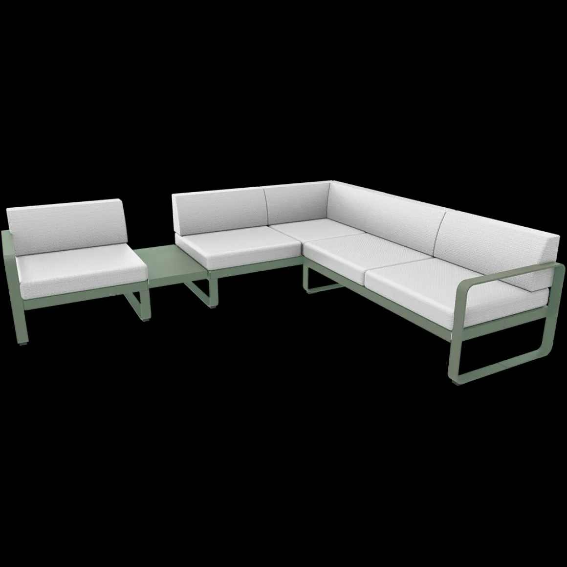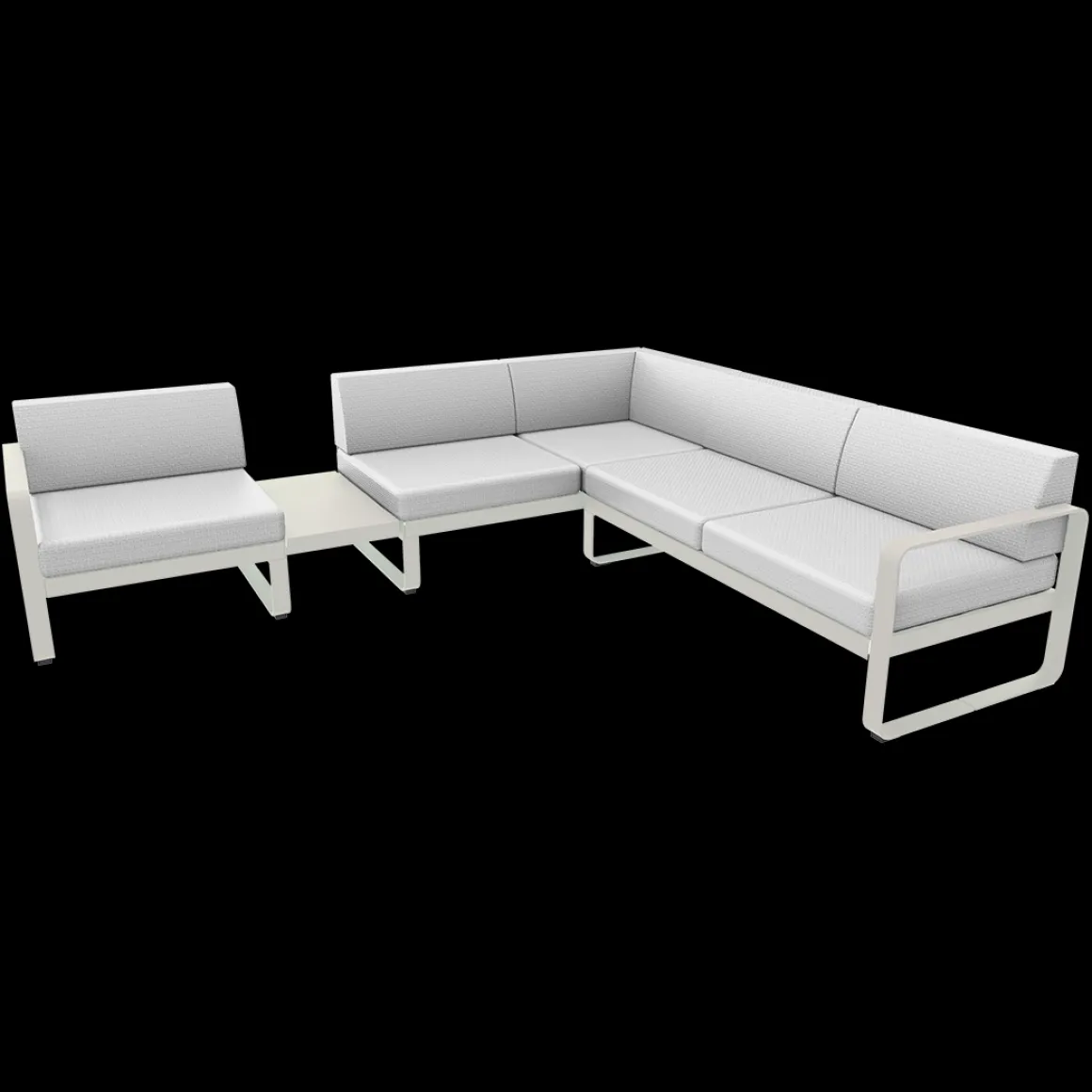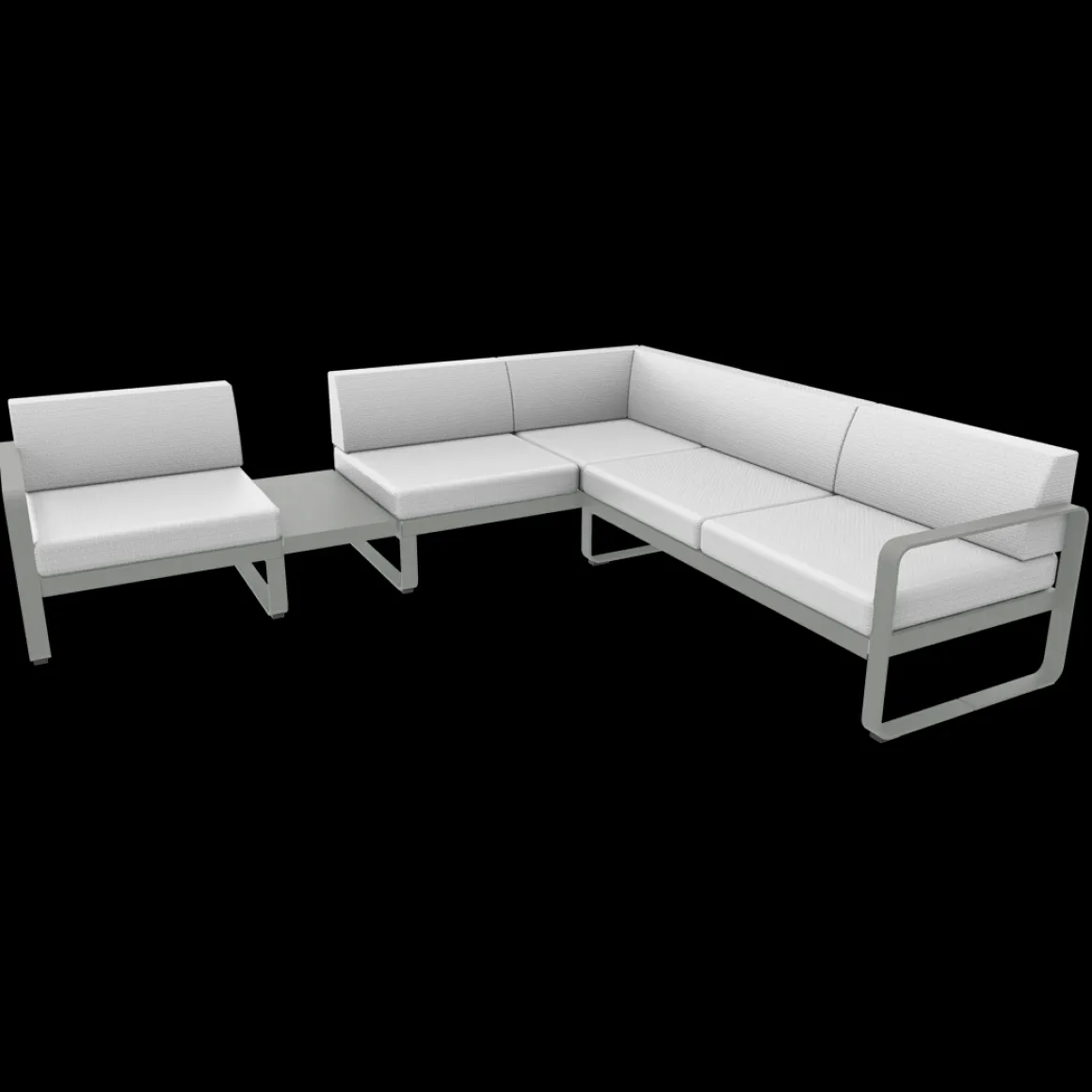 Vous rêvez d’un spacieux canapé, afin d’accueillir de nombreux convives. Et, pour les épater, vous désirez un canapé design… Conçu par un duo connu dans cet univers – le studio Pagnon et Pelhaître -, le canapé Bellevie associe ces deux qualités ! Avec ses 5 généreuses places – voire plus, en se serrant un peu – et ses lignes douces, c’est LE canapé que vous cherchiez… Existe-t-il une configuration plus agréable, pour bien se voir et mener des discussions animées, qu’un canapé formant un angle ? Cet aménagement, testé et approuvé par Fermob, est celui qui vous est proposé dans la composition 3A, qui associe 1 module gauche 1 place, 1 module d’angle 2 places et 1 module droit 2 places. Sans oublier, une ingénieuse tablette de jonction faisant office de table d’appoint, qui permet de poser l’apéro entre les convives ; ou bien une lampe pour prolonger la soirée… Ce canapé avec zone de dépose est d’une solidité à toute épreuve : sa tablette en acier est vissée sur sa structure aluminium. Et toutes deux sont recouvertes de peinture polyester pour faire face aux UV comme aux intempéries. Eux aussi résistants aux UV et intempéries, les coussins de votre canapé Bellevie sont également traités anti-taches et anti-moisissures, et d’ailleurs déhoussables, au cas où ?… Ils sont aussi très doux au toucher, grâce à leur tissu Sunbrella®. Doux ET costauds : l’abrasion et les déchirures ne les guettent pas ! Et enfin, moelleux et fermes tout à la fois ! Le canapé Bellevie offre ainsi un exceptionnel confort d’assise grâce à l’assemblage de mousses haute résilience – mousses à base de polyuréthane choisies par Fermob pour leur capacité à reprendre leur forme initiale après déformation, et cela même après une grande durée d’utilisation ! Faites-vous plaisir avec ce grand canapé d’angle pour un superbe salon d’extérieur, convivial et accueillant. Selon comment est disposée votre terrasse, peut-être est-ce la composition 3B, version inversée de la 3A, qui serait plus adaptée ? A vous de voir !