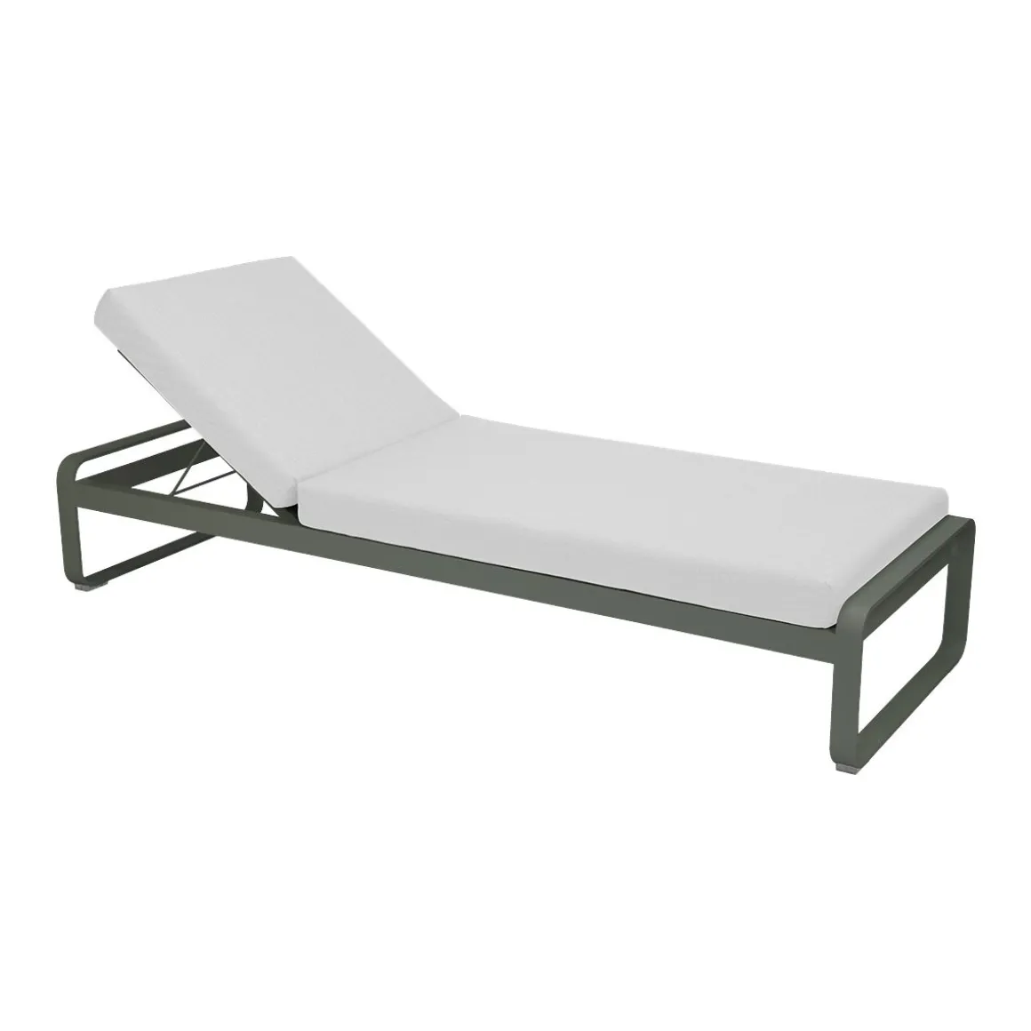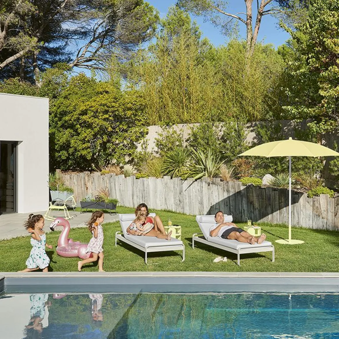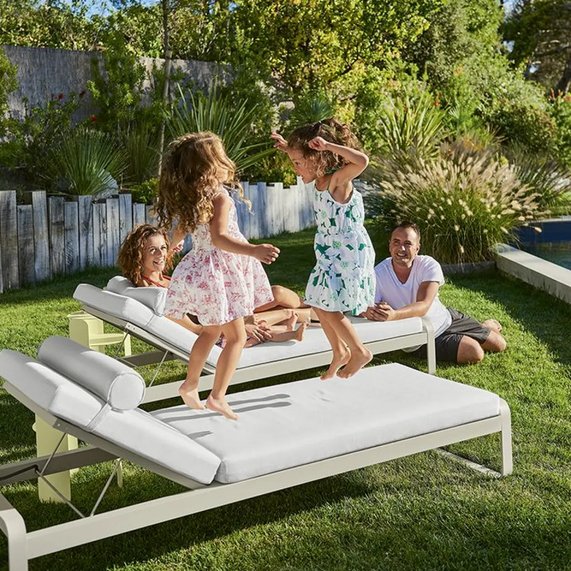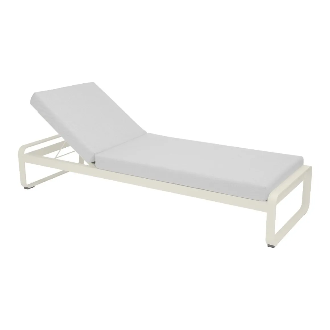Bellevie lit de soleil – Blanc grisé de Fermob. Avec Fermob, la vie est belle, tout autour de vous - dans votre coin repas, dans votre espace lounge, en outdoor comme en indoor, et même au bord de votre piscine…. Avec son lit de soleil Bellevie, signé du studio de design Pagnon et Pelhaître, la marque convoque sous nos yeux cette dolce vita. Et elle élève les standards de la chaise longue à des niveaux jamais atteints. Comment ne pas s’imaginer, allongé, à la belle saison, sous le soleil exactement ? Pour une sieste voluptueuse, au sortir de l’eau de la piscine, en été. Projetez-vous aussi, feuilletant un magazine ou tout simplement, contemplant le vent qui fait bouger les rameaux d’olivier. Ce bain de soleil aux courbes très douces, à l’image de toute la collection Bellevie, offre trois réglages, dont l’un, à plat, afin de piquer du nez. Si vous souhaitez juste vous reposer ou papoter, remontez le dossier de votre transat premium. Et enfin, pour siroter votre cocktail ou lire un roman, redressez-le encore d’un cran. Savourez aussi le confort de son matelas en mousse polyuréthane haute résilience, articulé, et déhoussable afin de pouvoir laver sa housse en machine. Et appréciez la douceur de son tissu Sunbrella®, revêtement outdoor 100% acrylique teint masse, résistant aux taches, à la moisissure, aux déchirures et à l’abrasion. La structure 100% aluminium, de votre bain de soleil haut de gamme est elle aussi ultra-durable, résistante à toute épreuve, même en bord de mer. Petit détail astucieux et hyper appréciable : une grille anti-glisse sous le matelas de votre chaise longue permet de le maintenir bien en place sur sa structure et évite qu’il ne glisse. Cette chaise longue de fabrication française vous promet des heures de bonheur, sur la terrasse de votre piscine. Fermez les yeux et laissez-vous aller… Projetez-vous sur ce bain de soleil et, pour optimiser encore plus son confort, équipez-vous de l’appui-tête de la même collection, spécialement conçu pour s’accrocher au matelas.