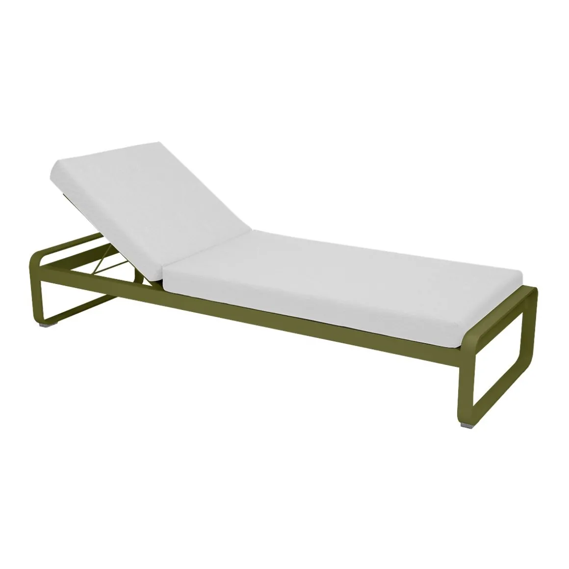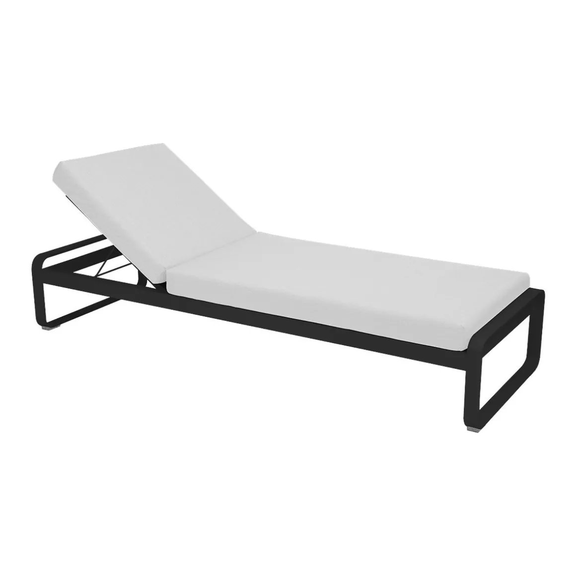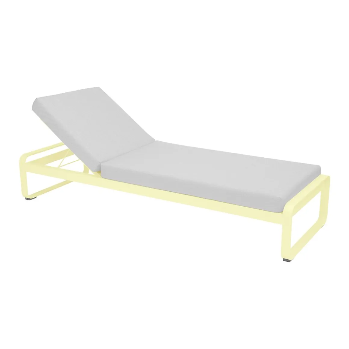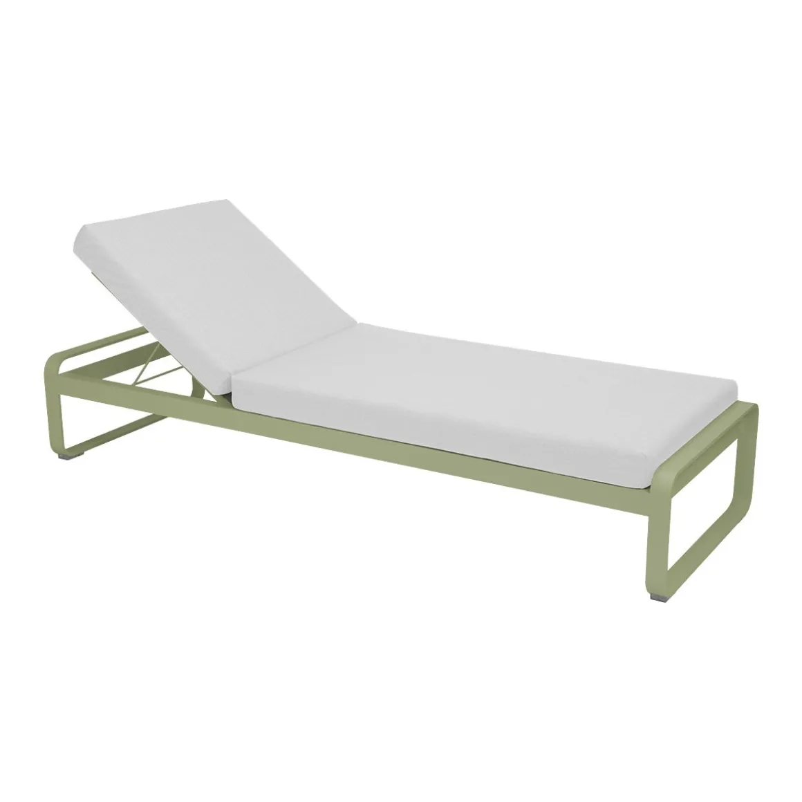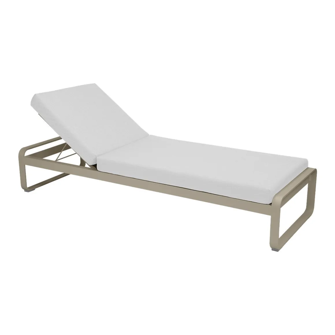 Bellevie lit de soleil – Blanc grisé de Fermob. Avec Fermob, la vie est belle, tout autour de vous - dans votre coin repas, dans votre espace lounge, en outdoor comme en indoor, et même au bord de votre piscine…. Avec son lit de soleil Bellevie, signé du studio de design Pagnon et Pelhaître, la marque convoque sous nos yeux cette dolce vita. Et elle élève les standards de la chaise longue à des niveaux jamais atteints. Comment ne pas s’imaginer, allongé, à la belle saison, sous le soleil exactement ? Pour une sieste voluptueuse, au sortir de l’eau de la piscine, en été. Projetez-vous aussi, feuilletant un magazine ou tout simplement, contemplant le vent qui fait bouger les rameaux d’olivier. Ce bain de soleil aux courbes très douces, à l’image de toute la collection Bellevie, offre trois réglages, dont l’un, à plat, afin de piquer du nez. Si vous souhaitez juste vous reposer ou papoter, remontez le dossier de votre transat premium. Et enfin, pour siroter votre cocktail ou lire un roman, redressez-le encore d’un cran. Savourez aussi le confort de son matelas en mousse polyuréthane haute résilience, articulé, et déhoussable afin de pouvoir laver sa housse en machine. Et appréciez la douceur de son tissu Sunbrella®, revêtement outdoor 100% acrylique teint masse, résistant aux taches, à la moisissure, aux déchirures et à l’abrasion. La structure 100% aluminium, de votre bain de soleil haut de gamme est elle aussi ultra-durable, résistante à toute épreuve, même en bord de mer. Petit détail astucieux et hyper appréciable : une grille anti-glisse sous le matelas de votre chaise longue permet de le maintenir bien en place sur sa structure et évite qu’il ne glisse. Cette chaise longue de fabrication française vous promet des heures de bonheur, sur la terrasse de votre piscine. Fermez les yeux et laissez-vous aller… Projetez-vous sur ce bain de soleil et, pour optimiser encore plus son confort, équipez-vous de l’appui-tête de la même collection, spécialement conçu pour s’accrocher au matelas.
