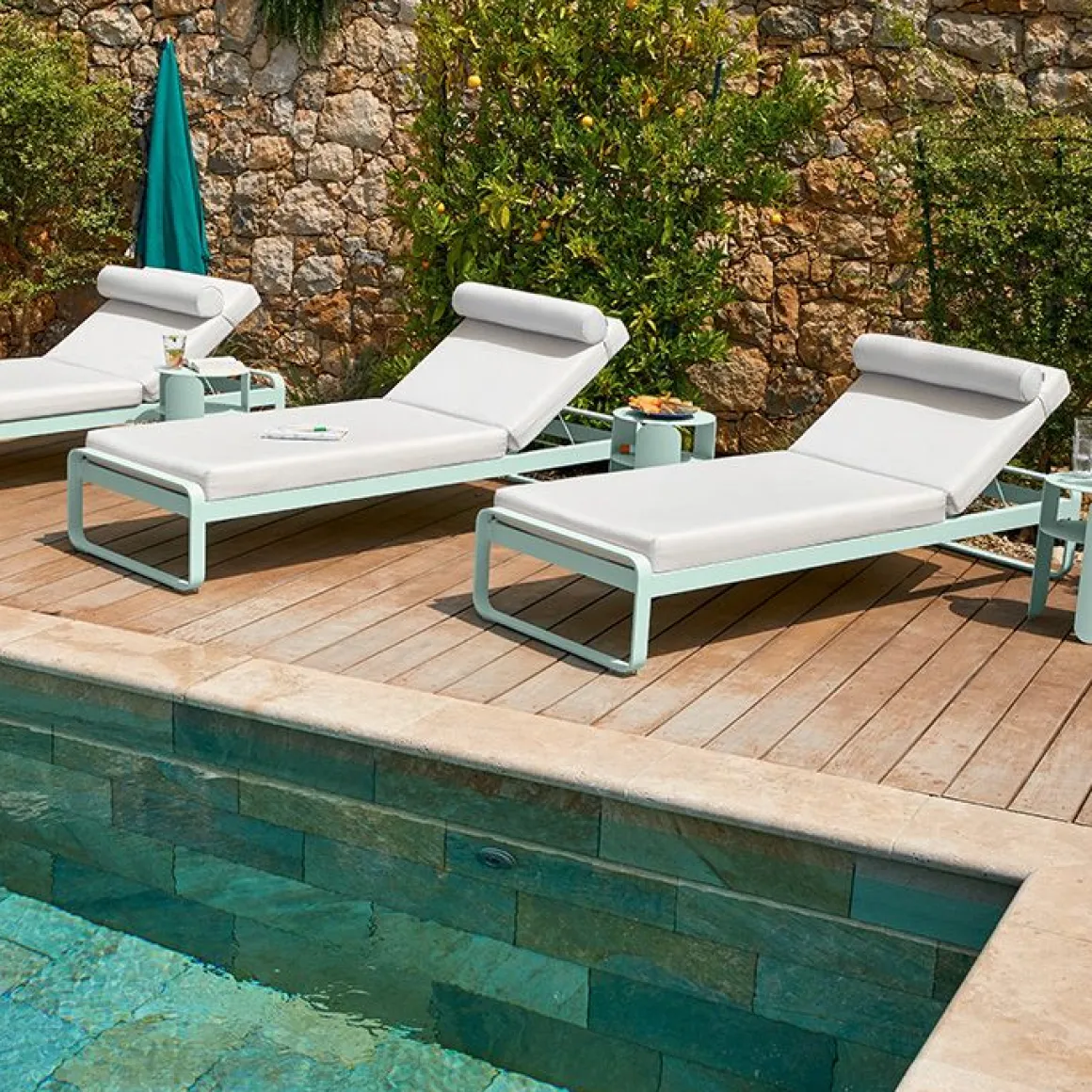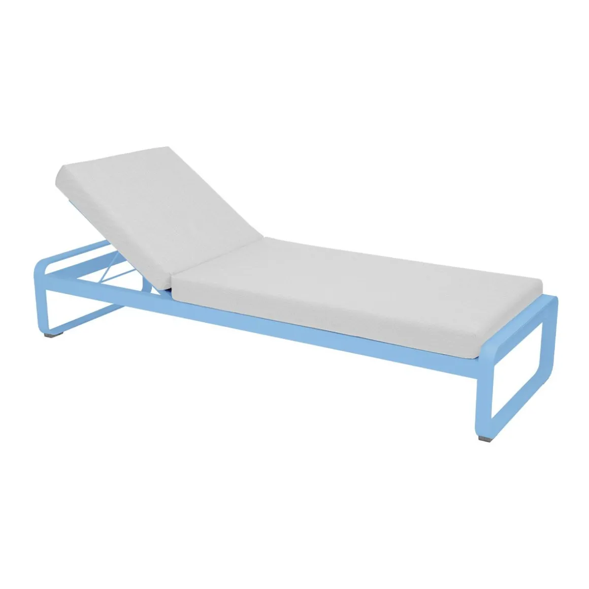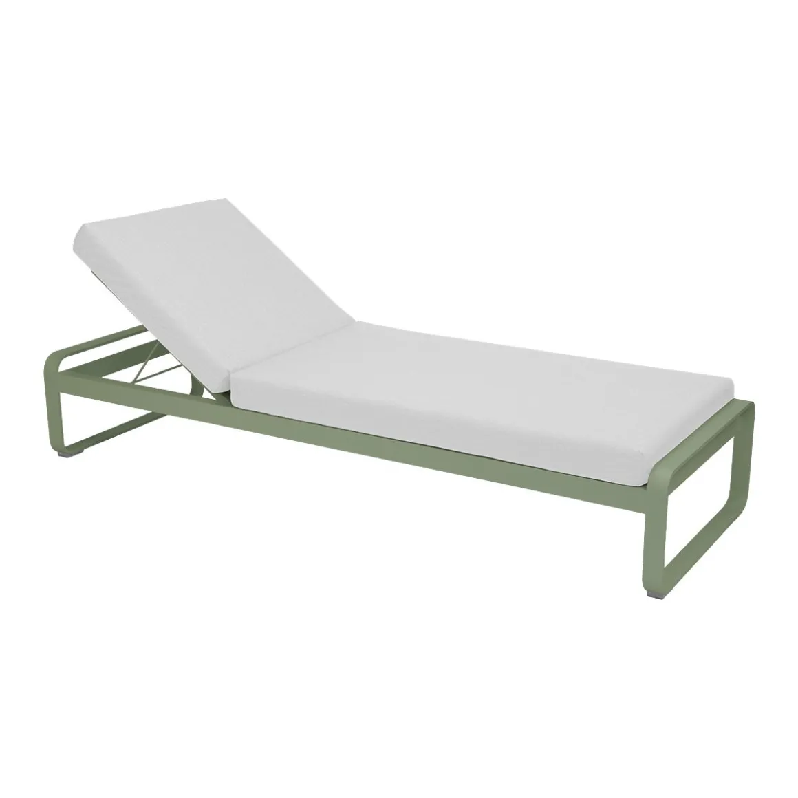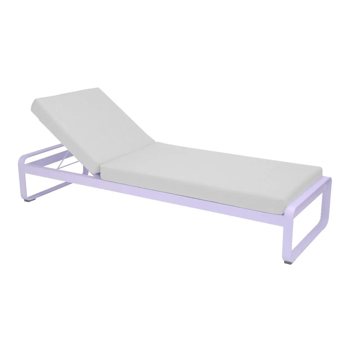 Bellevie lit de soleil – Blanc grisé de Fermob. Avec Fermob, la vie est belle, tout autour de vous - dans votre coin repas, dans votre espace lounge, en outdoor comme en indoor, et même au bord de votre piscine…. Avec son lit de soleil Bellevie, signé du studio de design Pagnon et Pelhaître, la marque convoque sous nos yeux cette dolce vita. Et elle élève les standards de la chaise longue à des niveaux jamais atteints. Comment ne pas s’imaginer, allongé, à la belle saison, sous le soleil exactement ? Pour une sieste voluptueuse, au sortir de l’eau de la piscine, en été. Projetez-vous aussi, feuilletant un magazine ou tout simplement, contemplant le vent qui fait bouger les rameaux d’olivier. Ce bain de soleil aux courbes très douces, à l’image de toute la collection Bellevie, offre trois réglages, dont l’un, à plat, afin de piquer du nez. Si vous souhaitez juste vous reposer ou papoter, remontez le dossier de votre transat premium. Et enfin, pour siroter votre cocktail ou lire un roman, redressez-le encore d’un cran. Savourez aussi le confort de son matelas en mousse polyuréthane haute résilience, articulé, et déhoussable afin de pouvoir laver sa housse en machine. Et appréciez la douceur de son tissu Sunbrella®, revêtement outdoor 100% acrylique teint masse, résistant aux taches, à la moisissure, aux déchirures et à l’abrasion. La structure 100% aluminium, de votre bain de soleil haut de gamme est elle aussi ultra-durable, résistante à toute épreuve, même en bord de mer. Petit détail astucieux et hyper appréciable : une grille anti-glisse sous le matelas de votre chaise longue permet de le maintenir bien en place sur sa structure et évite qu’il ne glisse. Cette chaise longue de fabrication française vous promet des heures de bonheur, sur la terrasse de votre piscine. Fermez les yeux et laissez-vous aller… Projetez-vous sur ce bain de soleil et, pour optimiser encore plus son confort, équipez-vous de l’appui-tête de la même collection, spécialement conçu pour s’accrocher au matelas.