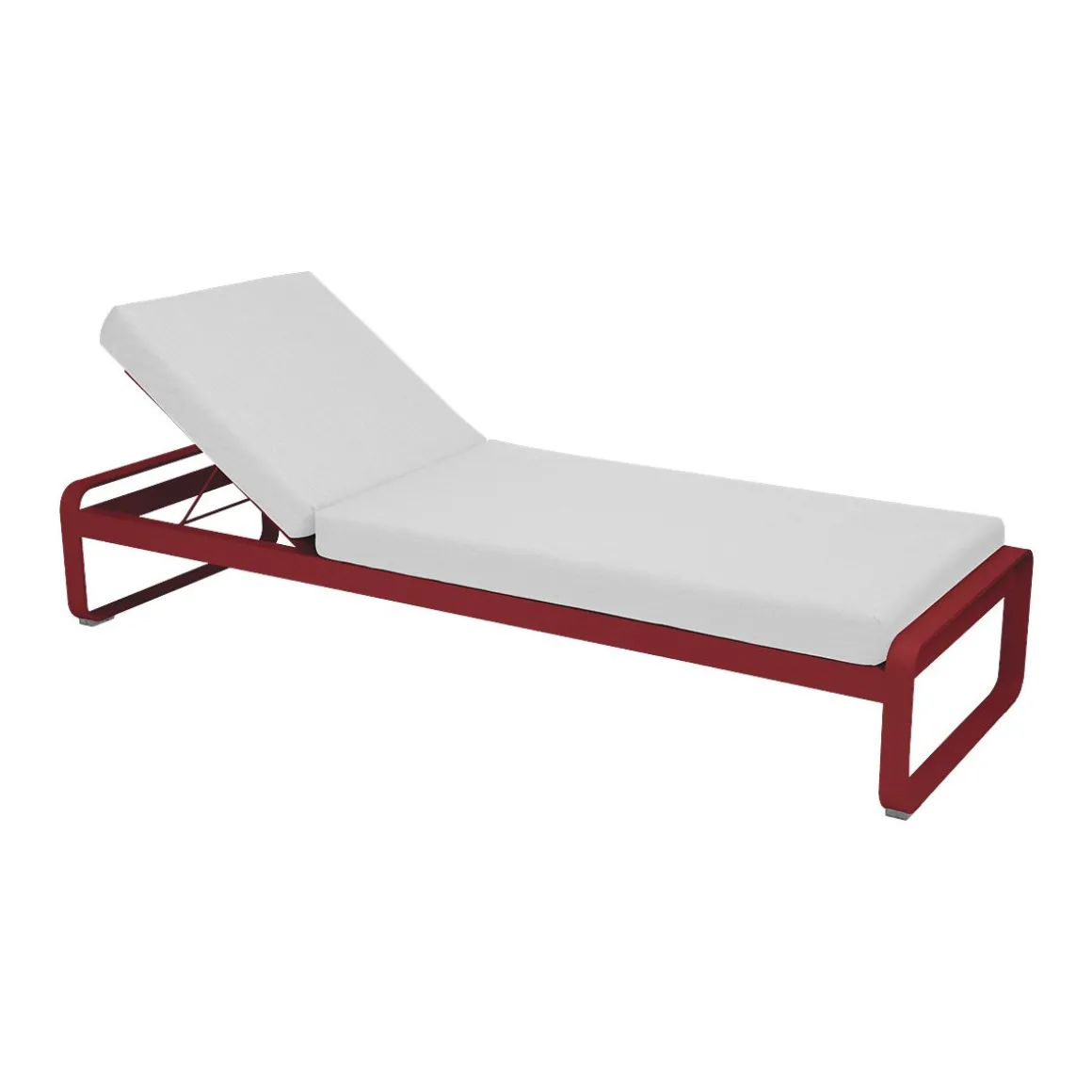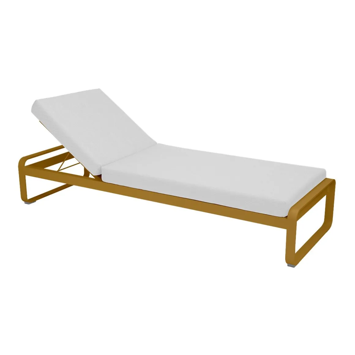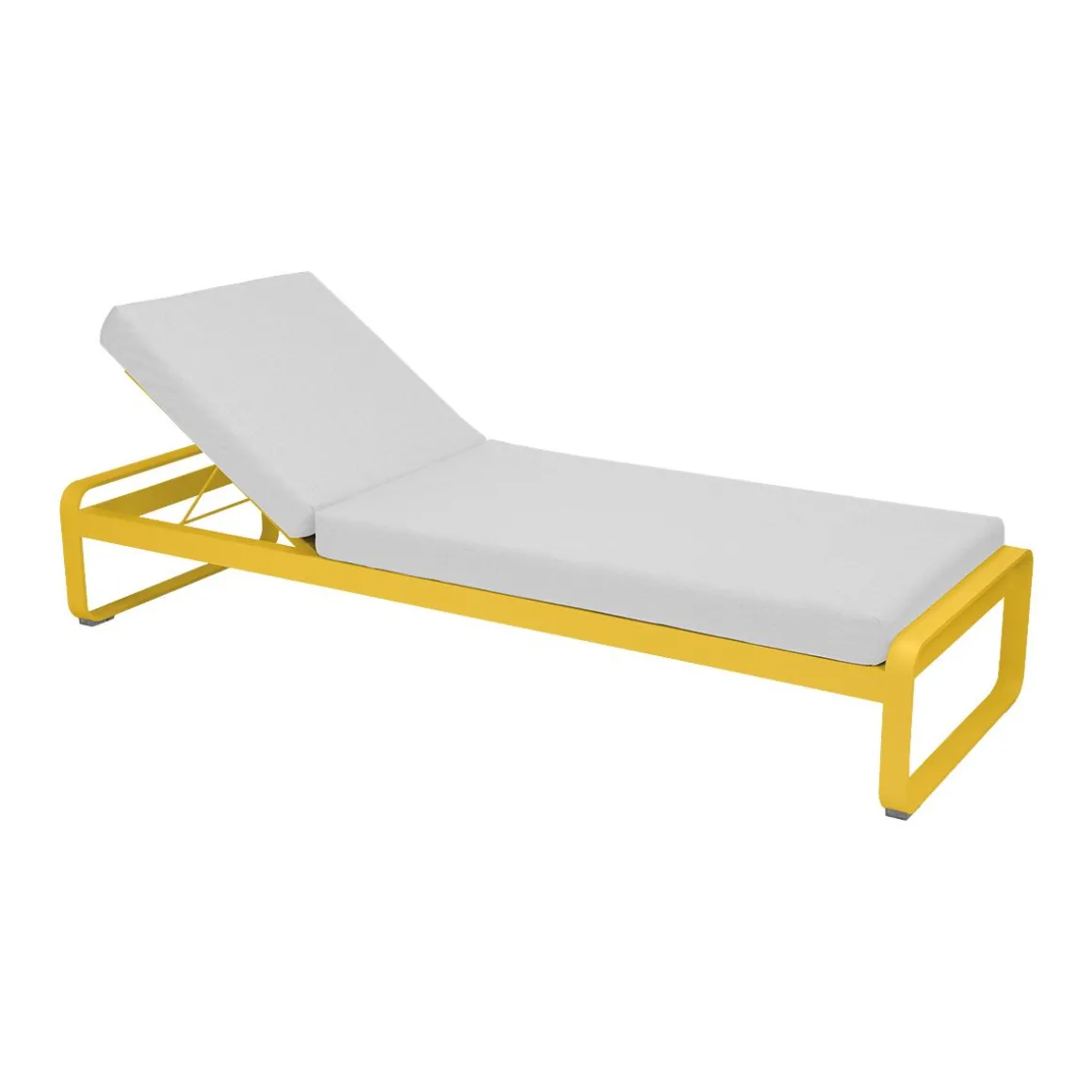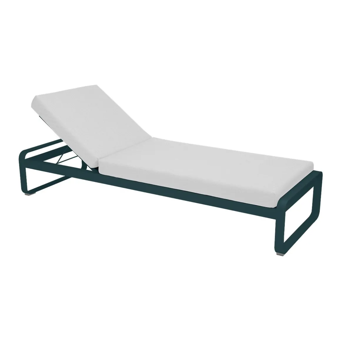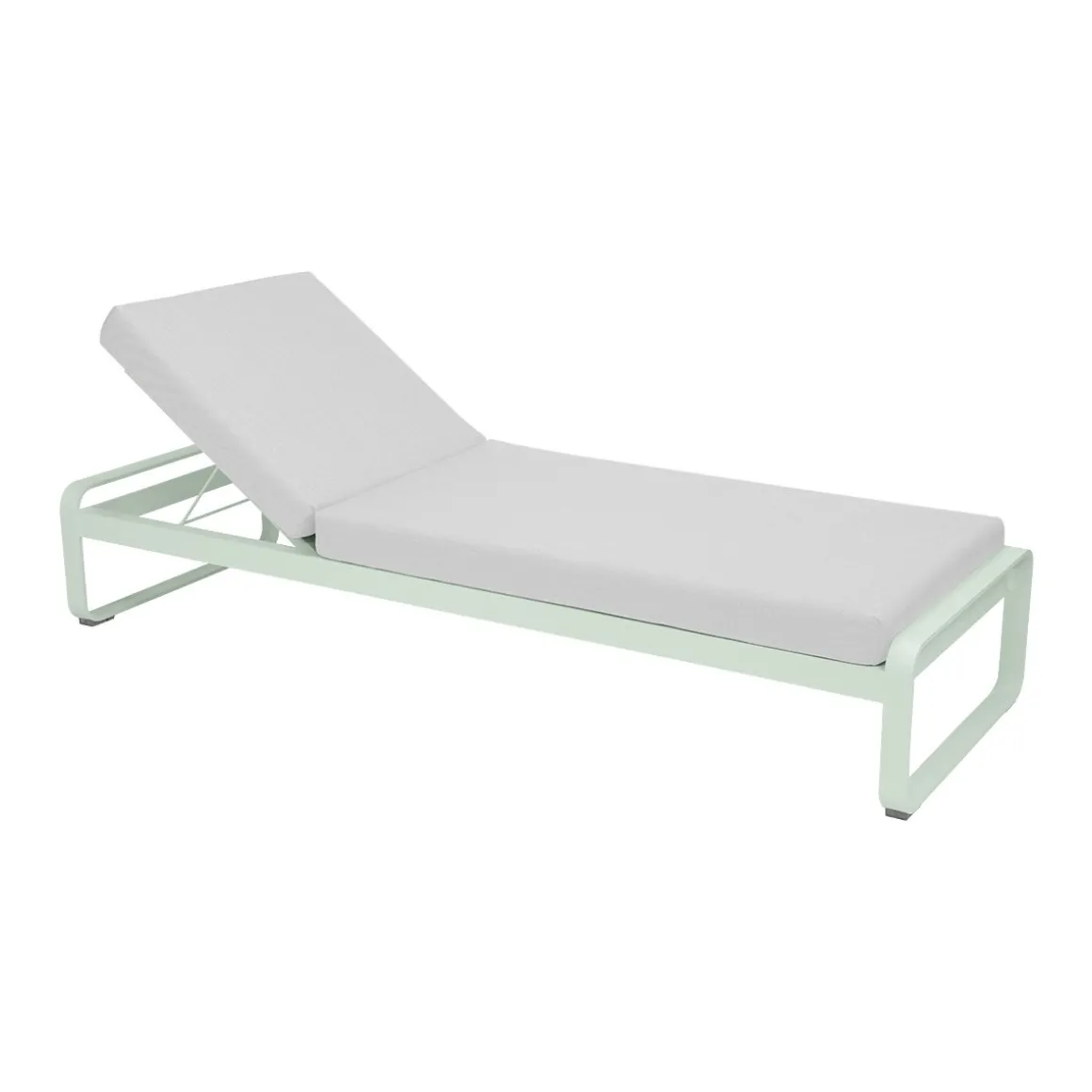 Bellevie lit de soleil – Blanc grisé de Fermob. Avec Fermob, la vie est belle, tout autour de vous - dans votre coin repas, dans votre espace lounge, en outdoor comme en indoor, et même au bord de votre piscine…. Avec son lit de soleil Bellevie, signé du studio de design Pagnon et Pelhaître, la marque convoque sous nos yeux cette dolce vita. Et elle élève les standards de la chaise longue à des niveaux jamais atteints. Comment ne pas s’imaginer, allongé, à la belle saison, sous le soleil exactement ? Pour une sieste voluptueuse, au sortir de l’eau de la piscine, en été. Projetez-vous aussi, feuilletant un magazine ou tout simplement, contemplant le vent qui fait bouger les rameaux d’olivier. Ce bain de soleil aux courbes très douces, à l’image de toute la collection Bellevie, offre trois réglages, dont l’un, à plat, afin de piquer du nez. Si vous souhaitez juste vous reposer ou papoter, remontez le dossier de votre transat premium. Et enfin, pour siroter votre cocktail ou lire un roman, redressez-le encore d’un cran. Savourez aussi le confort de son matelas en mousse polyuréthane haute résilience, articulé, et déhoussable afin de pouvoir laver sa housse en machine. Et appréciez la douceur de son tissu Sunbrella®, revêtement outdoor 100% acrylique teint masse, résistant aux taches, à la moisissure, aux déchirures et à l’abrasion. La structure 100% aluminium, de votre bain de soleil haut de gamme est elle aussi ultra-durable, résistante à toute épreuve, même en bord de mer. Petit détail astucieux et hyper appréciable : une grille anti-glisse sous le matelas de votre chaise longue permet de le maintenir bien en place sur sa structure et évite qu’il ne glisse. Cette chaise longue de fabrication française vous promet des heures de bonheur, sur la terrasse de votre piscine. Fermez les yeux et laissez-vous aller… Projetez-vous sur ce bain de soleil et, pour optimiser encore plus son confort, équipez-vous de l’appui-tête de la même collection, spécialement conçu pour s’accrocher au matelas.