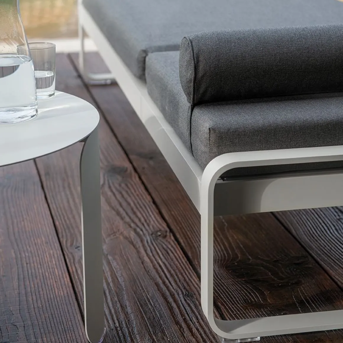 Matériaux : structure aluminium, lit tôle aluminium perforée, tissu outdoor acrylique teinte masse (Sunbrella®), garnissage mousse polyuréthane haute résilience