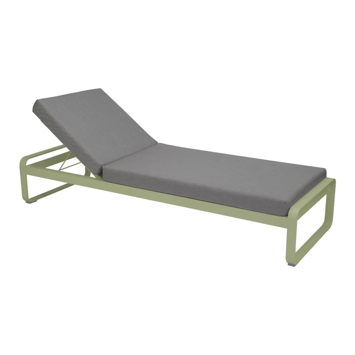 Bellevie lit de soleil – Gris flanelle de Fermob. Avec Fermob, la vie est belle, tout autour de vous - dans votre coin repas, dans votre espace lounge, en outdoor comme en indoor, et même au bord de votre piscine…. Avec son lit de soleil Bellevie, signé du studio de design Pagnon et Pelhaître, la marque convoque sous nos yeux cette dolce vita. Et elle élève les standards de la chaise longue à des niveaux jamais atteints. Comment ne pas s’imaginer, allongé, à la belle saison, sous le soleil exactement ? Pour une sieste voluptueuse, au sortir de l’eau de la piscine, en été. Projetez-vous aussi, feuilletant un magazine ou tout simplement, contemplant le vent qui fait bouger les rameaux d’olivier. Ce bain de soleil aux courbes très douces, à l’image de toute la collection Bellevie, offre trois réglages, dont l’un, à plat, afin de piquer du nez. Si vous souhaitez juste vous reposer ou papoter, remontez le dossier de votre transat premium. Et enfin, pour siroter votre cocktail ou lire un roman, redressez-le encore d’un cran. Savourez aussi le confort de son matelas en mousse polyuréthane haute résilience, articulé, et déhoussable afin de pouvoir laver sa housse en machine. Et appréciez la douceur de son tissu Sunbrella®, revêtement outdoor 100% acrylique teint masse, résistant aux taches, à la moisissure, aux déchirures et à l’abrasion. La structure 100% aluminium, de votre bain de soleil haut de gamme est elle aussi ultra-durable, résistante à toute épreuve, même en bord de mer. Petit détail astucieux et hyper appréciable : une grille anti-glisse sous le matelas de votre chaise longue permet de le maintenir bien en place sur sa structure et évite qu’il ne glisse. Cette chaise longue de fabrication française vous promet des heures de bonheur, sur la terrasse de votre piscine. Fermez les yeux et laissez-vous aller… Projetez-vous sur ce bain de soleil et, pour optimiser encore plus son confort, équipez-vous de l’appui-tête de la même collection, spécialement conçu pour s’accrocher au matelas.