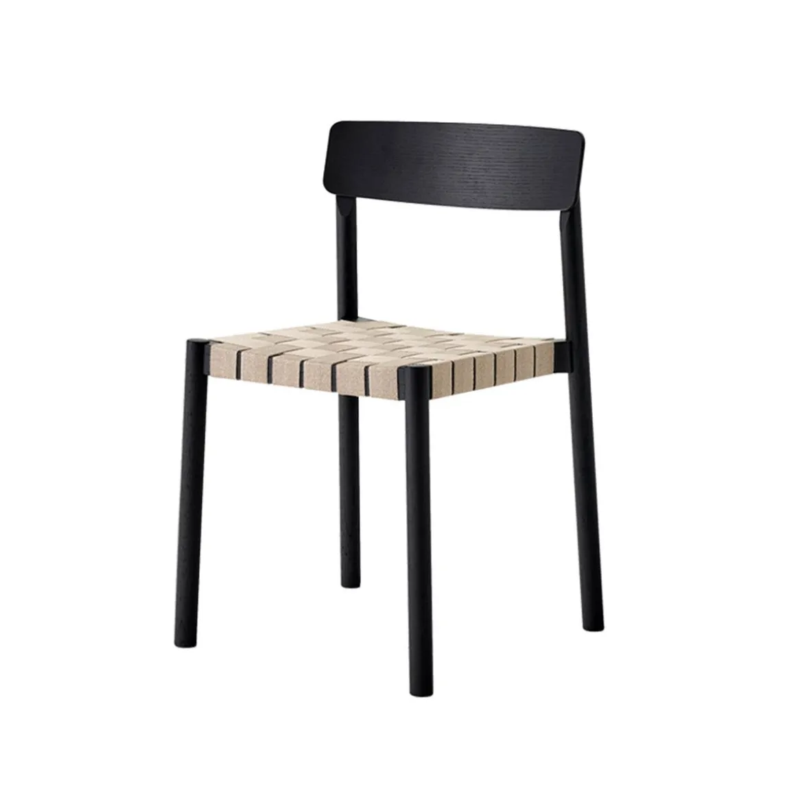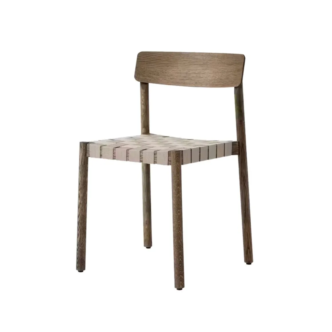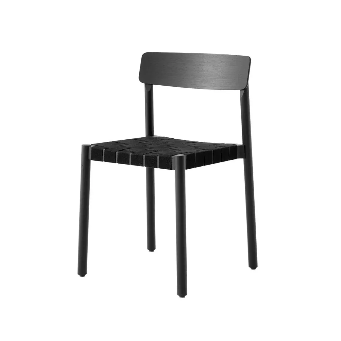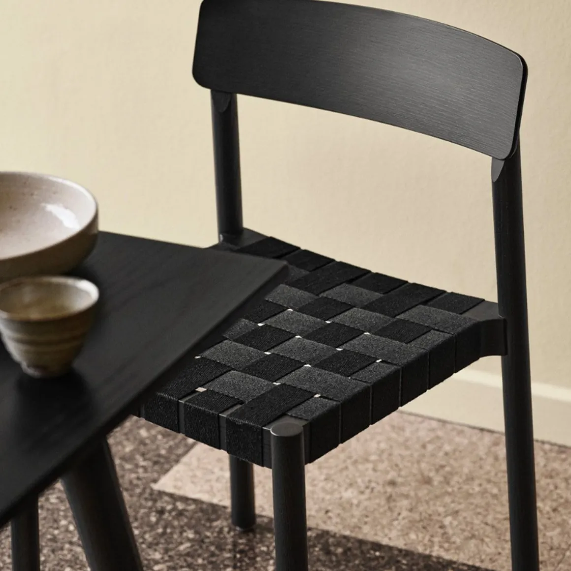 Betty Tk1 de &Tradition par Thau & Kallio. Nommée d’après le théâtre Betty Nansen de Copenhague, cette chaise empilable est disponible en deux versions : une avec une assise en sangles apparentes fabriquées à partir de fibres de lin naturelles et une autre avec une assise en bois massif.