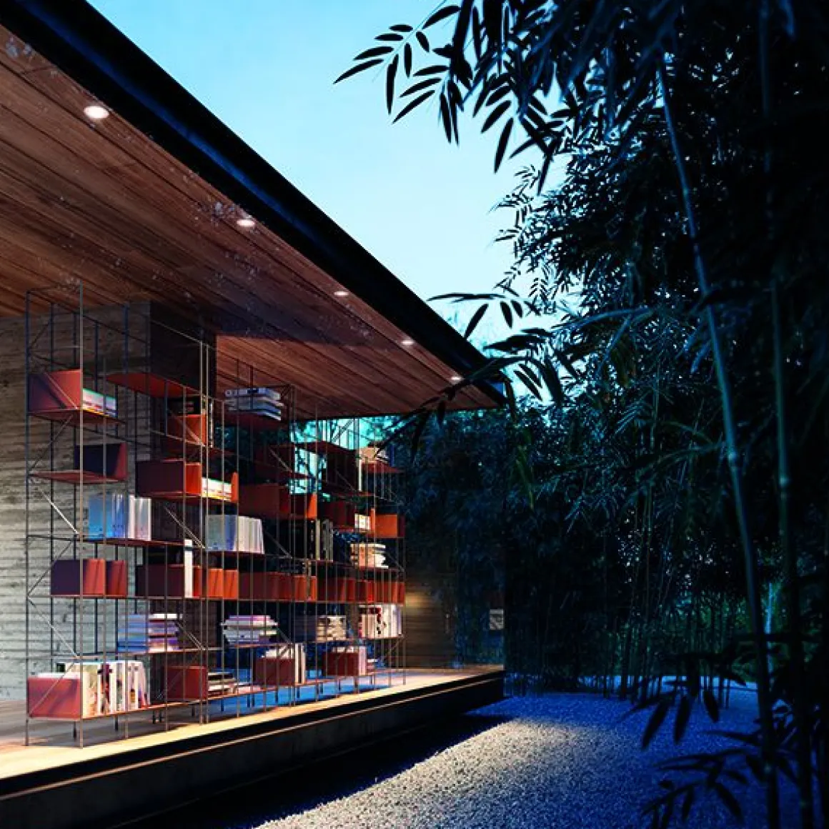 La bibliothèque Network est pratique et fonctionnelle et se compose d’une structure métallique avec ses étagères ouvertes.