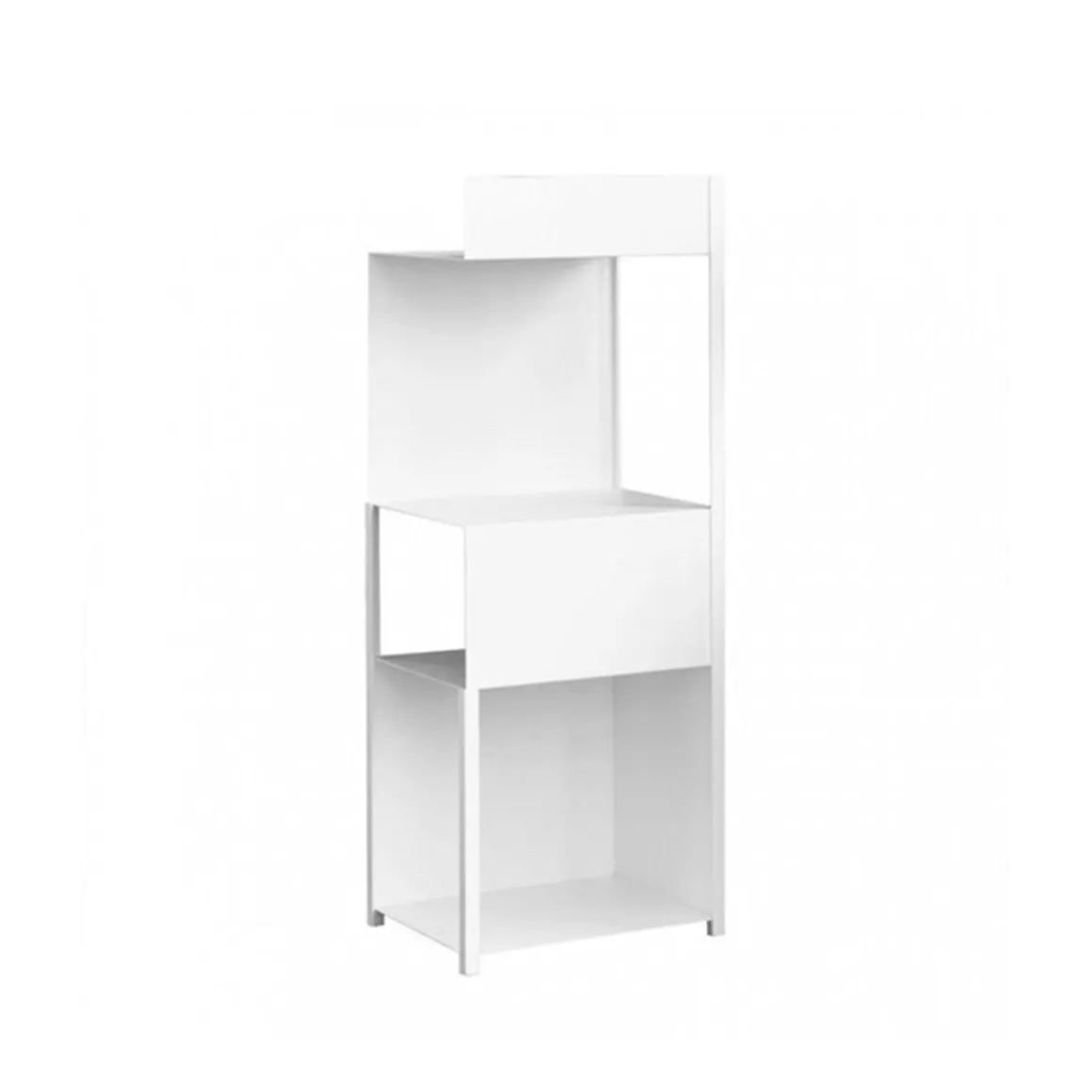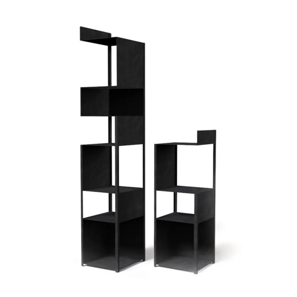 Matériaux : bibliothèque colonne en deux hauteurs, structure en tôle d’acier découpée et courbée épaisseur 1,5 mm, avec supports en acier à cornières, peinture époxy