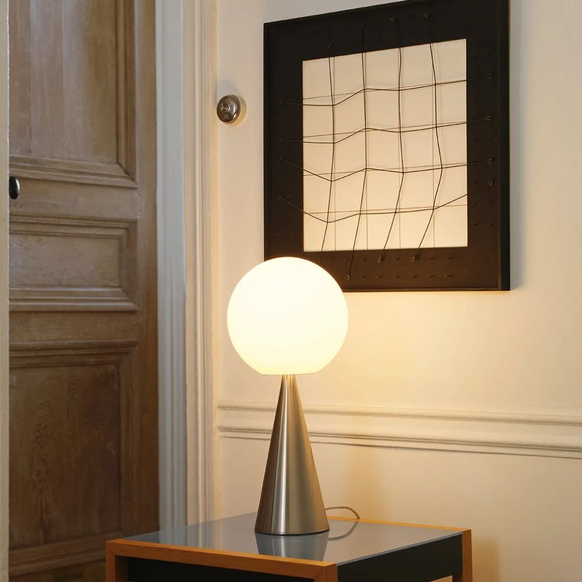 Un cône et une sphère : deux formes géométriques essentielles et identifiables. Une composition simple, qu’enrichissement l’extraordinaire équilibre des propositions et l’élgance discrète des matériaux non réfléchissants : le diffuseur est réalisé en verre soufflé satiné et la structure en métal nickelé brossé. Rien d’autre qu’une boule posée, dans un équilibre apparement impossible, sur un cône qui sert de base. Une des nombreuses magies de composition de Gio Ponti. L’opposition de deux formes géométriques élémentaires donne naissance à un objet original et aux proportions parfaites. La lumière est diffuse et l’émission lumineuse est mise en valeur par l’essentialité géométique du dessin.