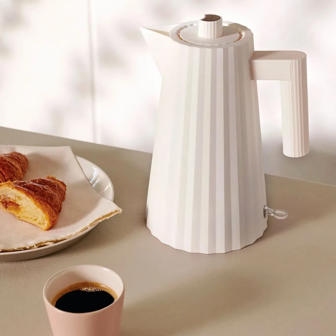 Bouilloire électrique Plissé de Alessi par Michele De Lucchi. La bouilloire Plissé marie les aspects fonctionnels à un design plastique et fascinant, révélant la formation d’architecte de son auteur ainsi que ses passions pour l’artisanat et la sculpture. Tel un tissu dont les myriades de plis créent un objet tridimensionnel, cette bouilloire rappelle un habit haute couture, un splendide objet à arborer sur un plan de la cuisine.