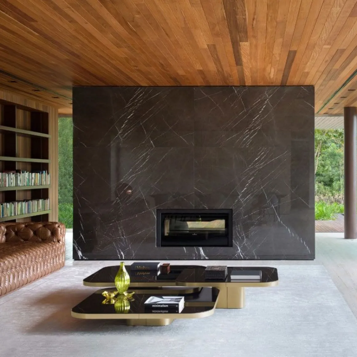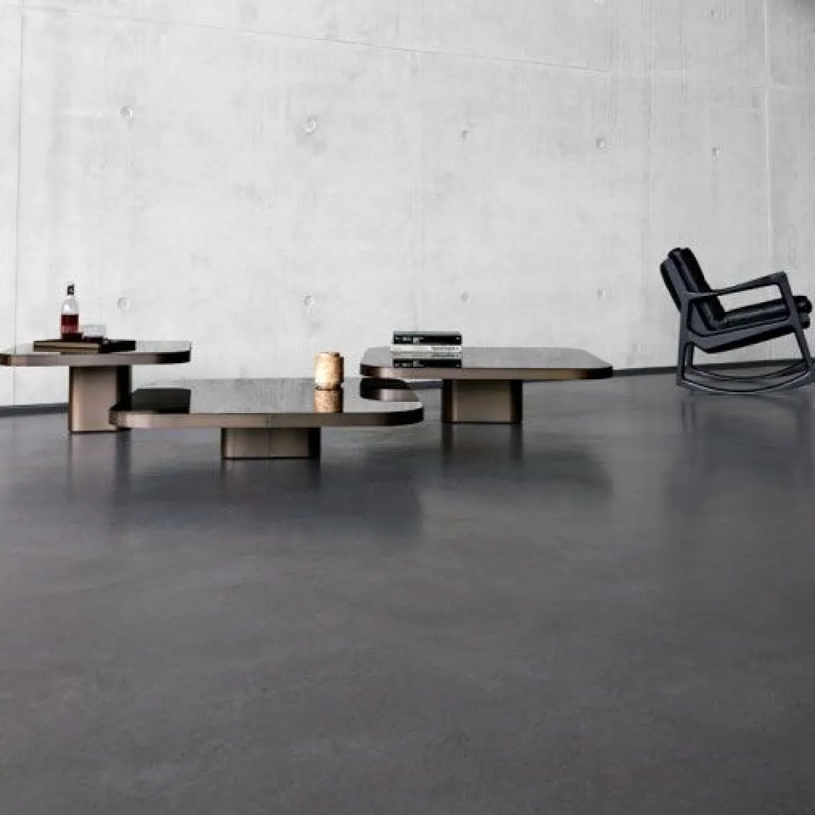 Le plateau de table recouvert d´une surface en verre ou en marbre semble flotter sur son socle aux coins arrondis.