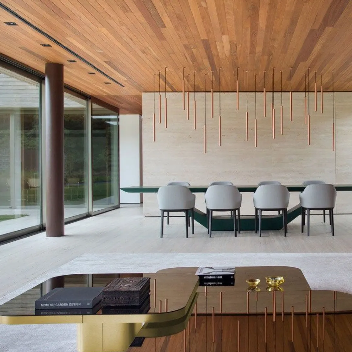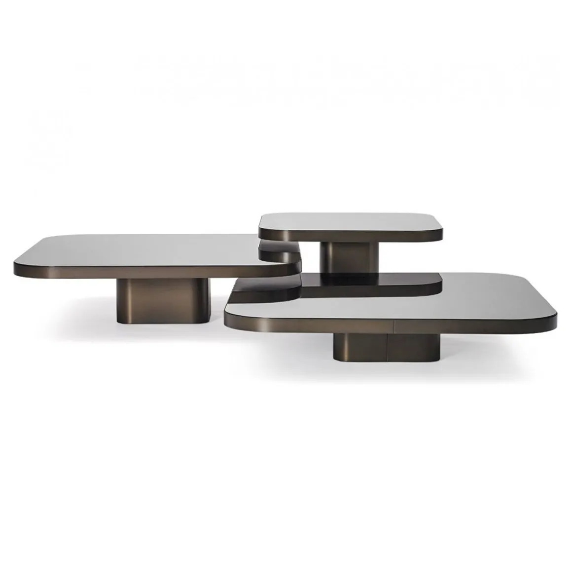 Les trois tailles sont harmonisées de manière à ce que les tables puissent être disposées individuellement ou en groupe, et aussi grâce aux plateaux de tables superposés, comme une sculpture dynamique.