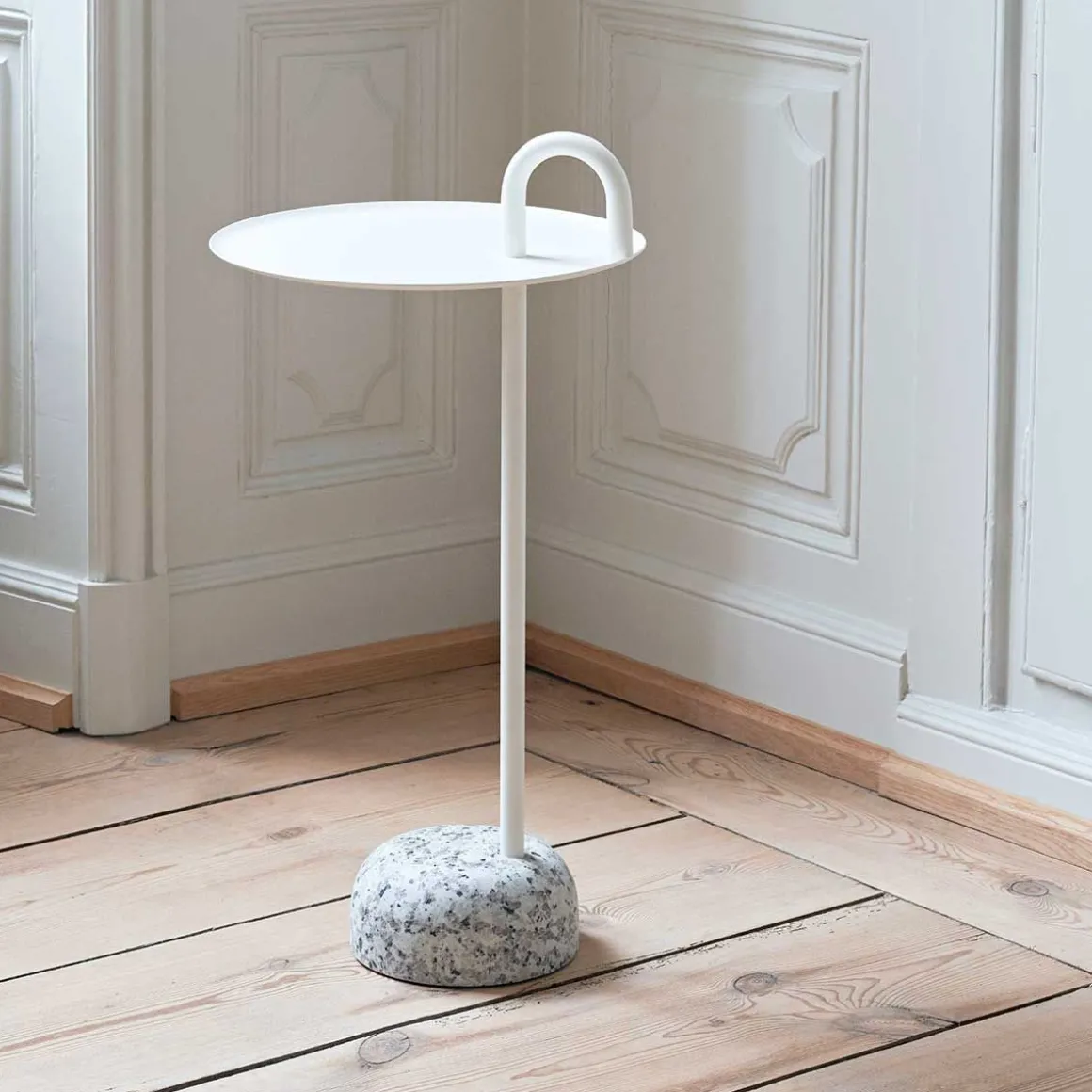 Matériaux : Plateau tôle pressée laquée ; Poignée acier laqué ; Base granit