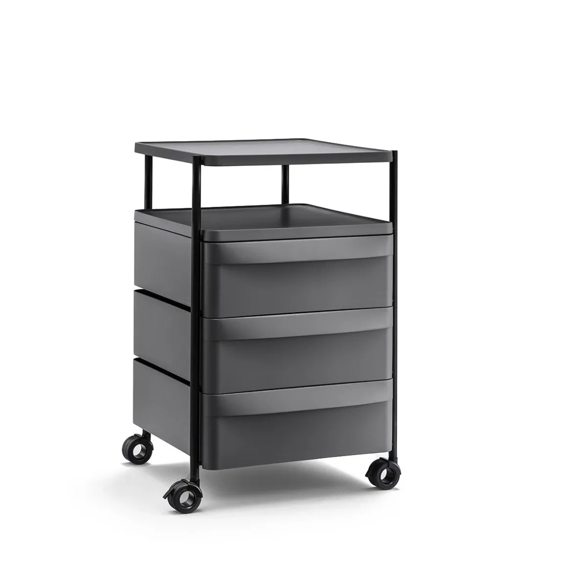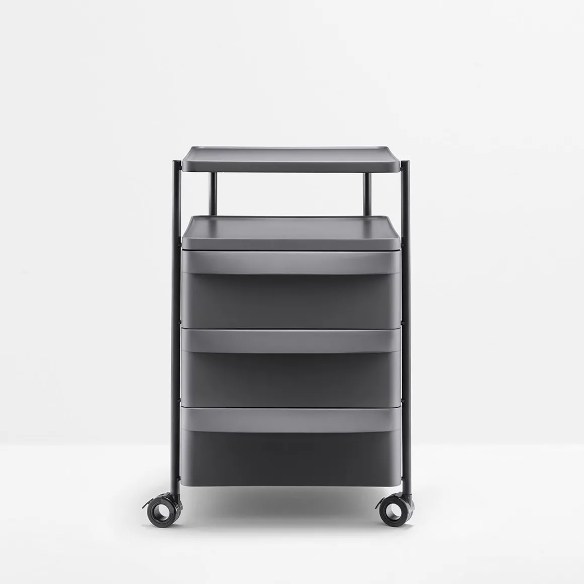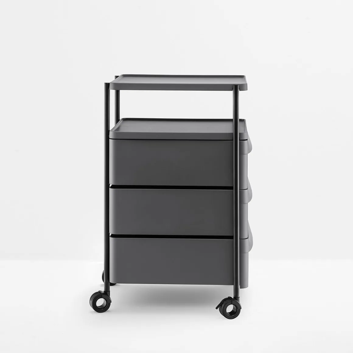Boxie est un système de stockage aux lignes minimales et essentielles, remarquable par sa légèreté qui est garantie par un cadre en acier revêtu équipé de tiroirs alternés avec des plateaux, tous deux réalisés en polypropylène. Système équipé d’un dessus et de trois tiroirs, équipé d’une poignée intégrée et de roues pivotantes et verrouillables.