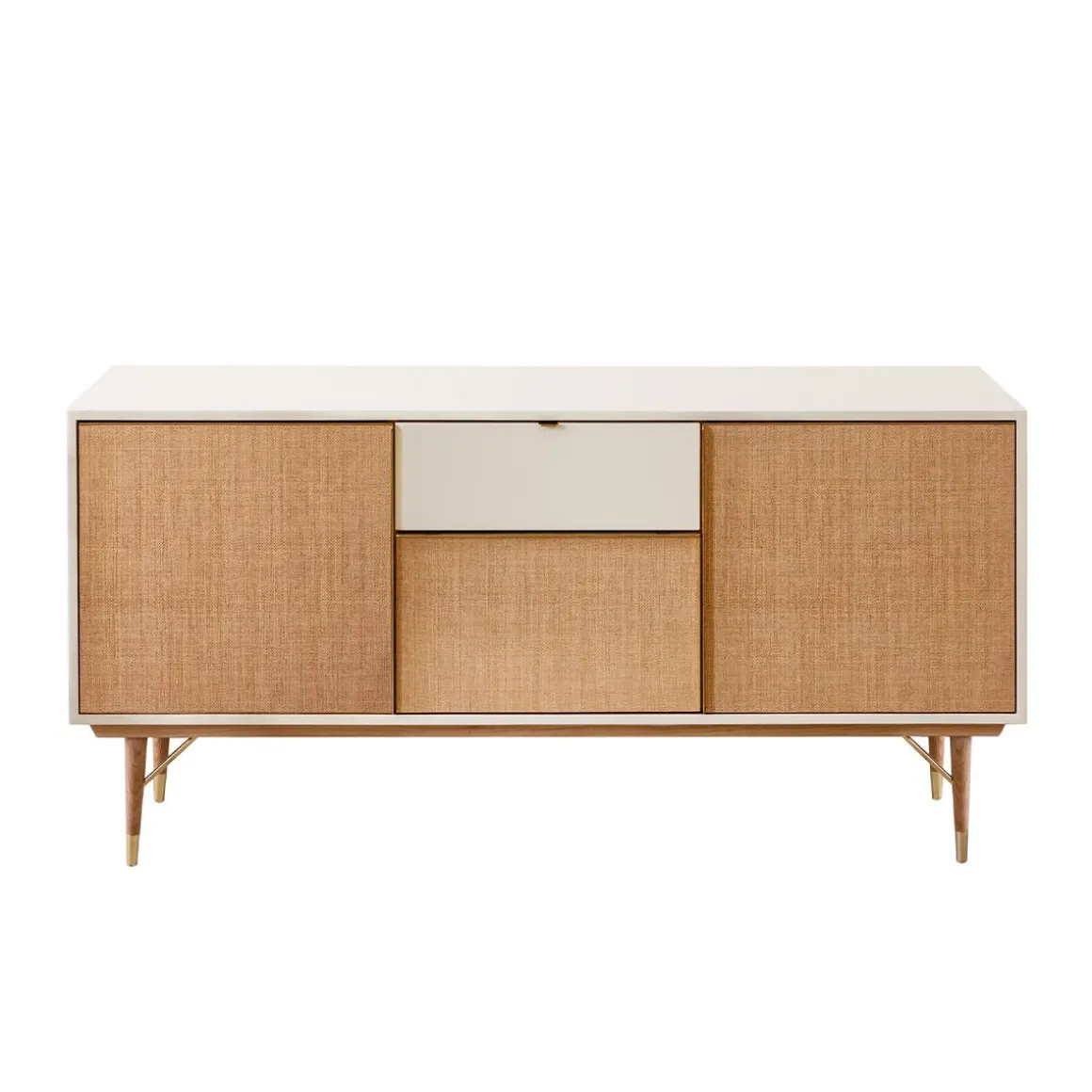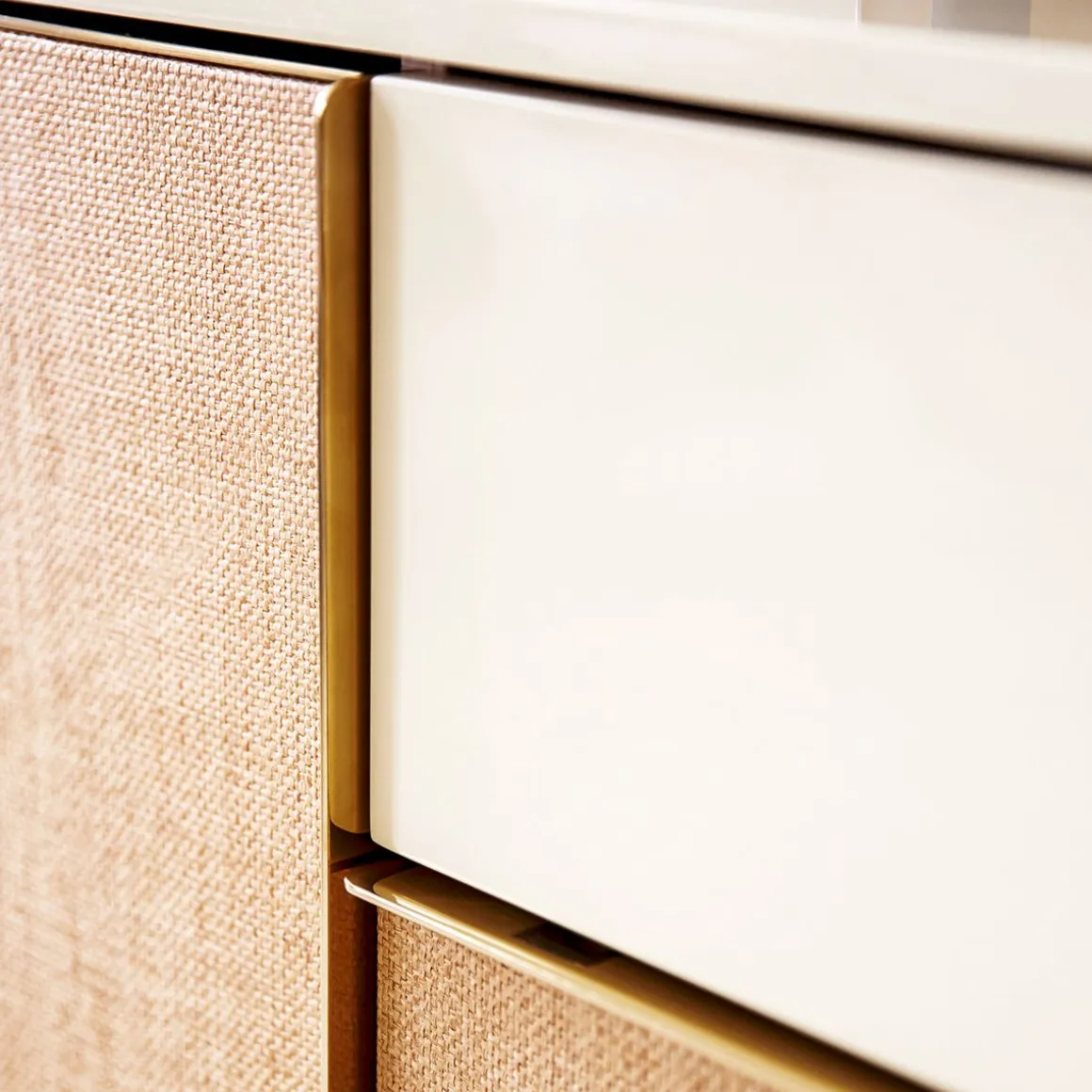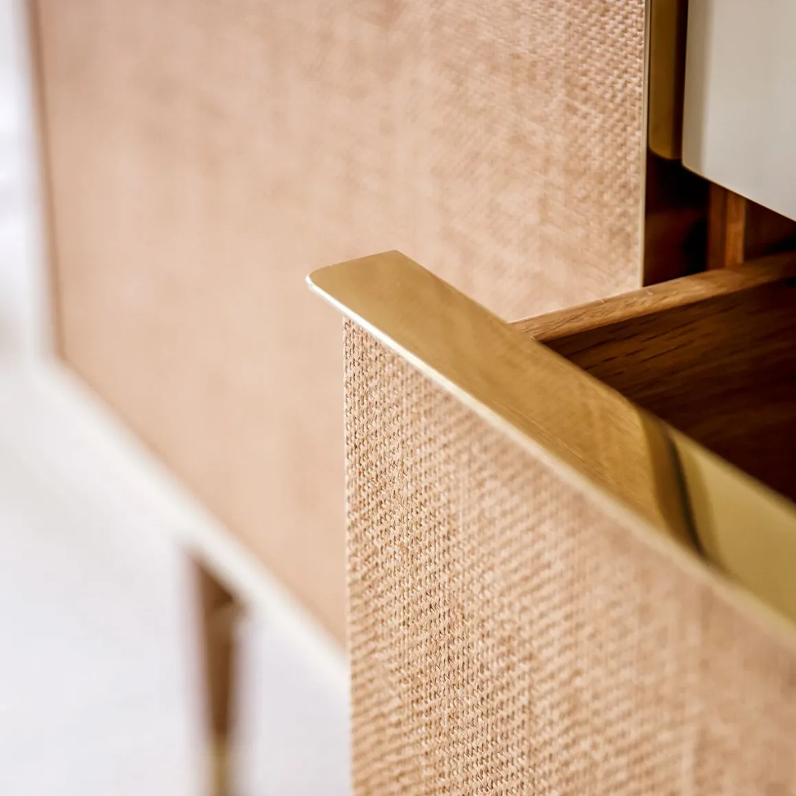 Chicissime et élancée, l’enfilade Capri a le choix du « dress code ». Fibres tissées se marient au miroir ou à la laque noire pour une tenue « Black Tie » sophistiquée. Pour les oiseaux de jour la fibre naturelle se marie également à une laque ivoire pour une tenue « casual » qui ne manque pas de panache. Que cet élégant meuble ne dise pas qu’il n’a rien à se mettre !