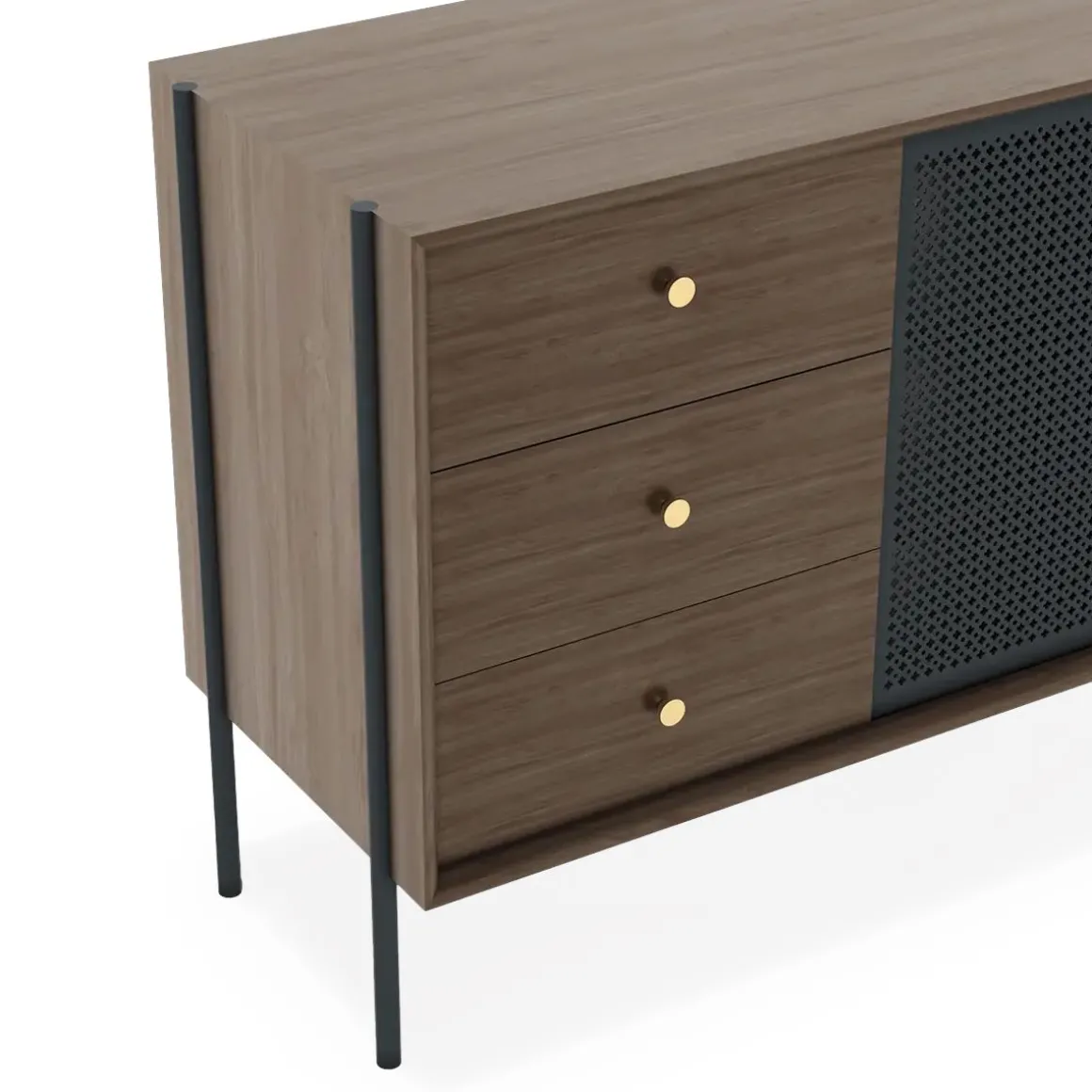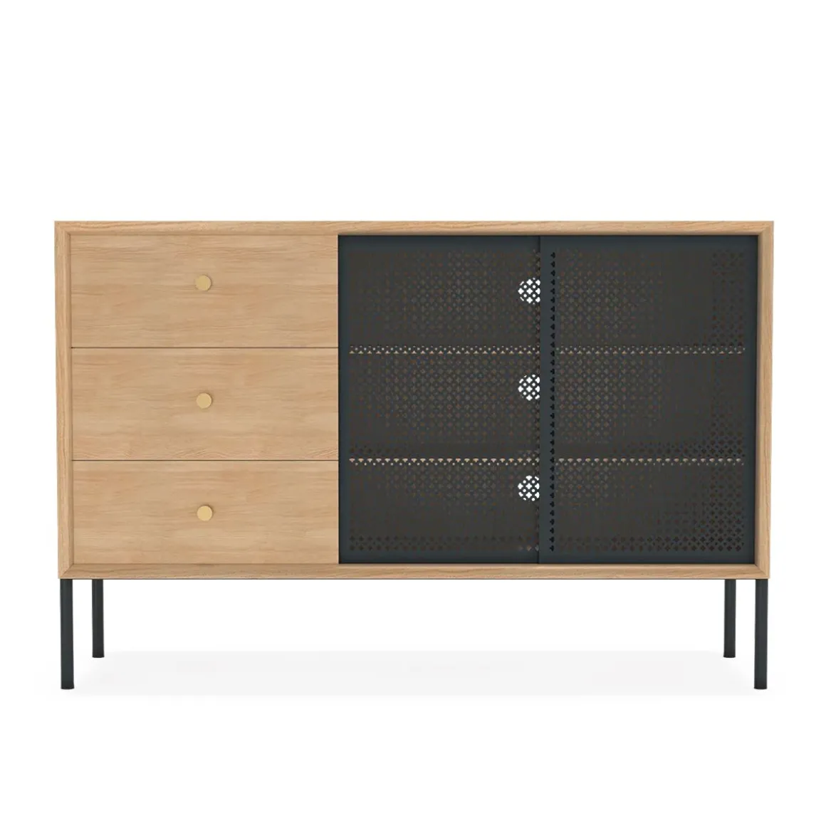 Avec ses lignes très structurées qui jouent habillement avec le motif nul d’abeille de ses portes ajourées en métal, le buffet haut Gabin apporte où qu’il se pose une touche d’élégance et de modernité. Installé dans le séjour ou la salle à manger, il sait se faire à la fois très présent, tout en apportant une touche de délicatesse. Avec ses lignes droites et contemporaines de 80 cm de haut et 122 cm de long, le buffet haut Gabin, comme l’ensemble de la collection du même nom, marie habillement le touché doux du bois et un métal ciselé tel une dentelle. Sa vitrine coulissante en métal perforé, inspirée du cannage des appartements haussmannien, dévoile une personnalité aussi affirmée que raffinée. Le buffet haut Gabin est conçu au Portugal avec le plus grand soin. Il se compose d’une structure métallique gris ardoise texturé et bois et de deux portes métalliques ajourées gris clair ou gris ardoise texturé. Enfin, Gabin met trois tiroirs en plaqué chêne à votre disposition. Chacun est orné d’un élégant bouton en laiton brossé… Comme une délicate attention !