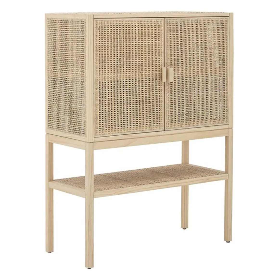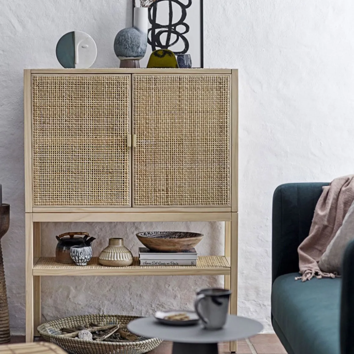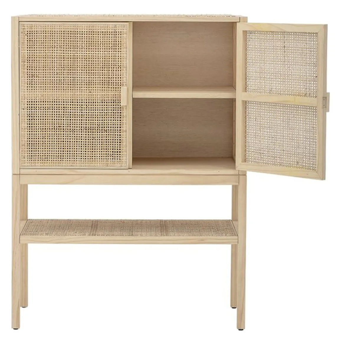 Matériaux : structure en contreplaqué de pin naturel et MDF, cannage de rotin naturel, deux portes avec aménagement intérieur : une étagère avec quatre compartiments