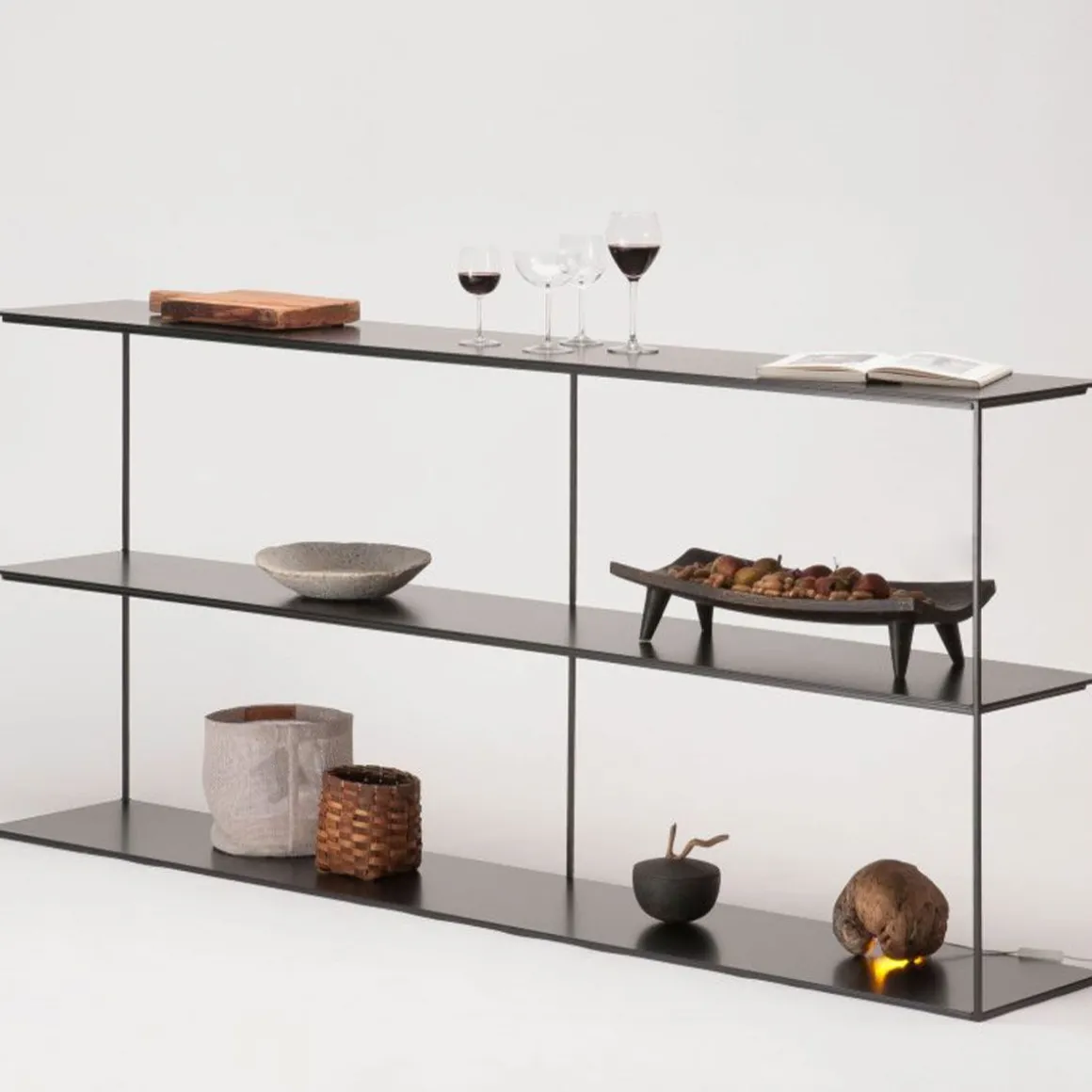 Dessinée par Maurizio Peregalli, la console en acier peint SLIM IRONY de Zeus est très élégante et s’intègre parfaitement dans tous les intérieurs, qu’ils soient modernes ou classiques. Fonctionnelle et minimaliste, la console Slim Irony possède un espace entre les tablettes de 40 cm. Etagère à 3 tablettes, en deux dimensions. Profilés en acier carré plein 8 x 8 mm et plateaux en tôle d’acier épaisseur 2 mm.