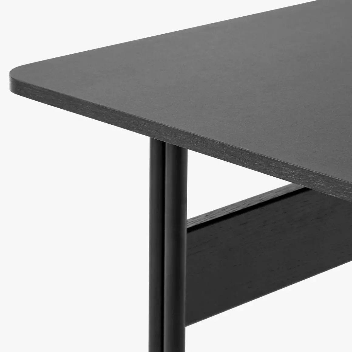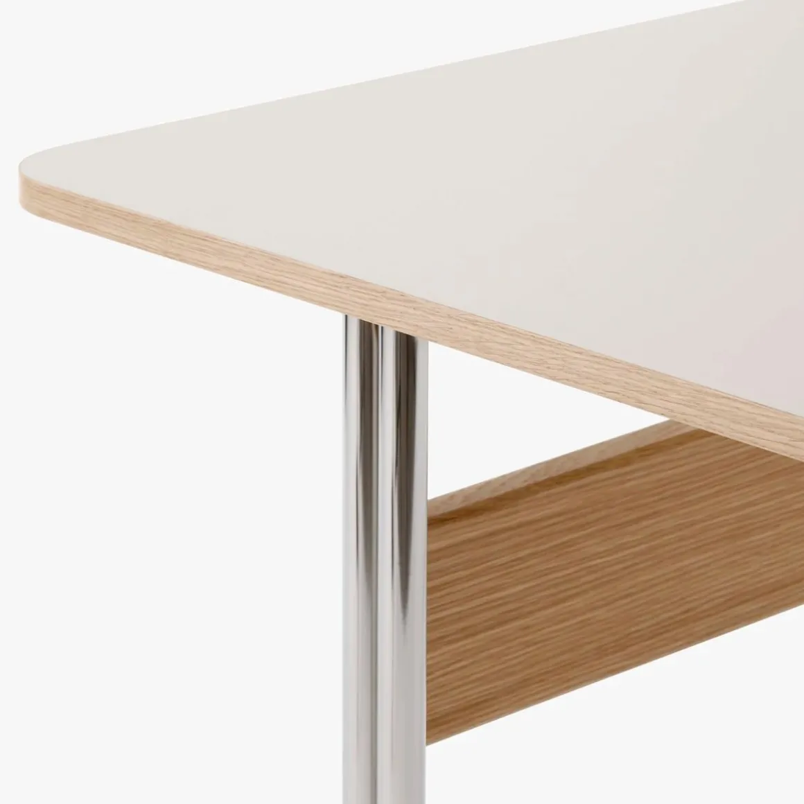 Matériaux : plateau stratifié avec du linoléum et bords plaqués, pieds en tubes d’acier pliés