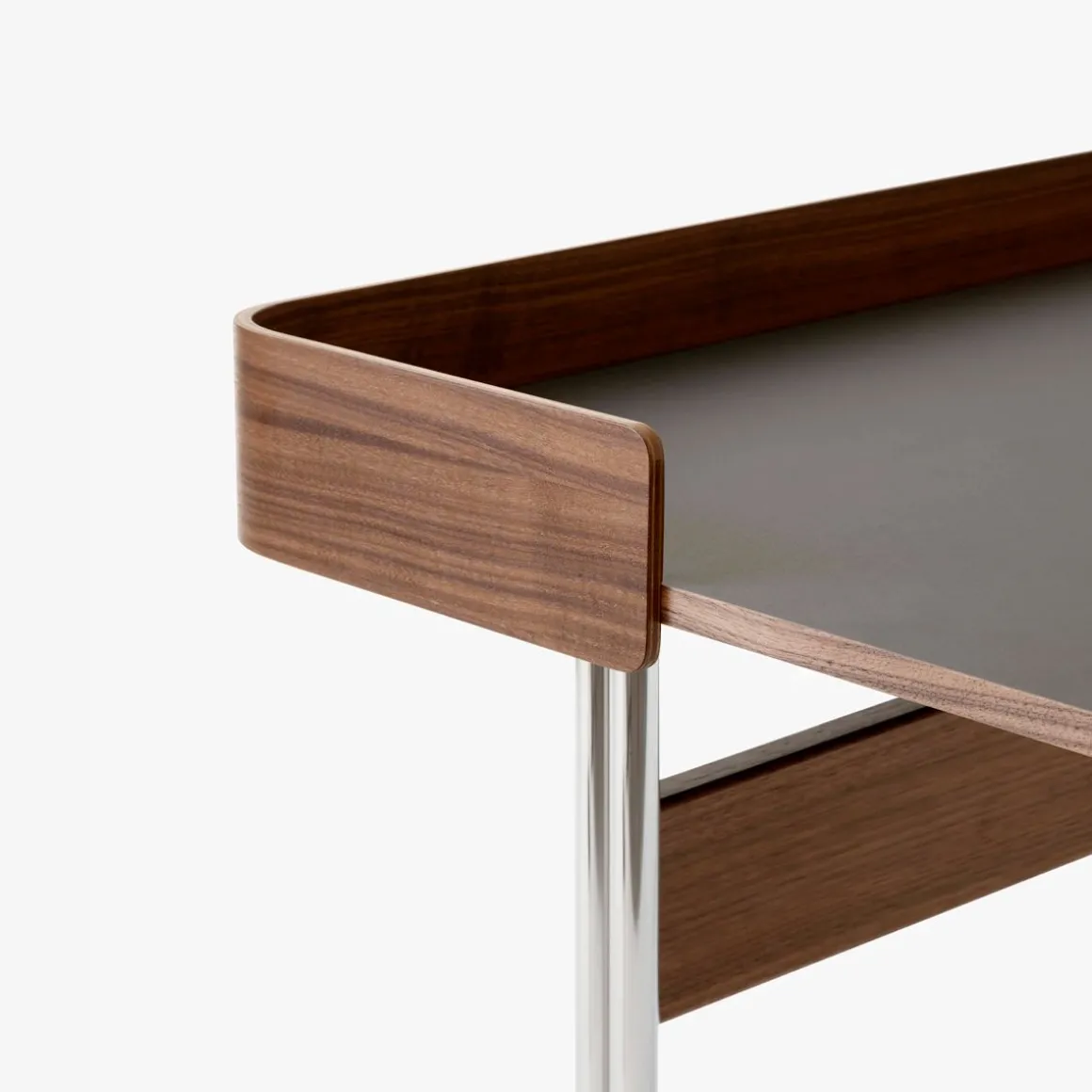 Matériaux : plateau laminé avec du linoléum et bords plaqués, pieds en acier pliés, panneau arrière fabriqué en placage pressé